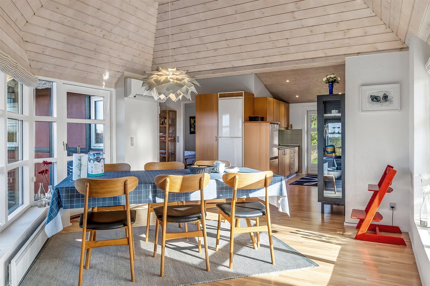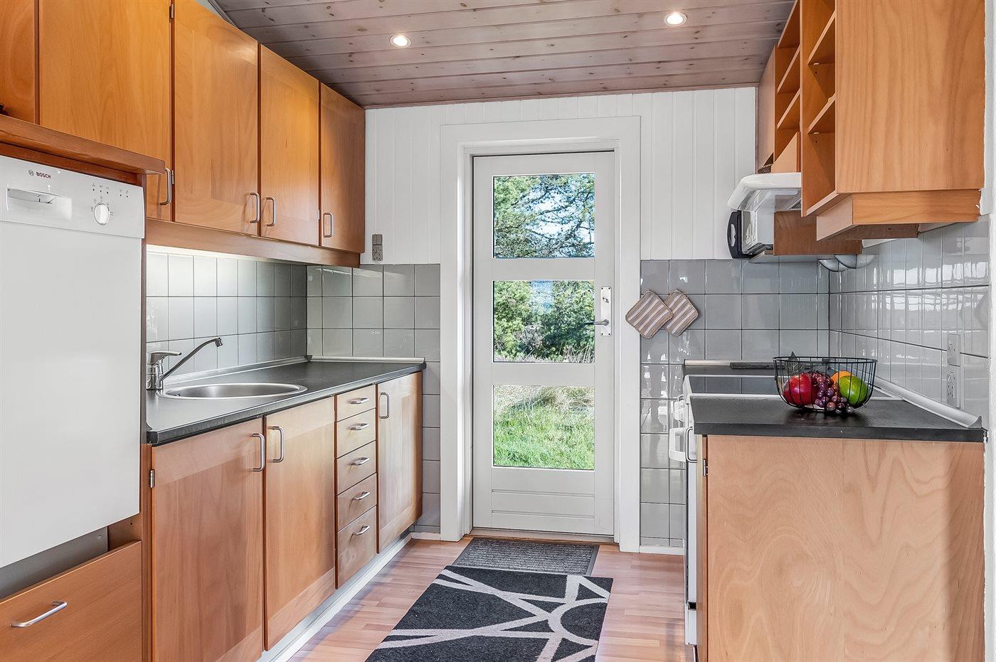 Køkkenet er udstyret med 1 køleskab. Der er 4 elkogeplader, varmluftovn, mikrobølgeovn samt opvaskemaskine.