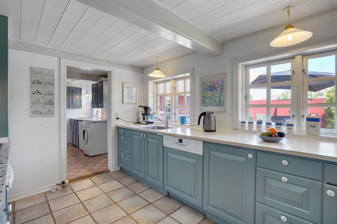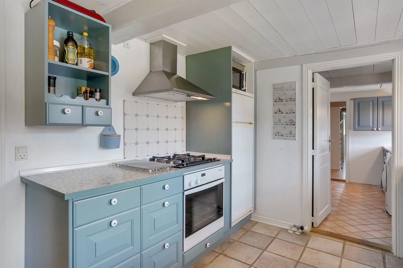 Køkkenet er udstyret med 2 køleskabe. Der er 4 gasblus, varmluftovn, mikrobølgeovn samt opvaskemaskine Der er gulvvarme i køkkenet.