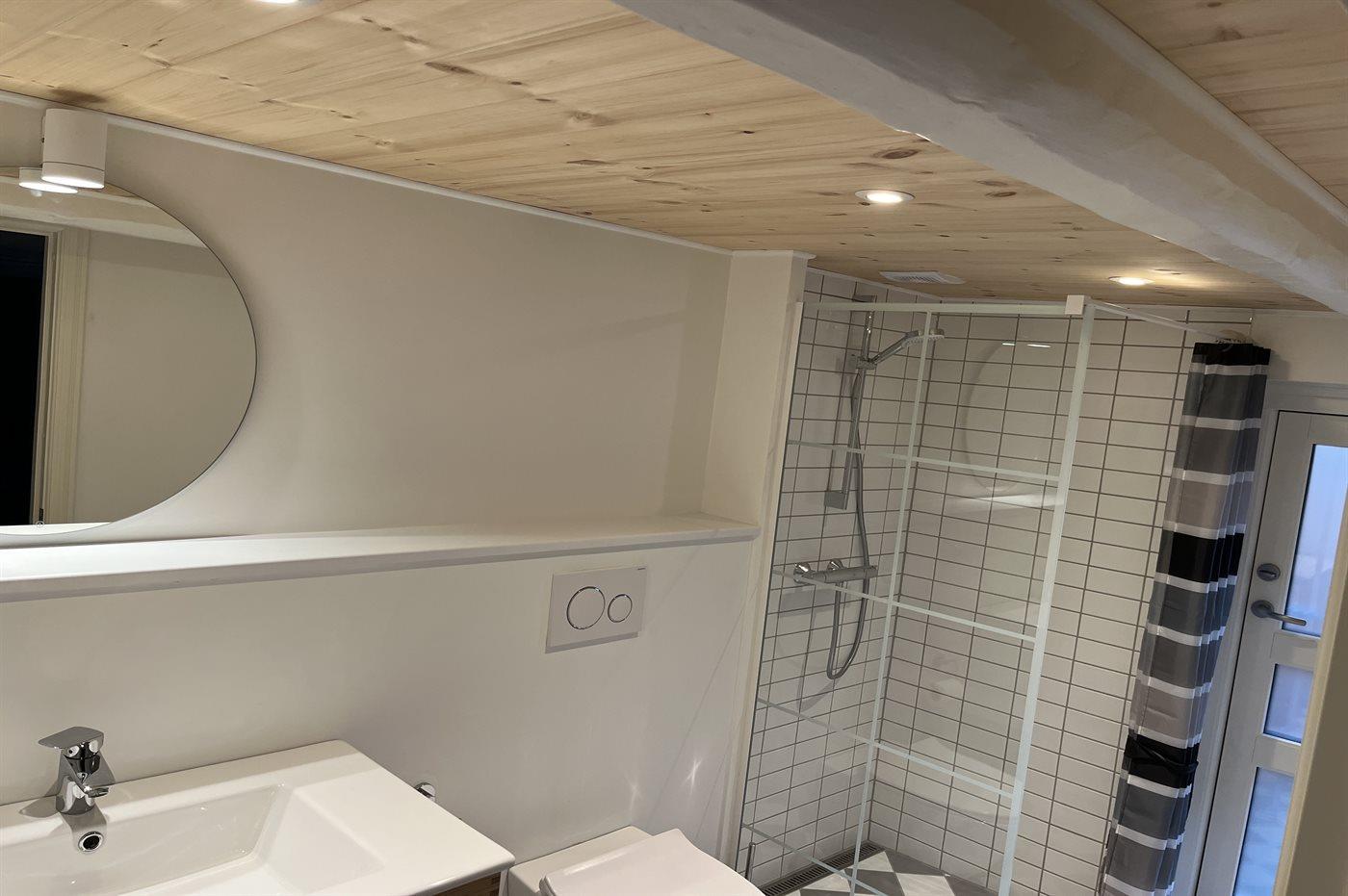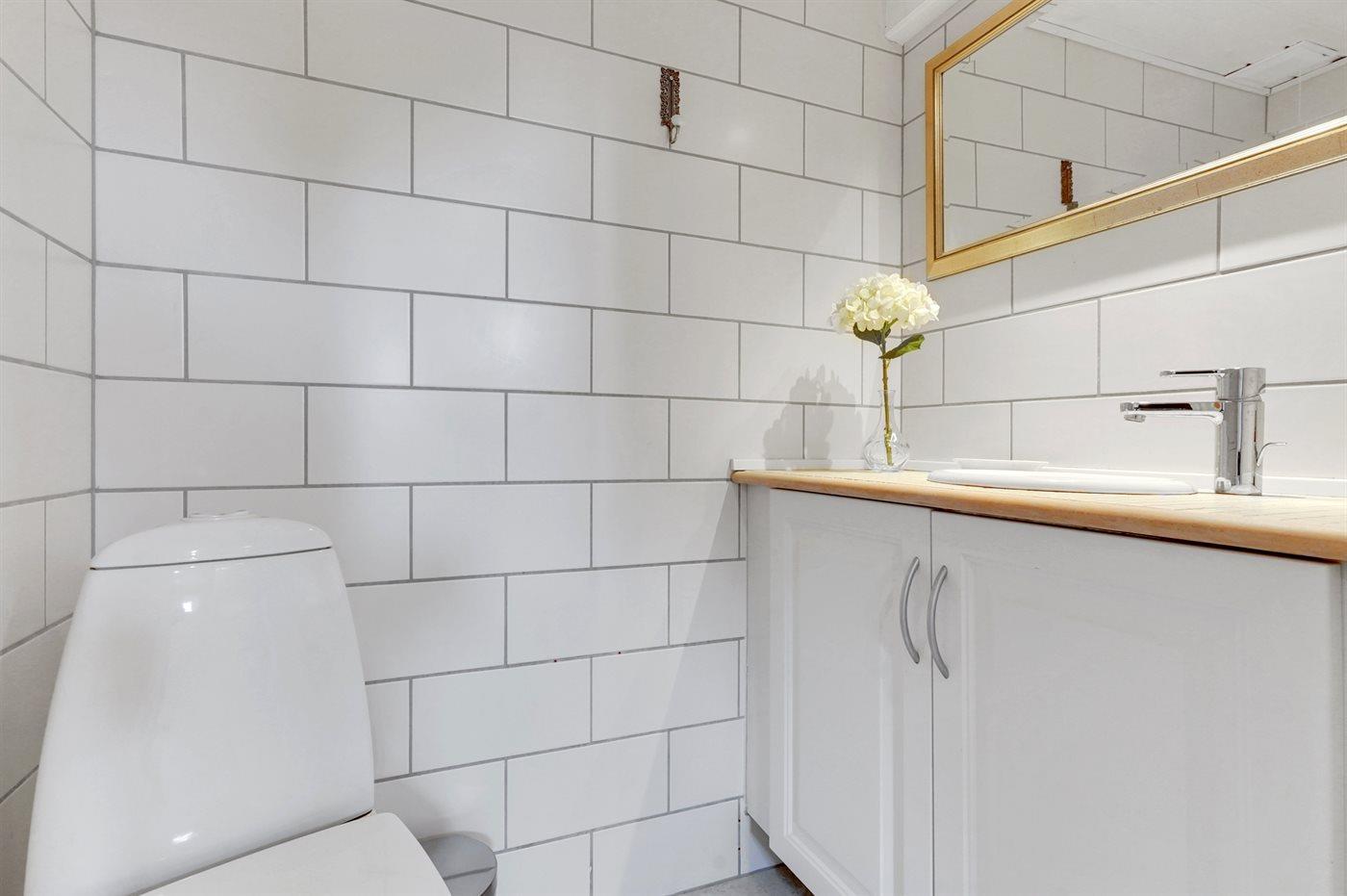 Der er 2 badeværelser med bruseniche og 3 toiletter, heraf 1 gæstetoilet. Der er gulvvarme på 1 badeværelse.