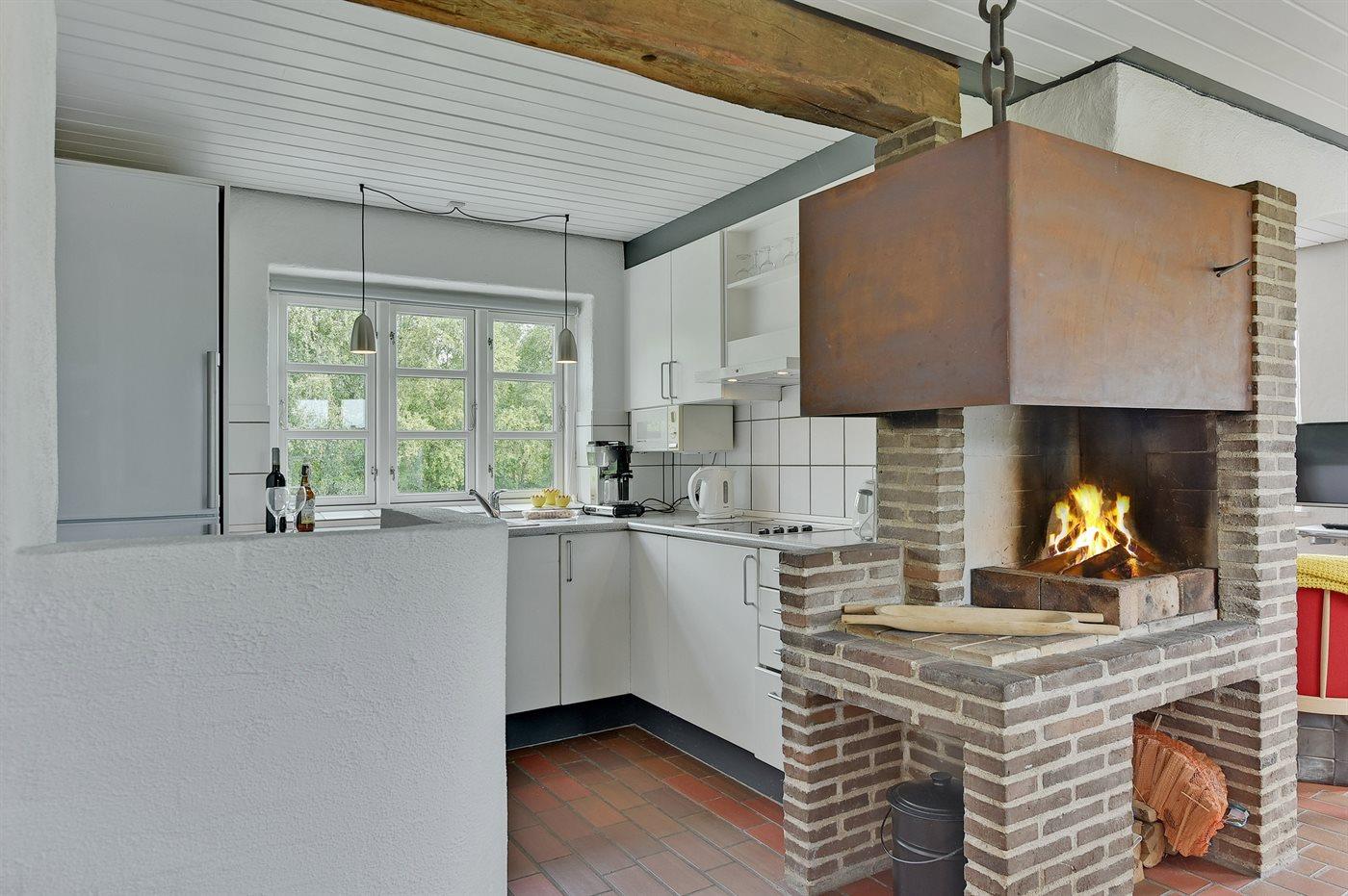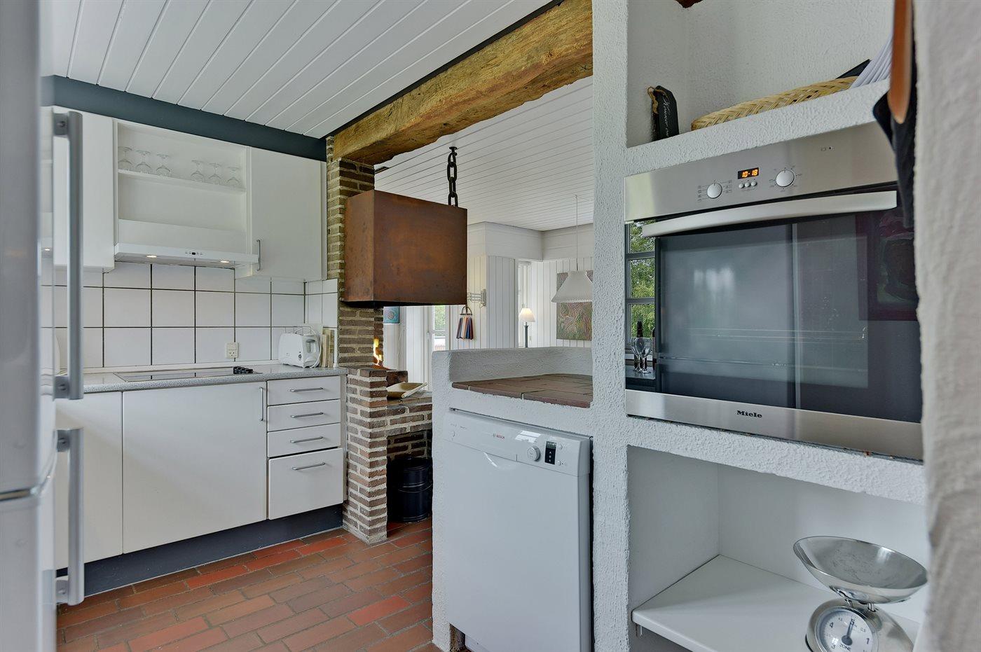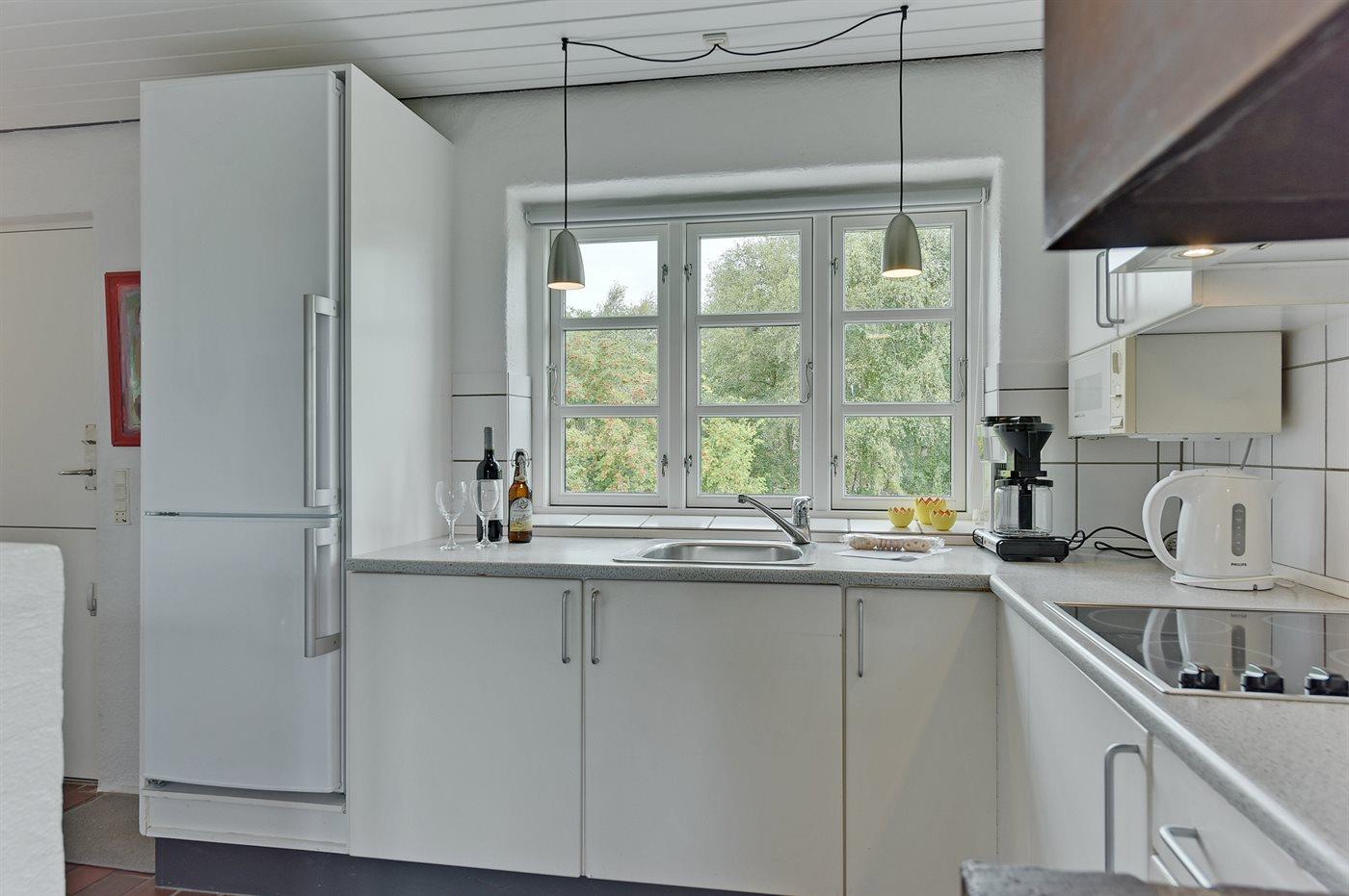 Køkkenet er udstyret med 1 køleskab. Der er 4 keramiske kogeplader, varmluftovn, mikrobølgeovn samt opvaskemaskine.
