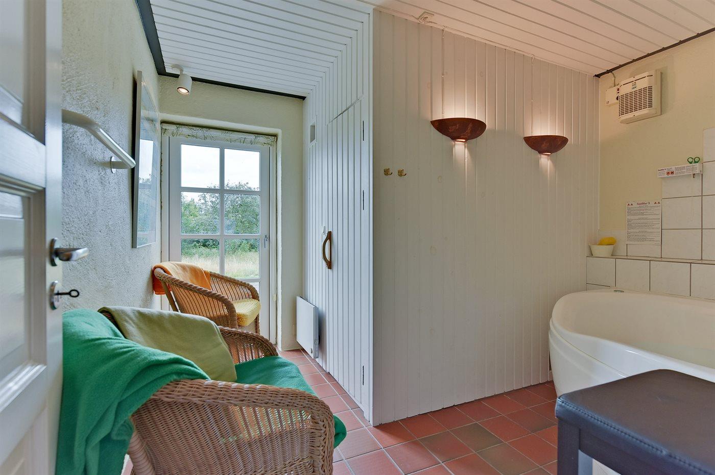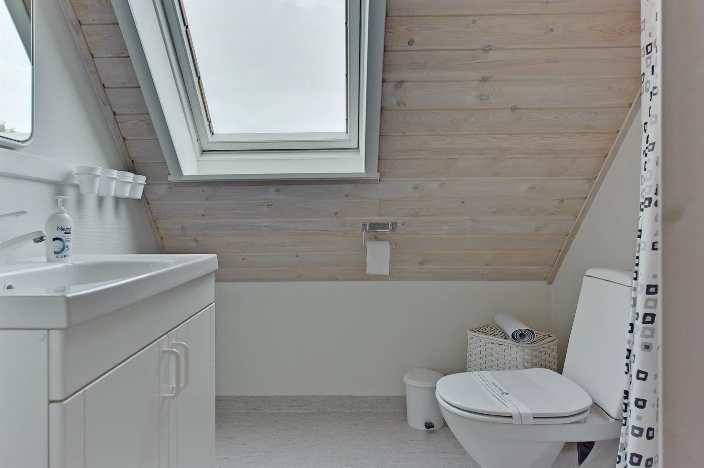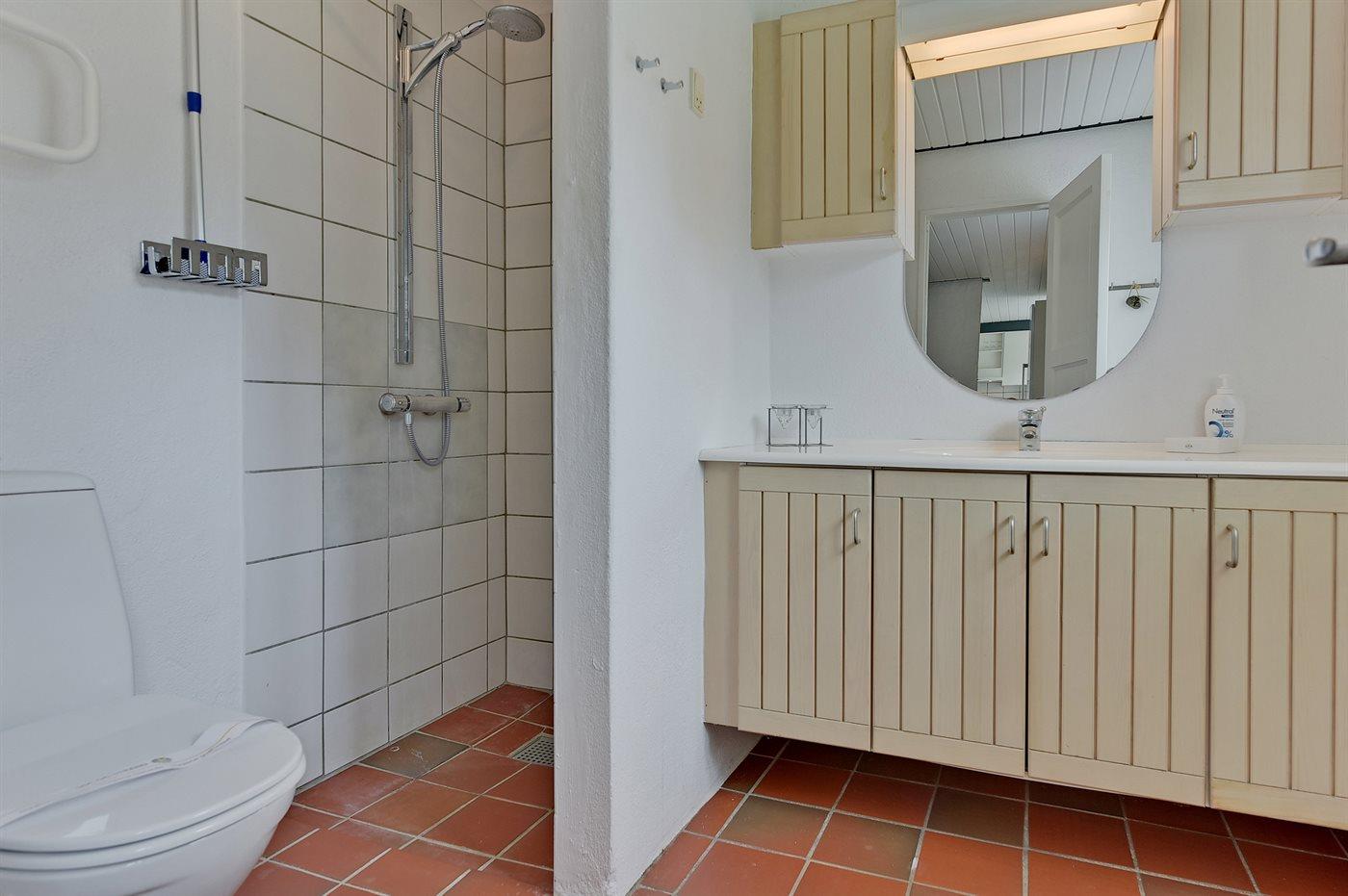 Der er 2 badeværelser med bruseniche og 2 toiletter. Der er gulvvarme på 1 badeværelse. I saunaen er der mulighed for afslapning.