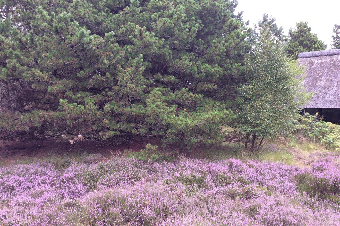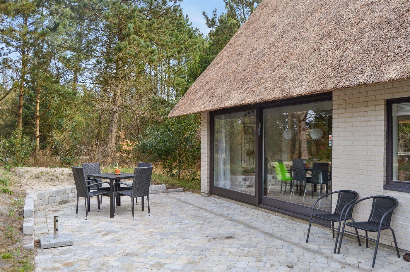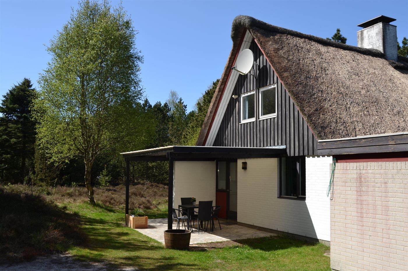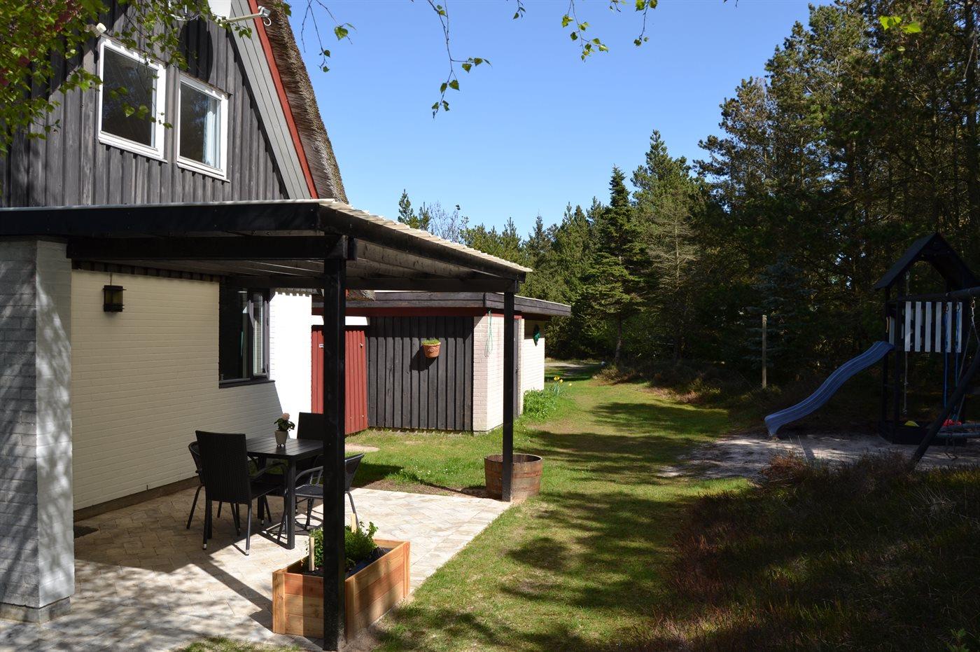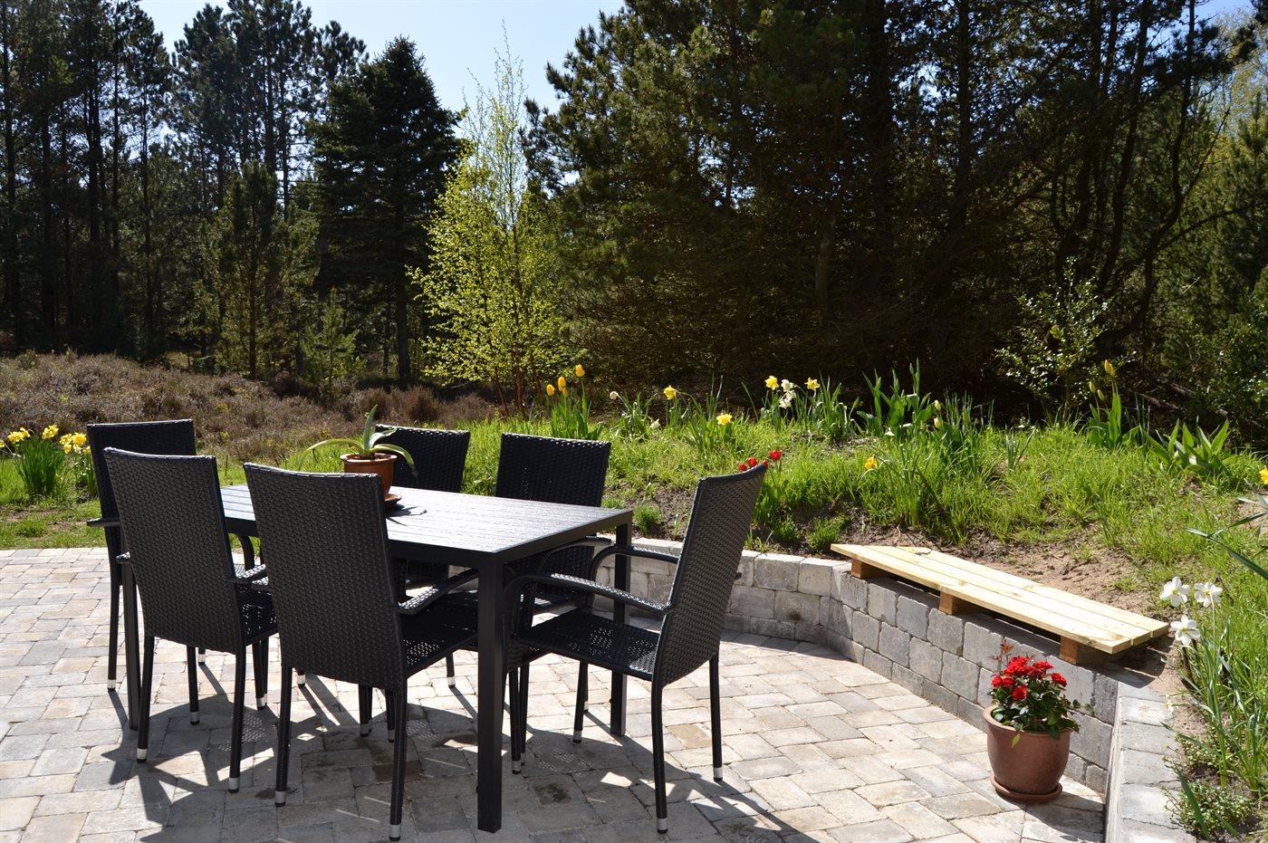 Til ferieboligen hører to dejlige terrasser med gode læ forhold. Fra køkkenet er det adgang til den overdækkede sydvendte terrasse på 14 m² som er i umiddelbar forbindelse med ejendommens lege område, ligesom der fra stuen, via det store skydedørs parti, er adgang til den åbne vestvendte terrasse på 20 m². Her kan i nyde solen det meste af dagen, men specielt aftenen solen er fantastisk på dette sted. Fra terrassen er der udsigt over ferieboligens naturgrund, der er enestående smukt når lyngen blomstrer i sensommeren.
