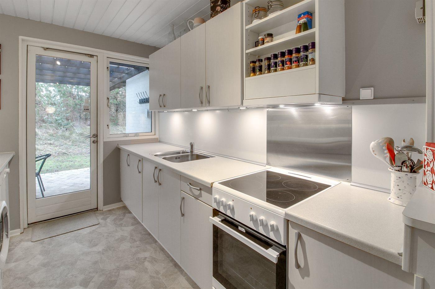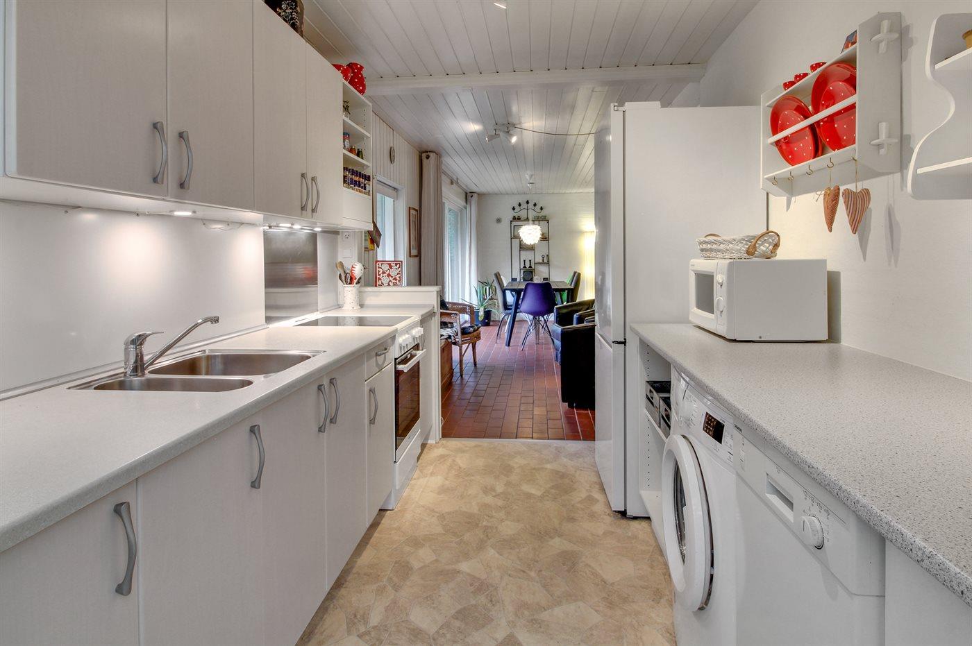 Køkkenet er udstyret med køleskab og fryser med en kapacitet på 100 liter, komfur, mikrobølgeovn, opvaskemaskine samt vaskemaskine.