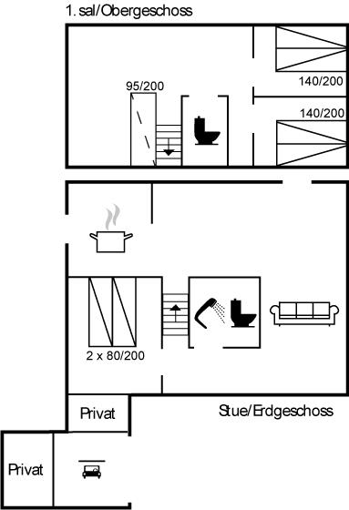 Ferieboligen egner sig til 7 personer samt 1 barn op til 3 år. Der er i alt 3 soveværelser med dobbeltsenge samt 1 soveplads på sovesofa i den lille opholds stue på 1. sal. I soveværelset i stueplan er der desuden 1 stk. barneseng.