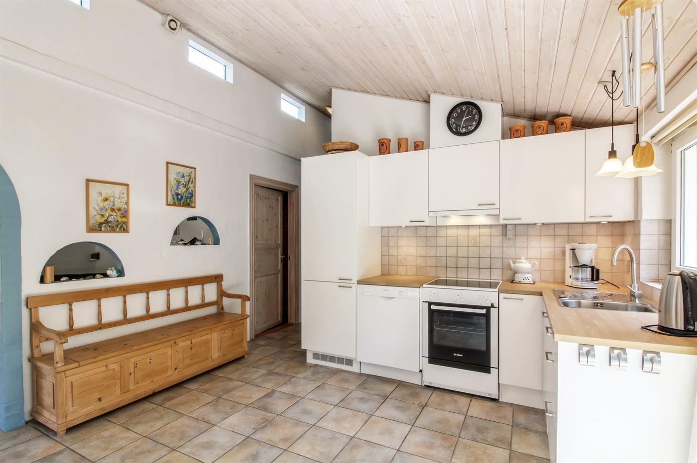 Køkkenet er udstyret med 1 køleskab. Der er 4 elkogeplader, bageovn, mikrobølgeovn samt opvaskemaskine.