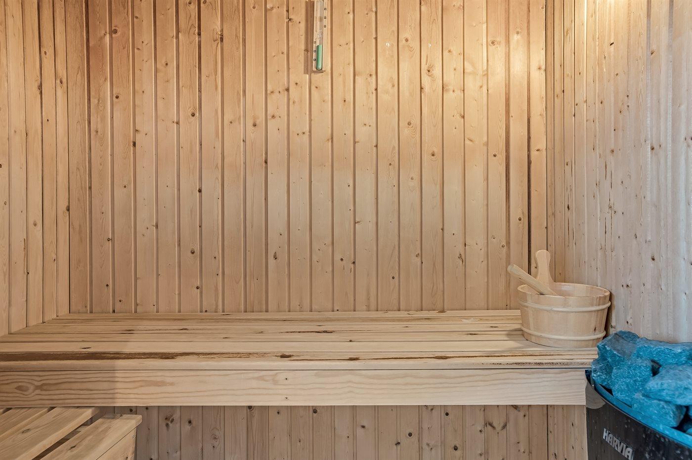 Der er 2 badeværelser med bruseniche og 2 toiletter. Der er gulvvarme på 1 badeværelse. I saunaen er der mulighed for afslapning.