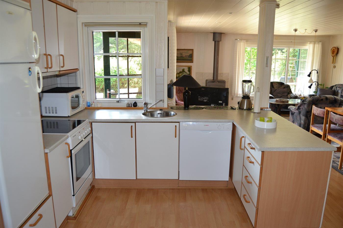 Køkkenet er udstyret med 1 køleskab. Der er 4 elkogeplader, bageovn, mikrobølgeovn samt opvaskemaskine.