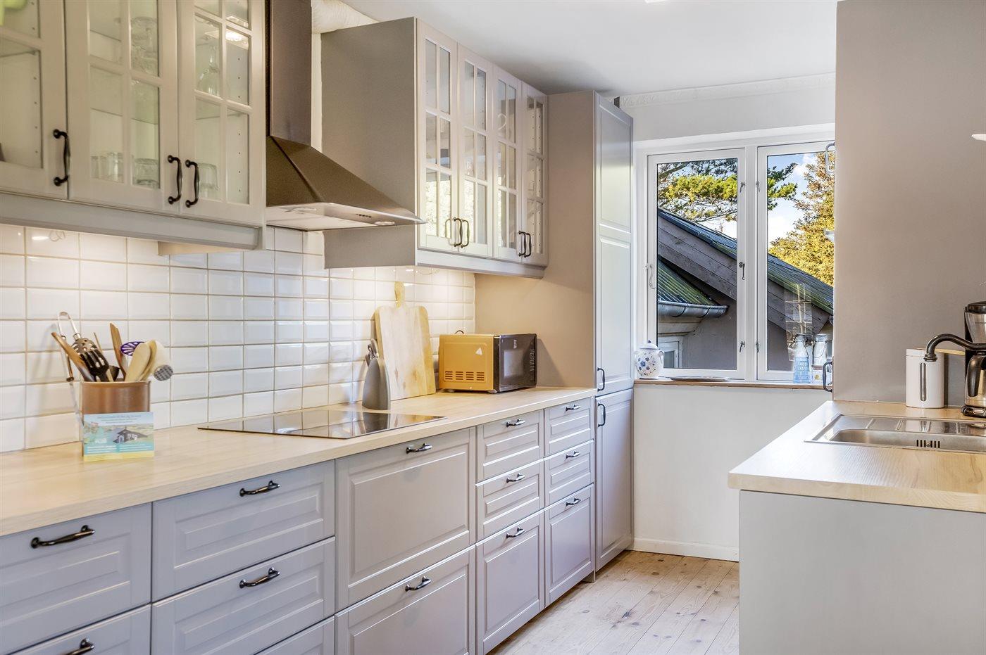 Køkkenet er udstyret med 1 køleskab. Der er 4 keramiske kogeplader, varmluftovn, mikrobølgeovn samt opvaskemaskine.