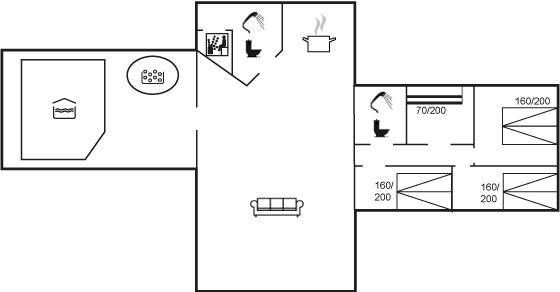 Der er i alt 4 soveværelser. Sovepladserne fordeler sig på: 6 sovepladser i dobbeltsenge. 2 sovepladser i køjeseng. Derudover er der 1 stk. barneseng.