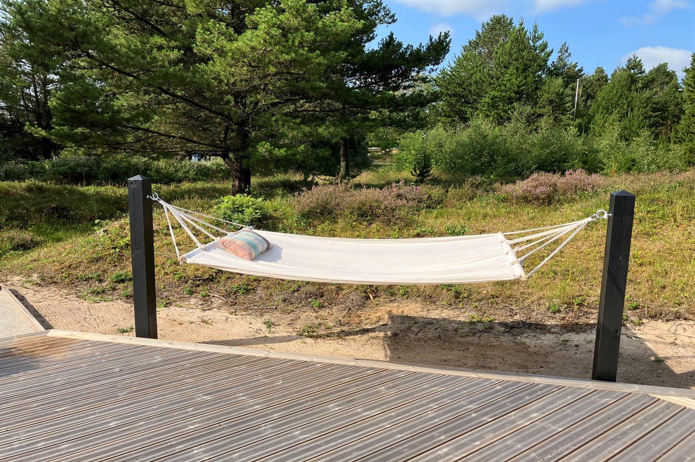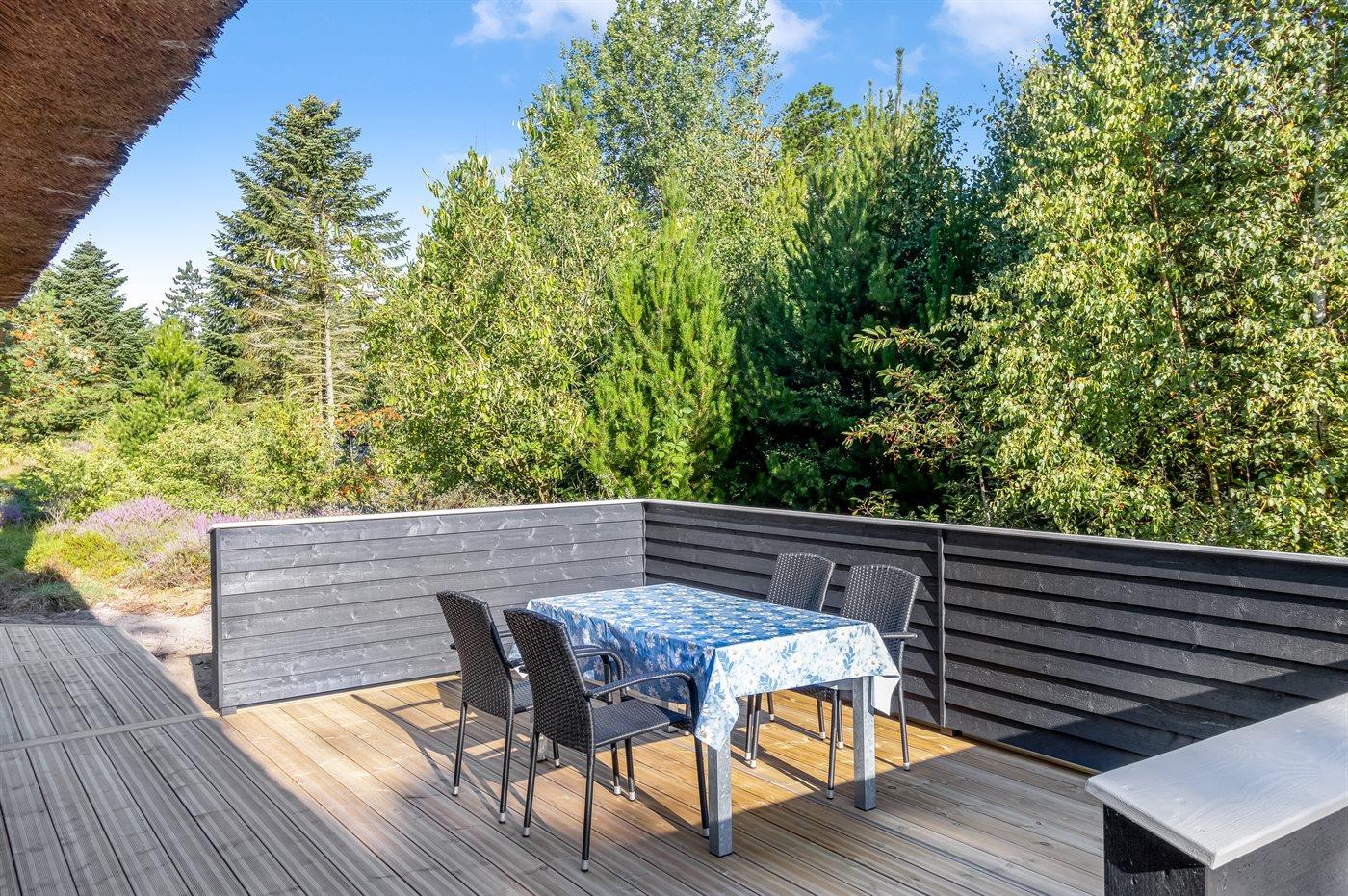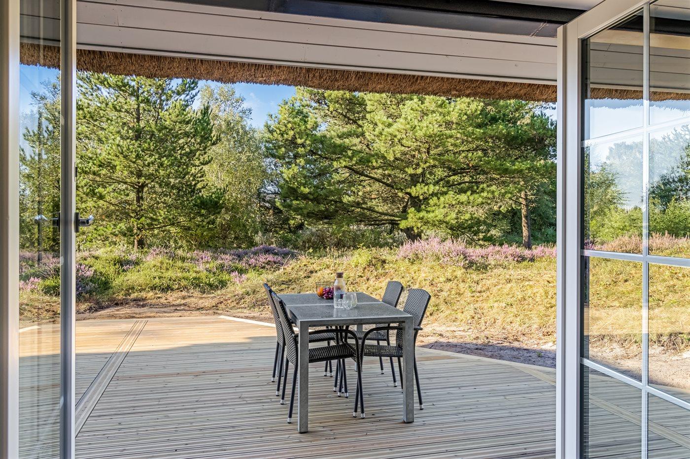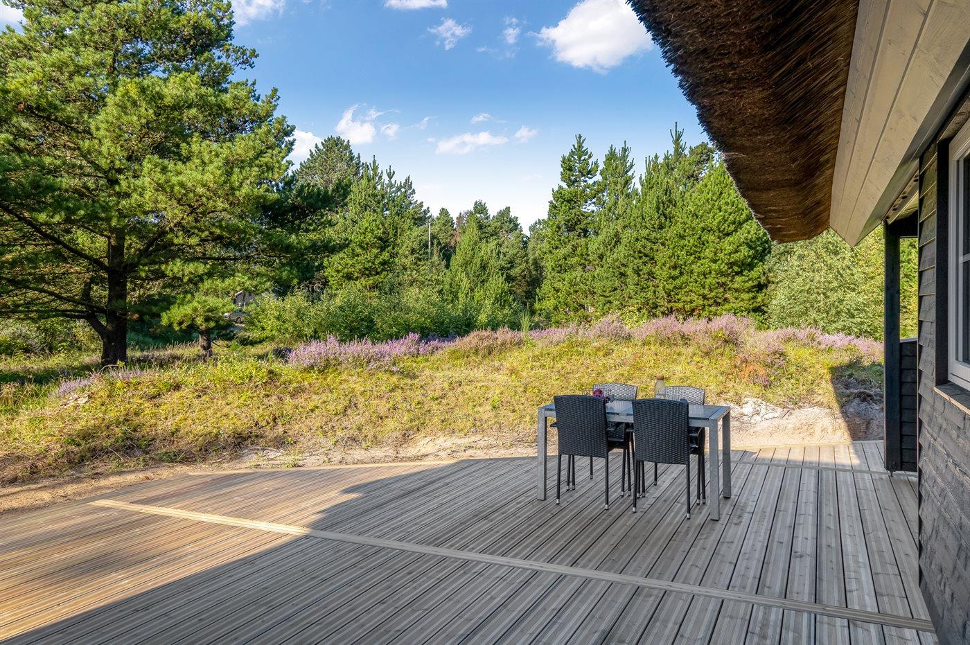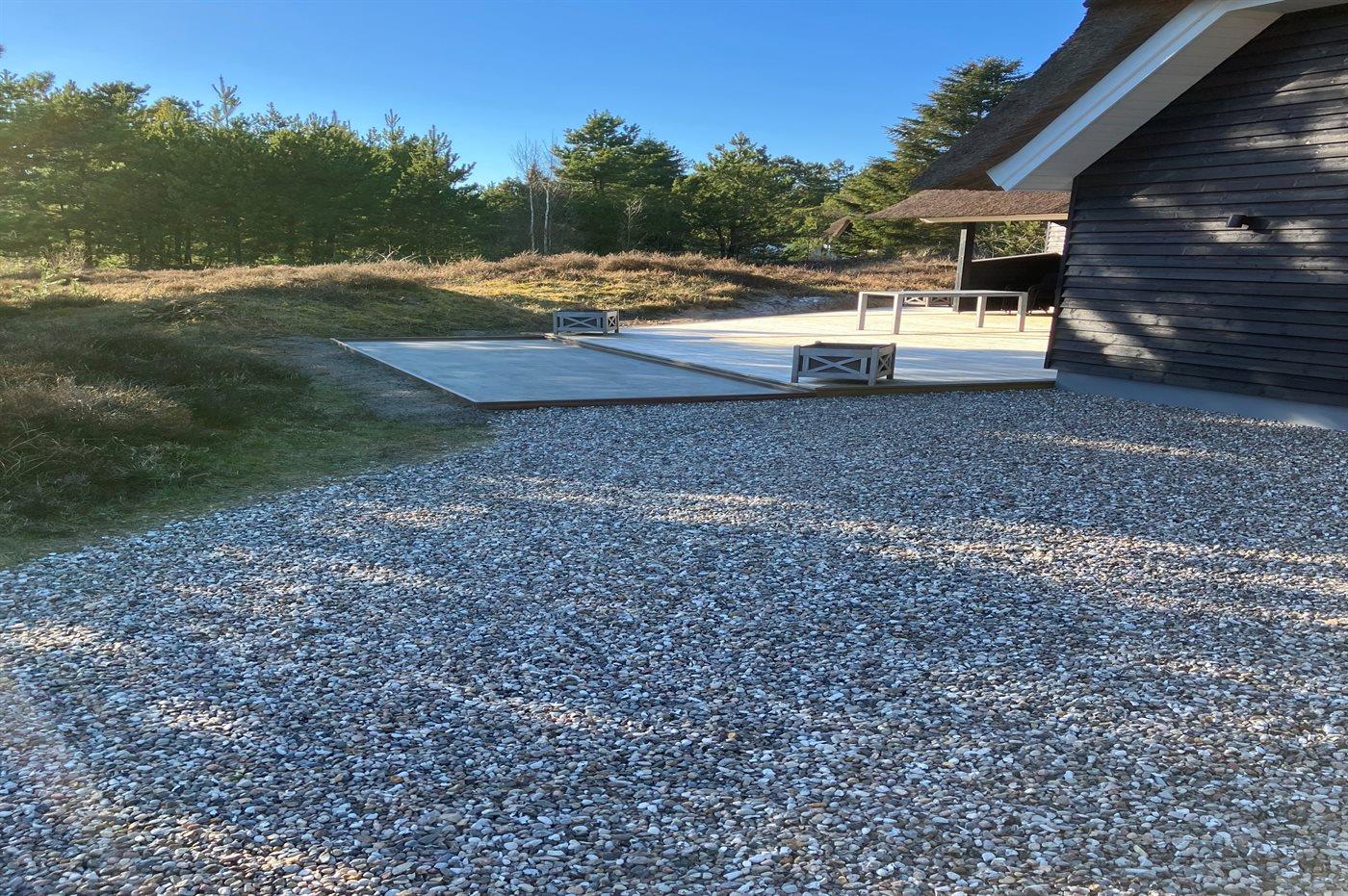Ferieboligen er beliggende på en 2500 m² stor naturgrund. Der er 3500 m til havet. Der er 800 m til Vadehavet. Nærmeste forretning er beliggende i en afstand af 400 m. Til ferieboligen hører 130 m² terrasseareal. Desuden er der overdækket terrasse. Der er installeret stik til opladning af elbil. Parkering ved ferieboligen.