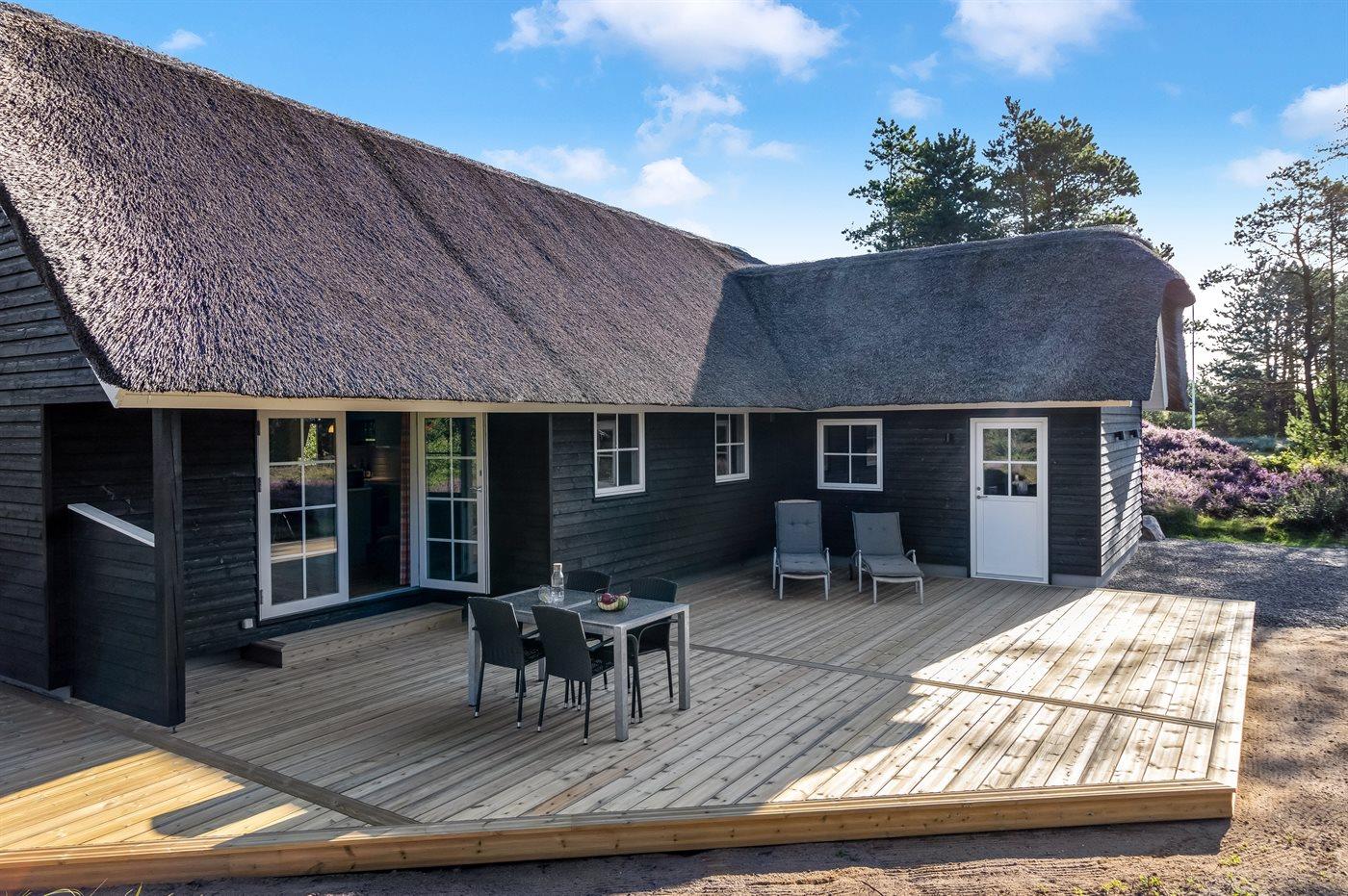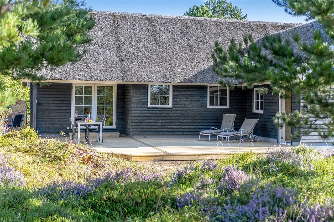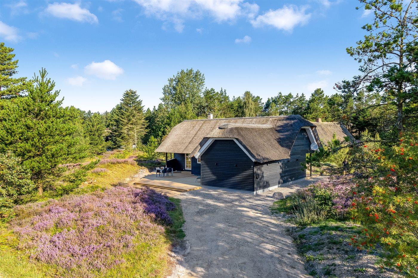 Dette hyggelige sommerhus med stråtag ligger på en flot naturgrund med træer i det skønne hedelandskab ved Kongsmark.
