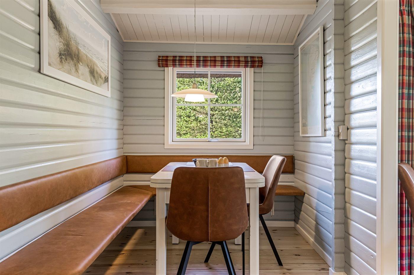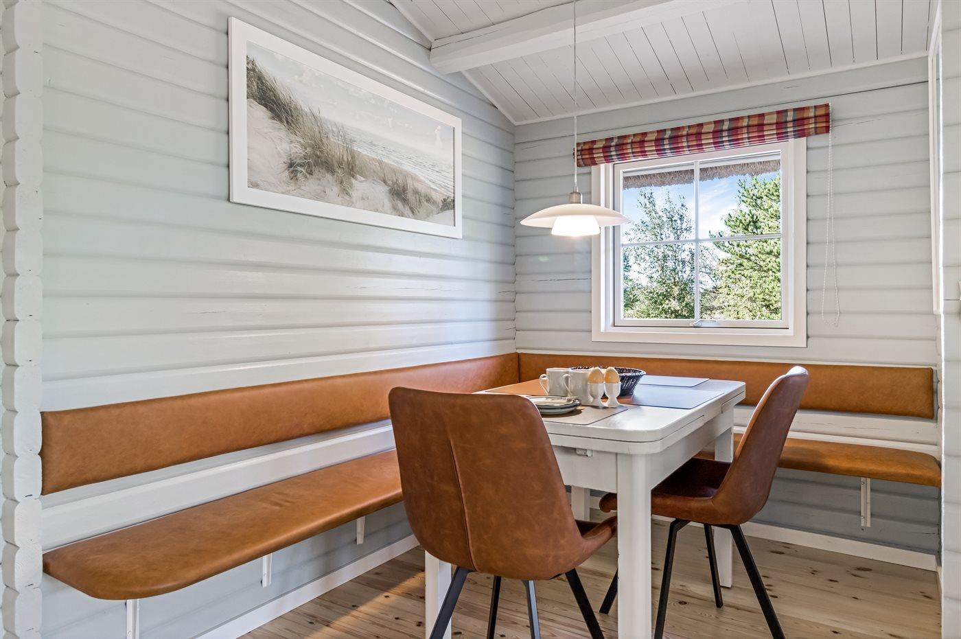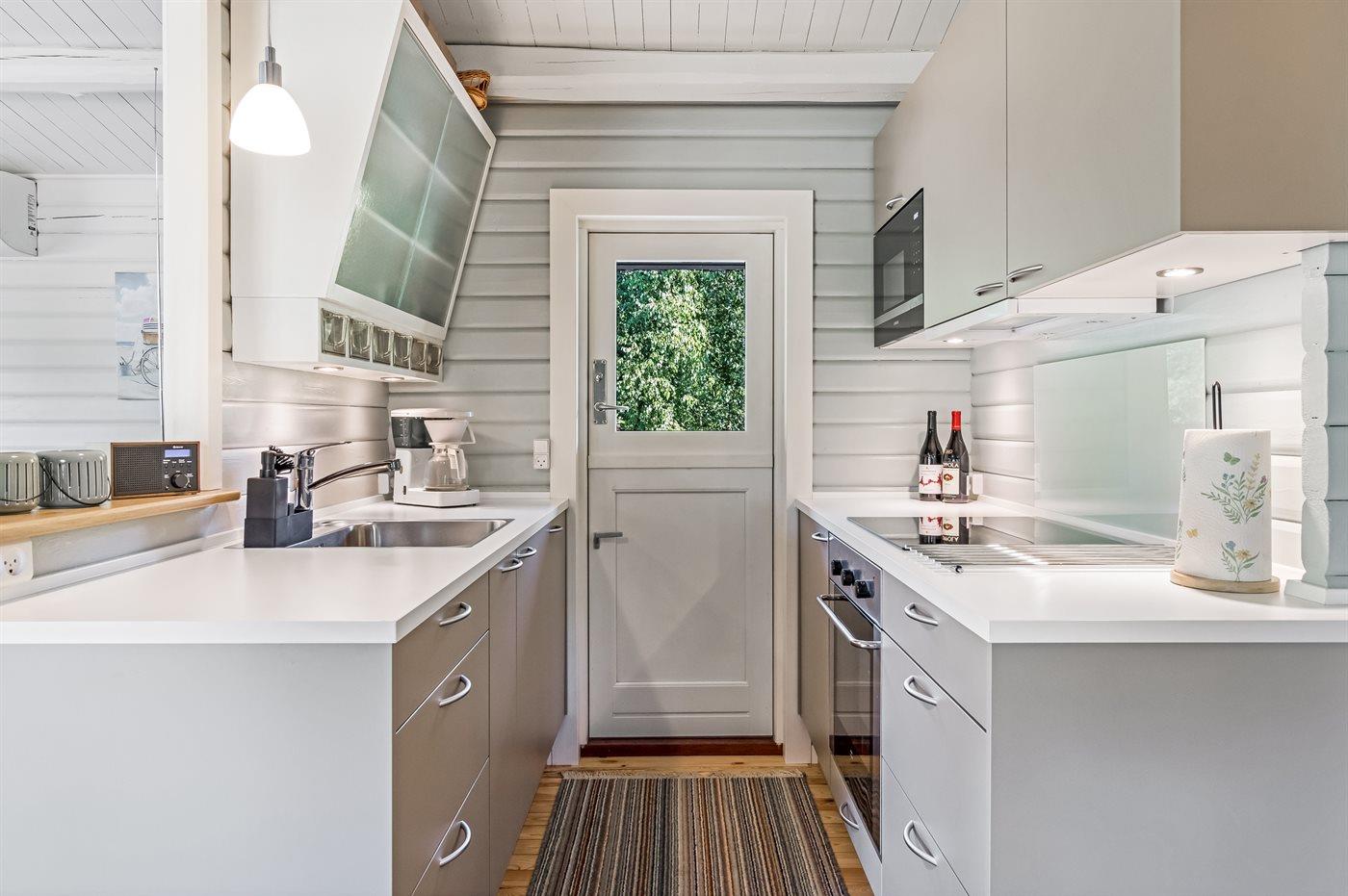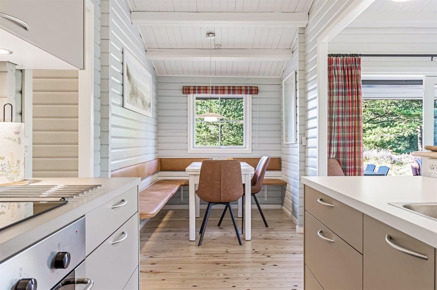 Køkkenet er udstyret med 1 køleskab. Der er 4 keramiske kogeplader, bageovn, mikrobølgeovn samt opvaskemaskine.