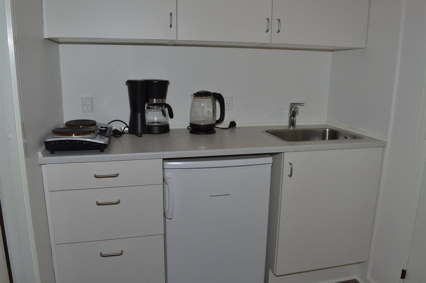 Køkkenet er udstyret med 1 køleskab. Der er 2 elkogeplader, miniovn.