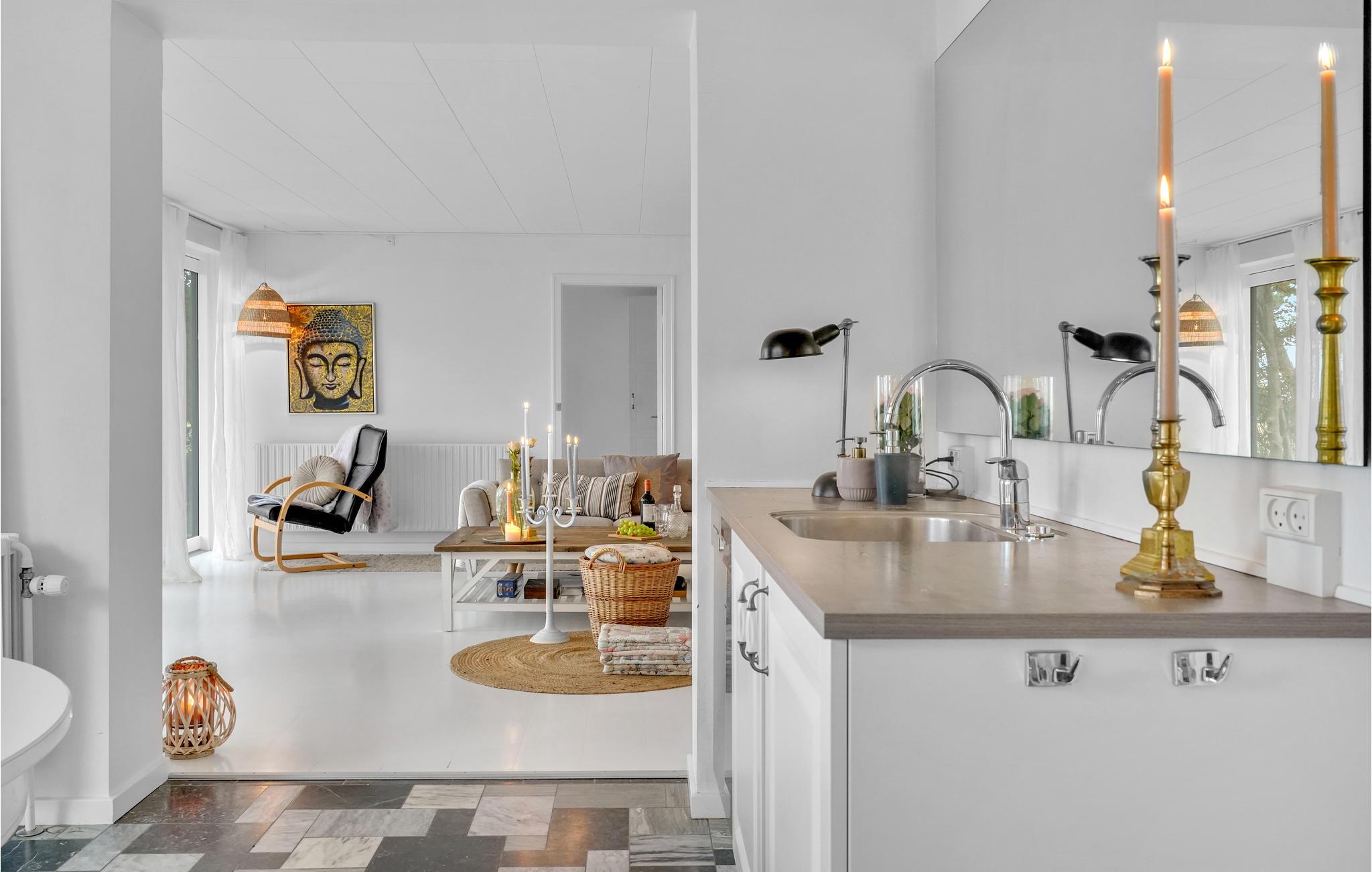 Enden af haven trapper ned til en dejlig badestrand, så slyng håndklædet over armen og snup en dukkert. Huset indeholder et dejligt køkken med udgang til en åben terrasse, en skøn stue også med direkte udgang til dejlig åben terrasse, badeværelse, bryggers med både vaskemaskine og tørretumbler, samt hele 3 gode værelser.