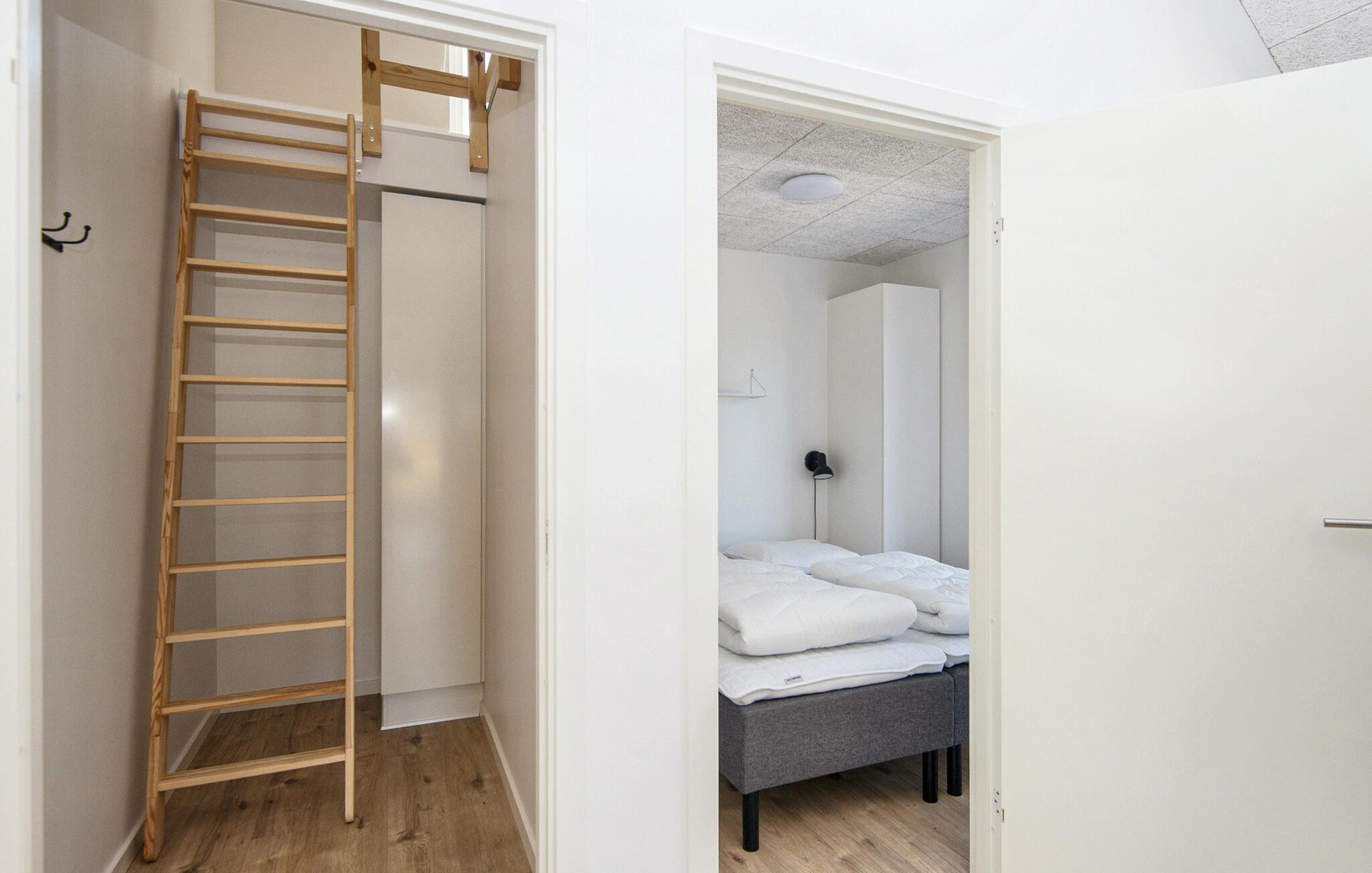 Huset rummer to soveværelser og to individuelle påklædningsrum i stueplan, begge med direkte adgang til en hems med sengepladser – perfekt til familier eller grupper, der ønsker privatliv og fleksible sovepladser.