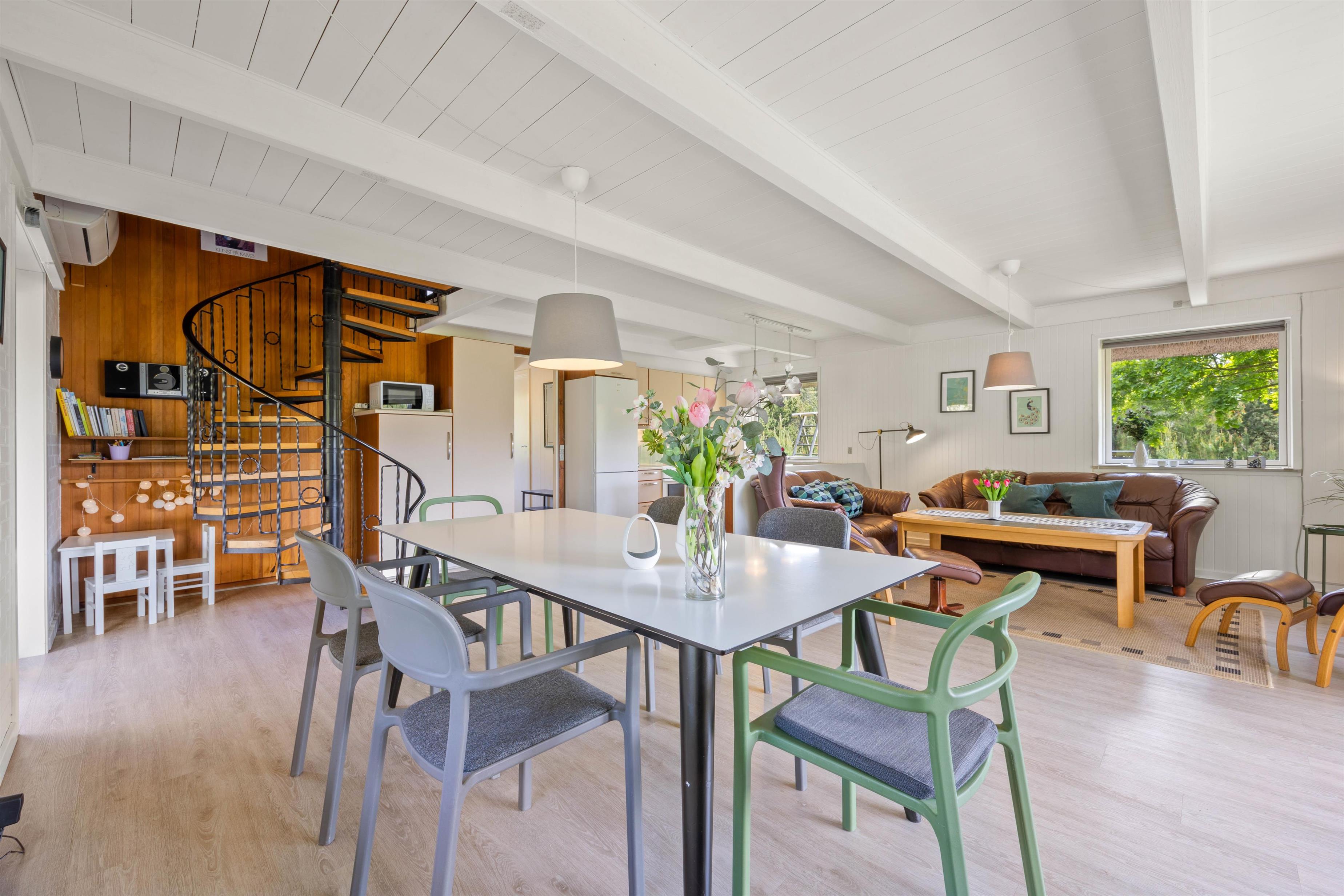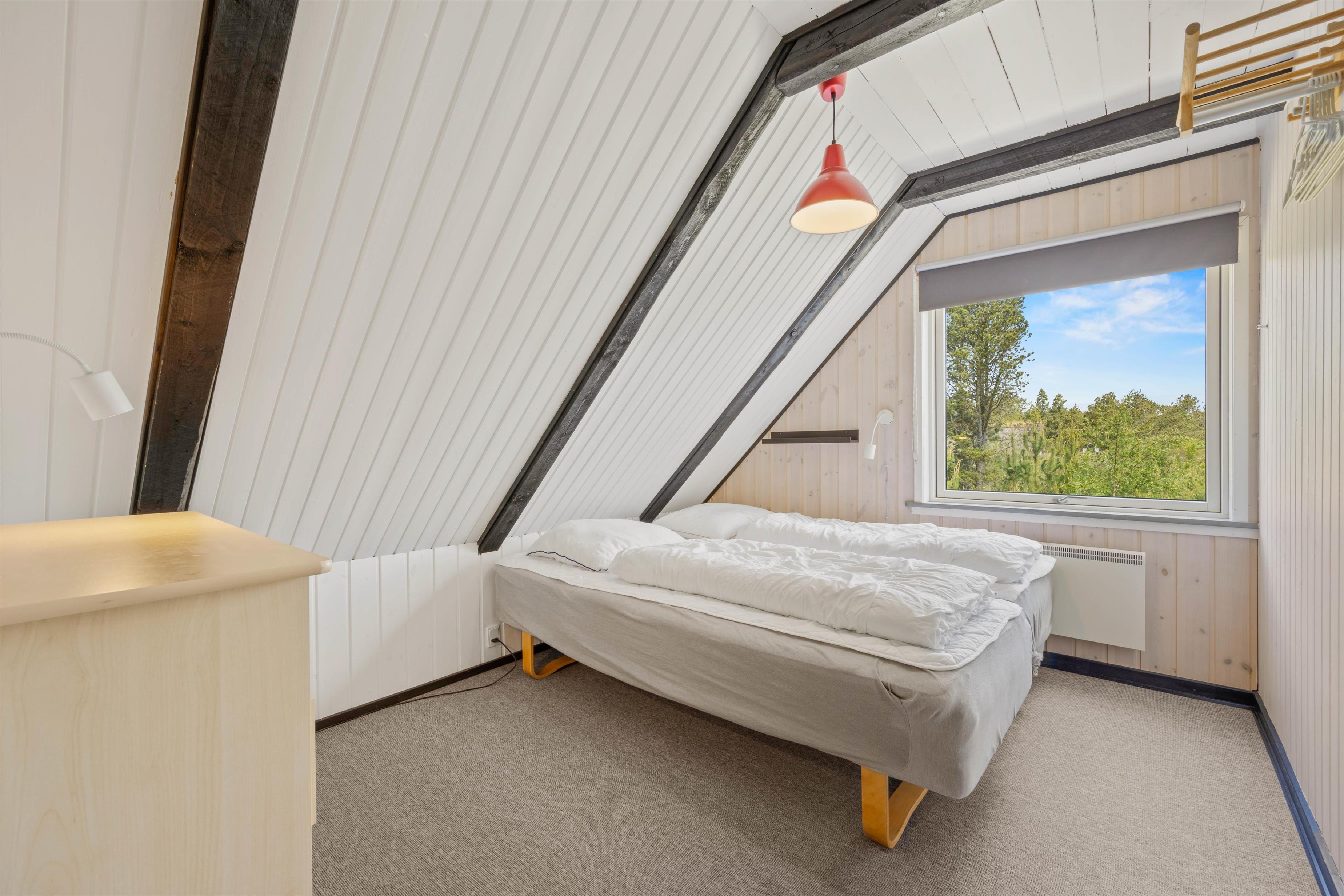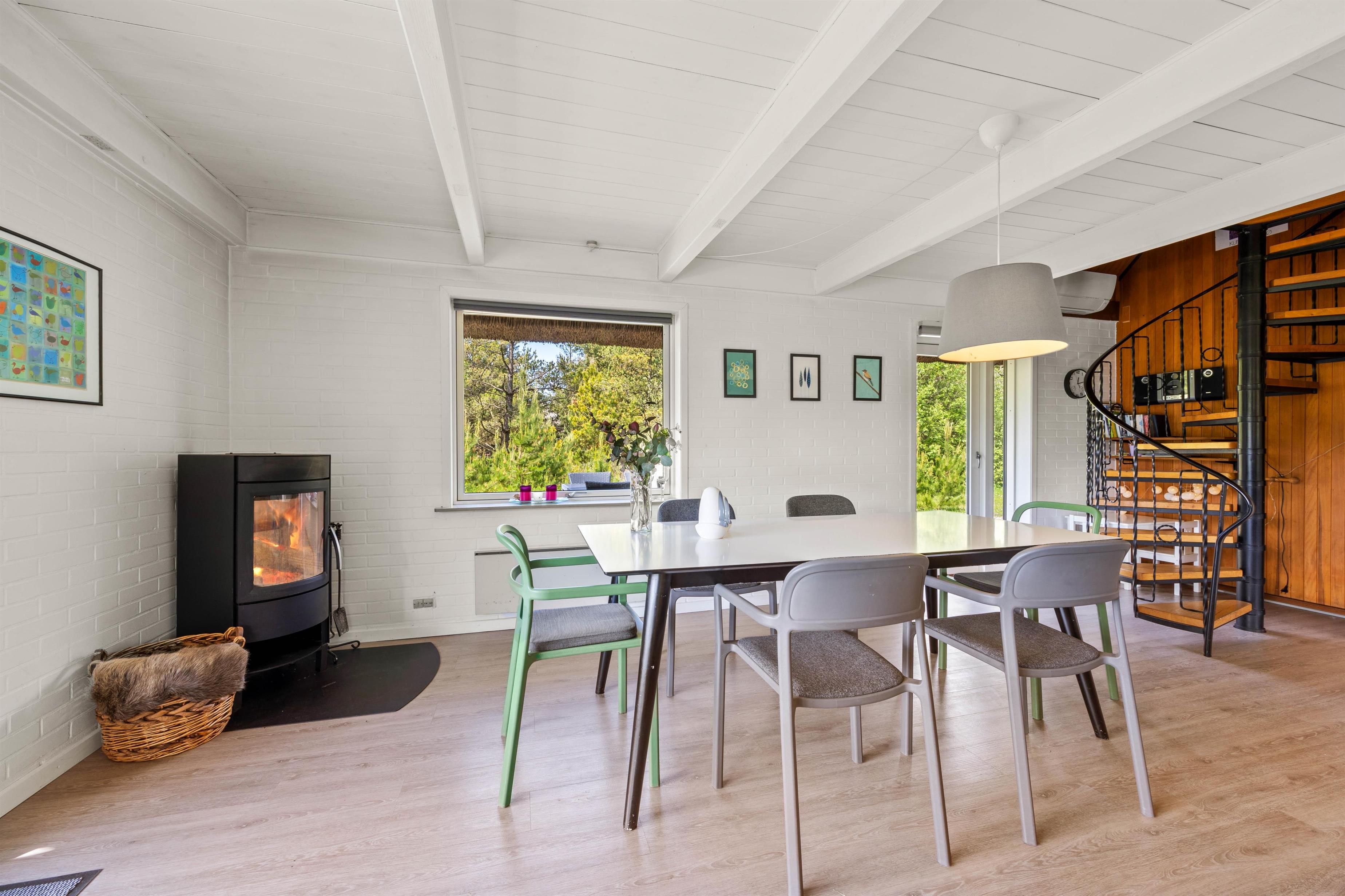 Sommerhusets hjerte er stuen med spiseplads og køkken i ét. Her kan I tilbringe mange hyggelige timer foran den knitrende ild i brændeovnen, især om aftenen eller på køligere dage. Er I til mere aktivitet – eller skal I have afgjort en konkurrence, er der et poolbord til rådighed i aktivitetsrummet. De 4 soveværelser er alle indrettet med dobbeltsenge. Sovesofaen i det store værelse ovenpå giver plads til 2 personer ekstra. Der er også udgang til en bred altan, hvorfra I særligt kan nyde udsigten. Der er både et badeværelse og et gæstetoilet i feriehuset, begge med gulvvarme.