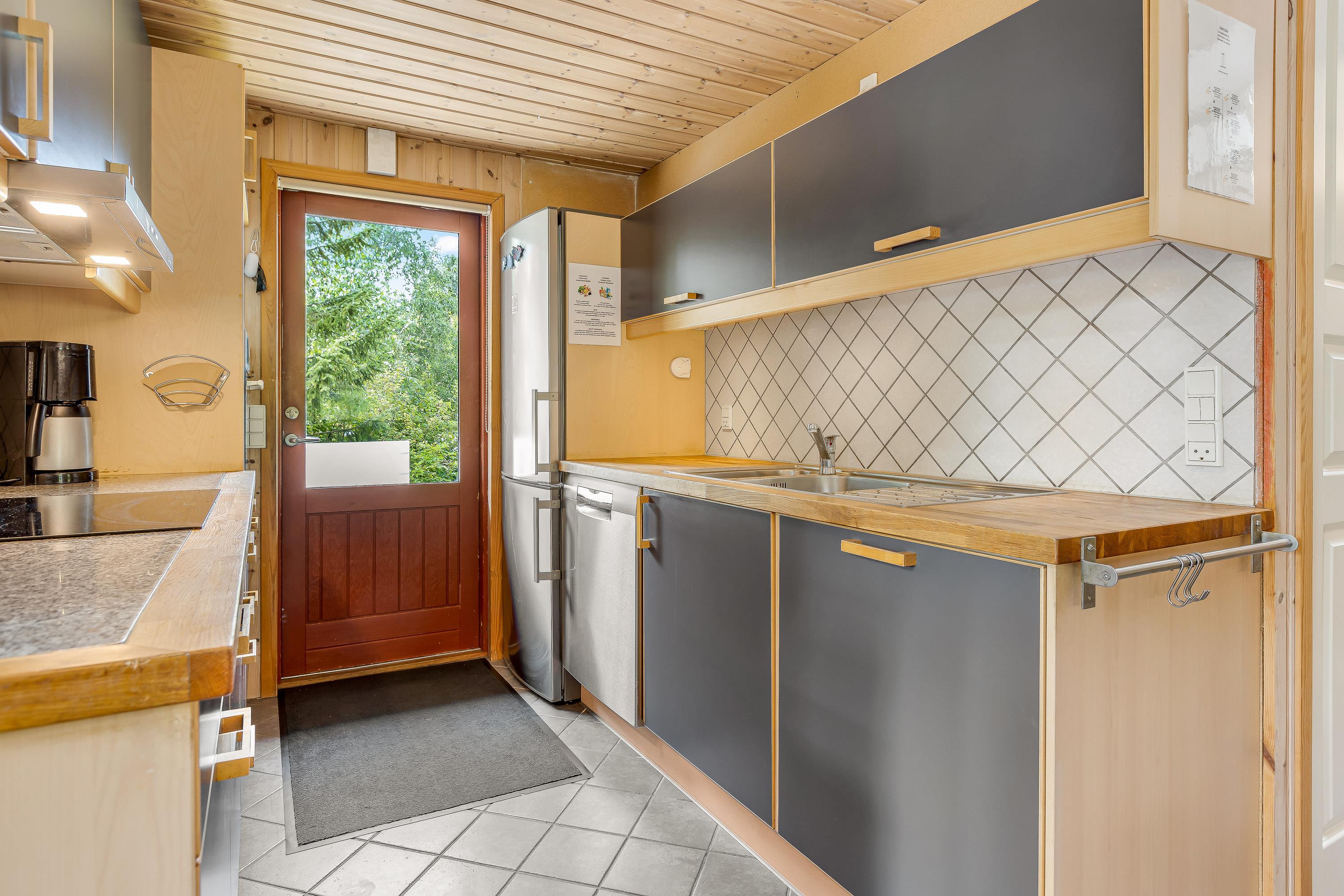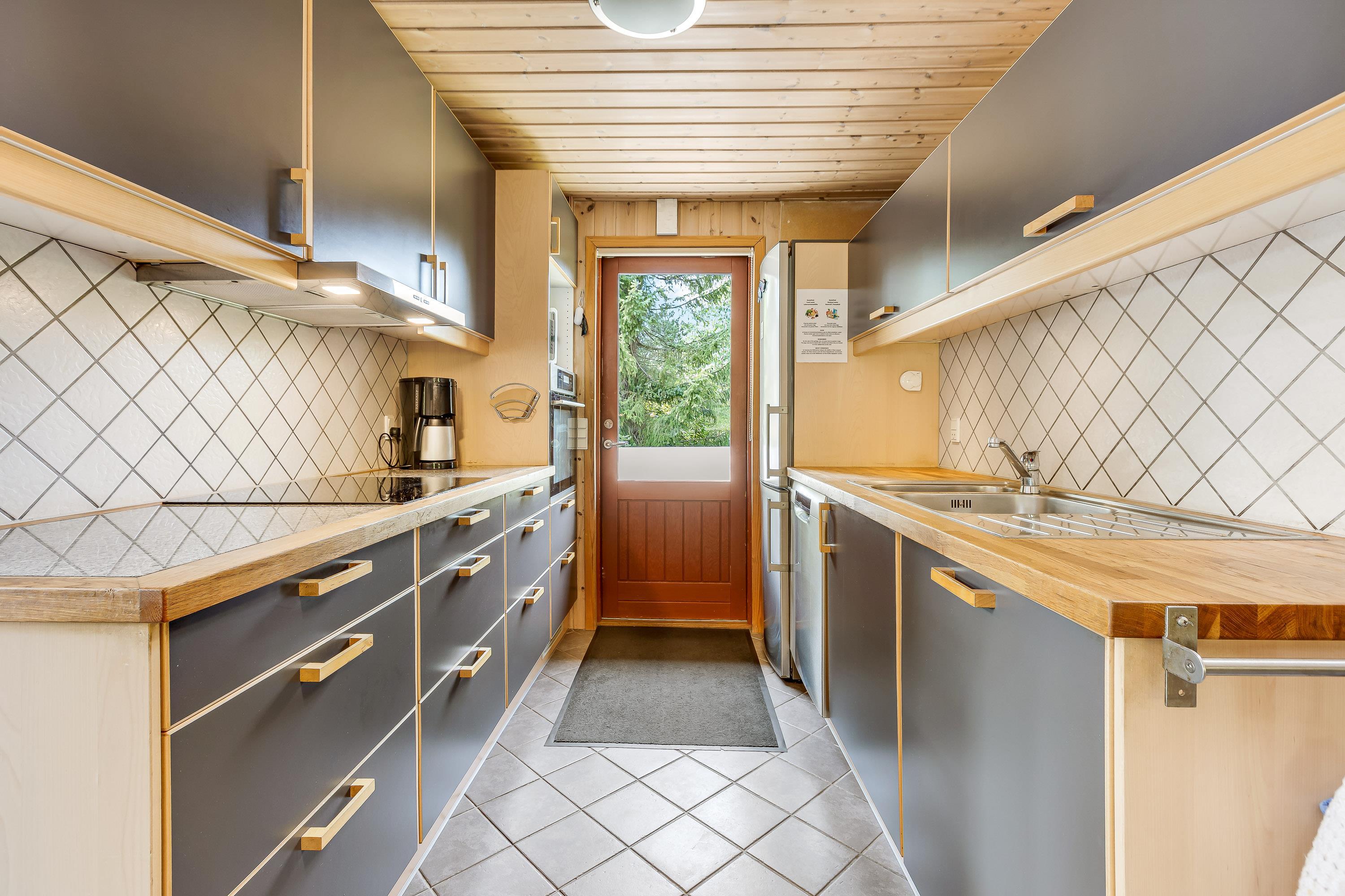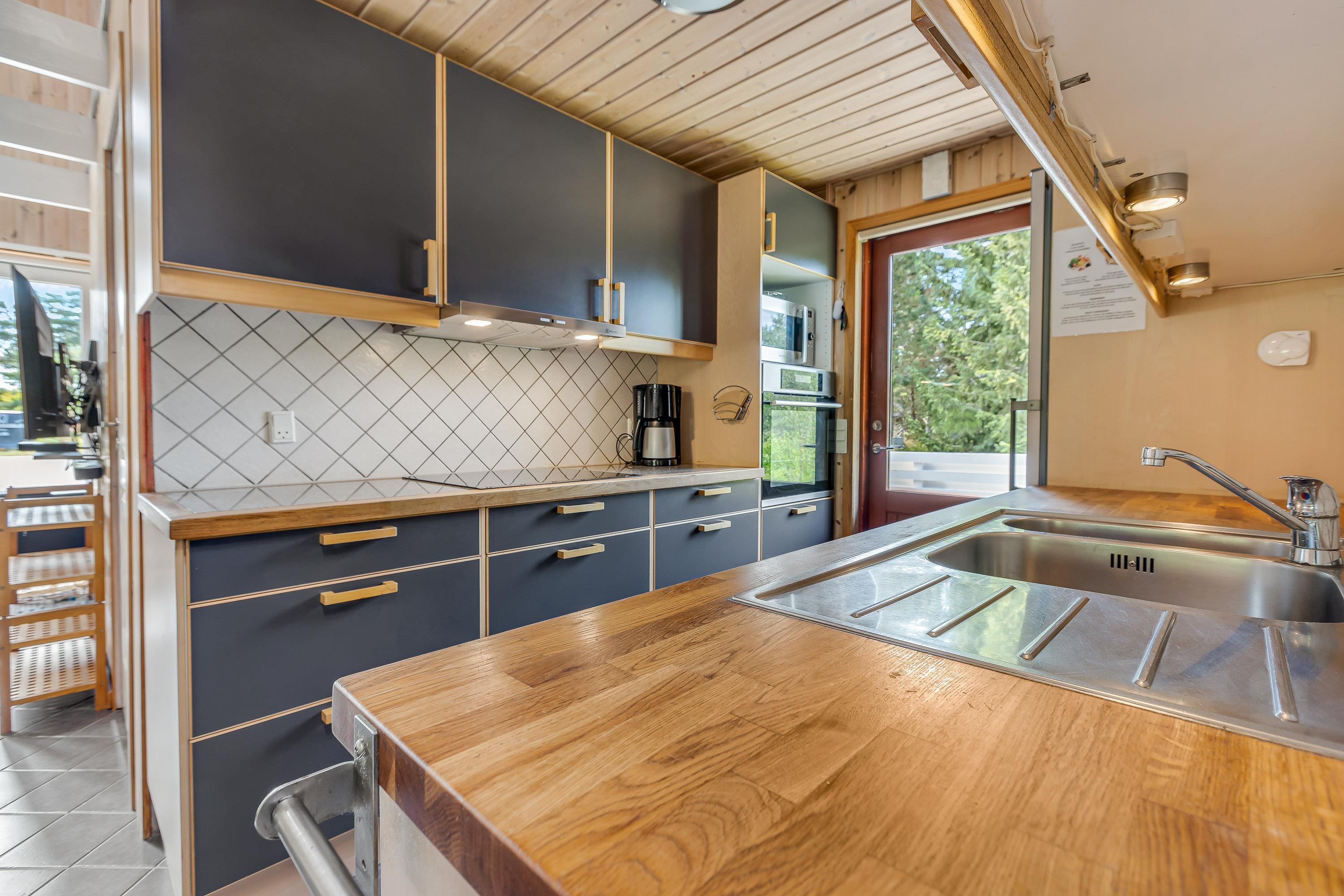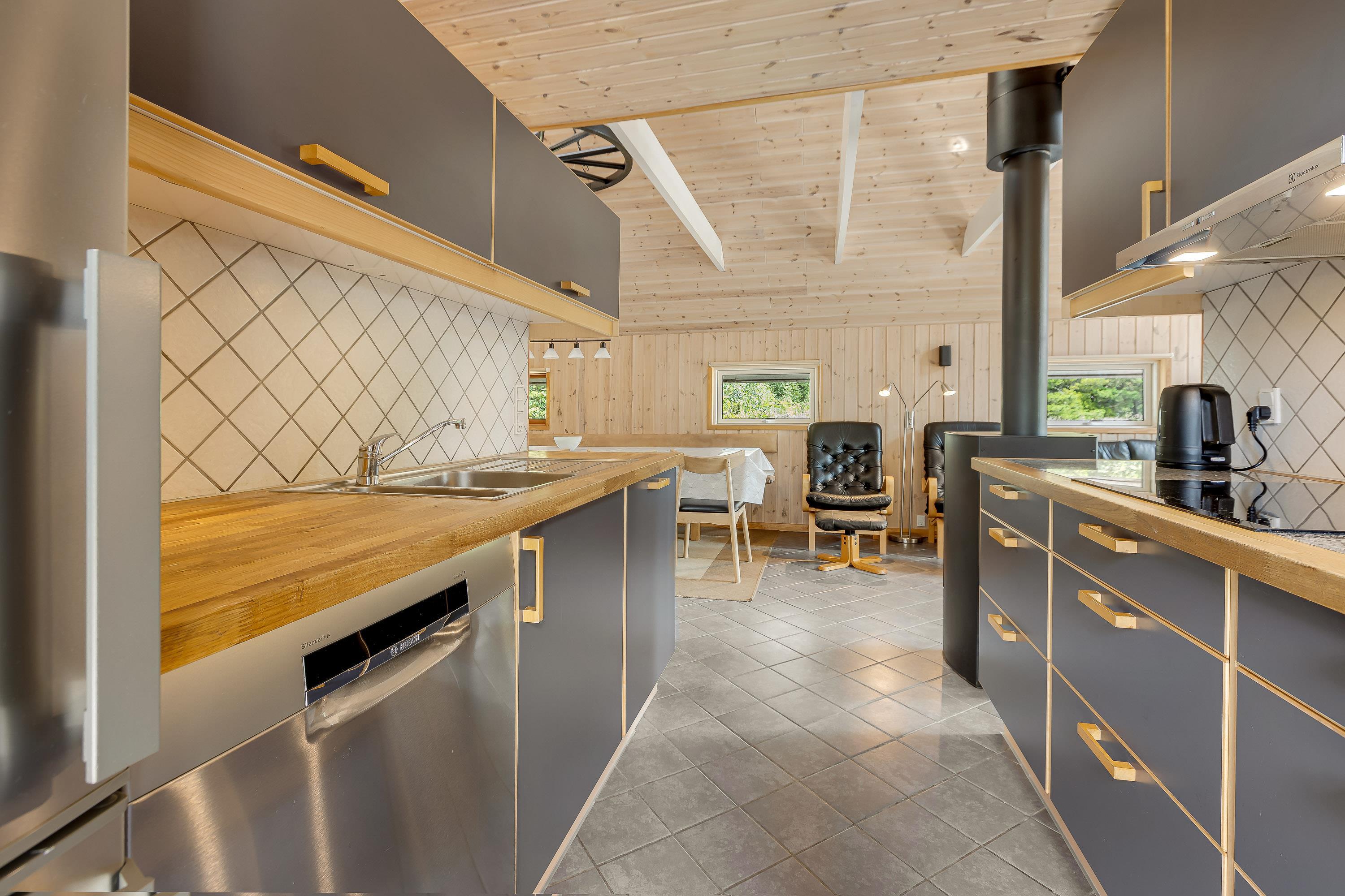 Det flotte, funktionelle og rustikke køkken er udstyret med varmluftsovn med grill og pyrolyse, induktionskogeplader, 3-funktions mikrobølgeovn, opvaskemaskine og nyt selvafrimende køle/fryseskab med frysekapacitet på 97 liter. Der er klinkegulve med gulvvarme i både køkken og stue.