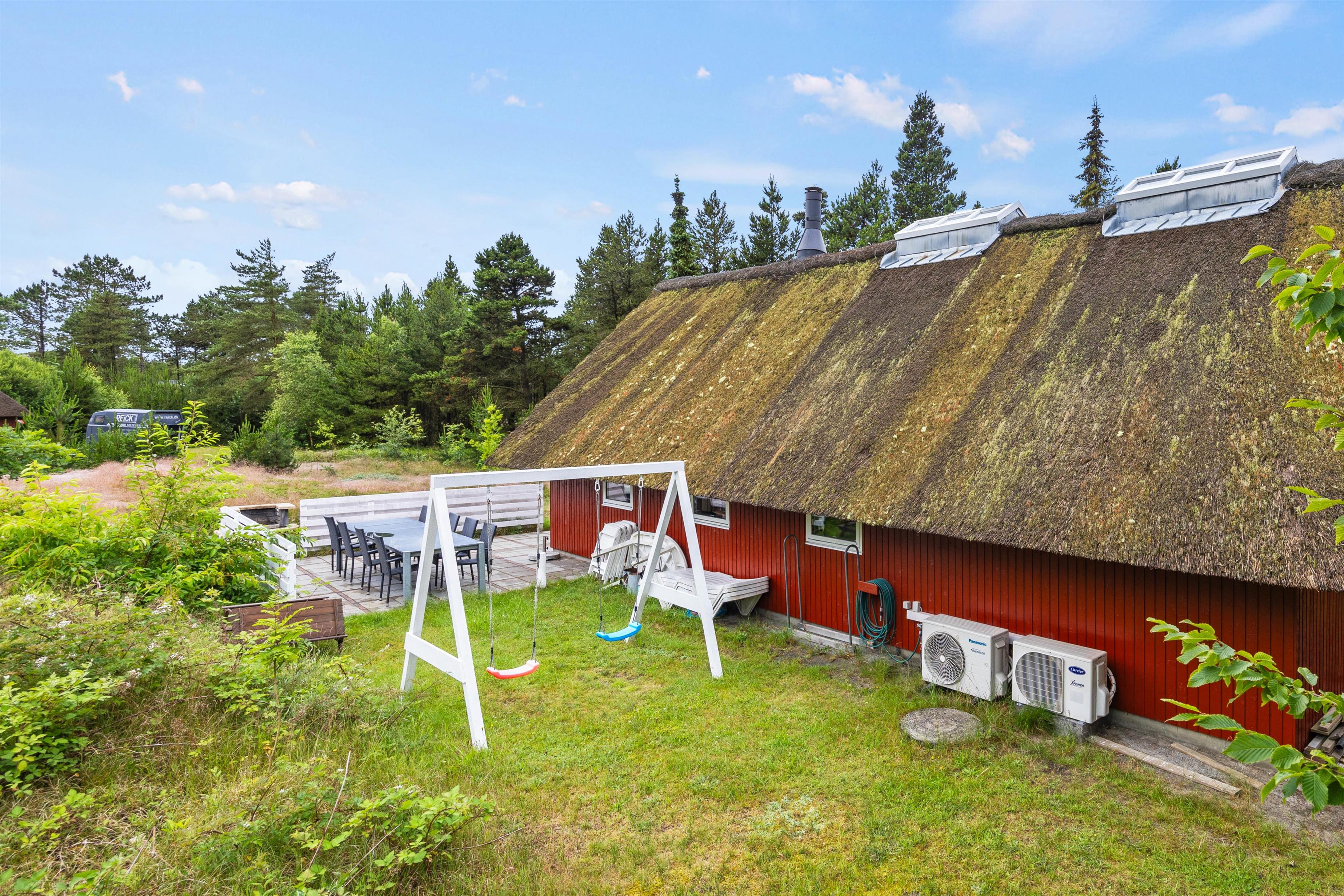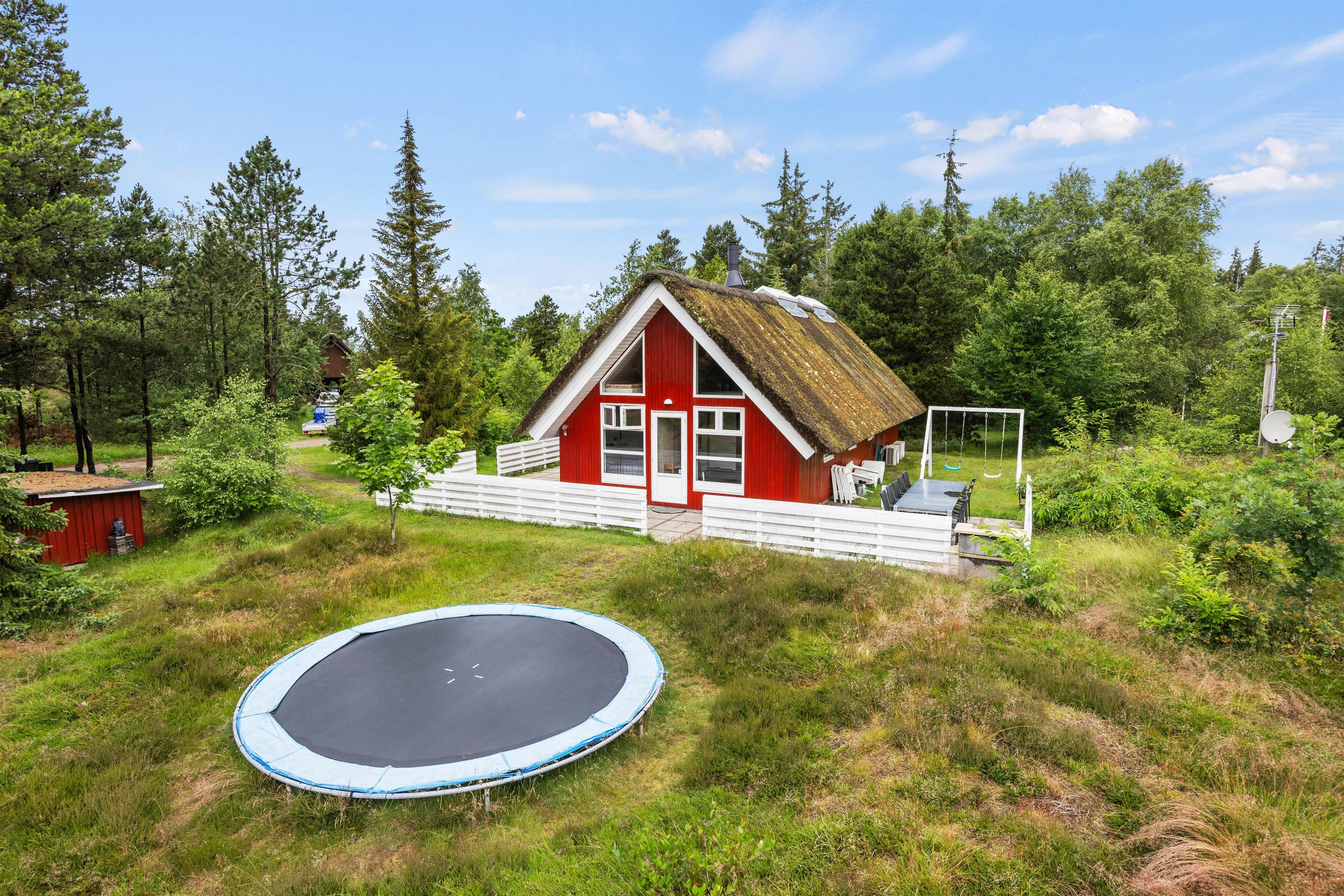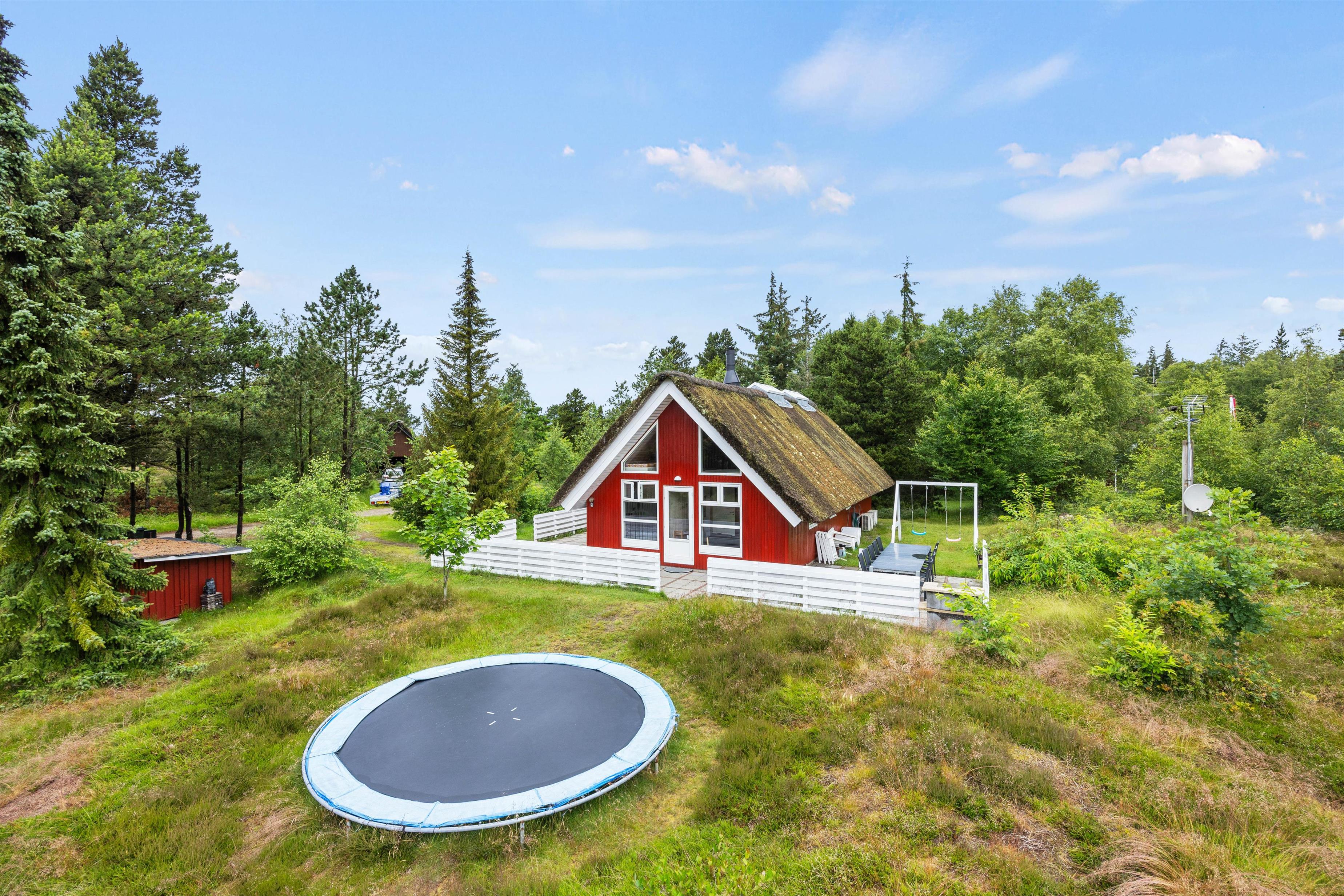Til børnene er der en stor trampolin, gynger og overdækket sandkasse.