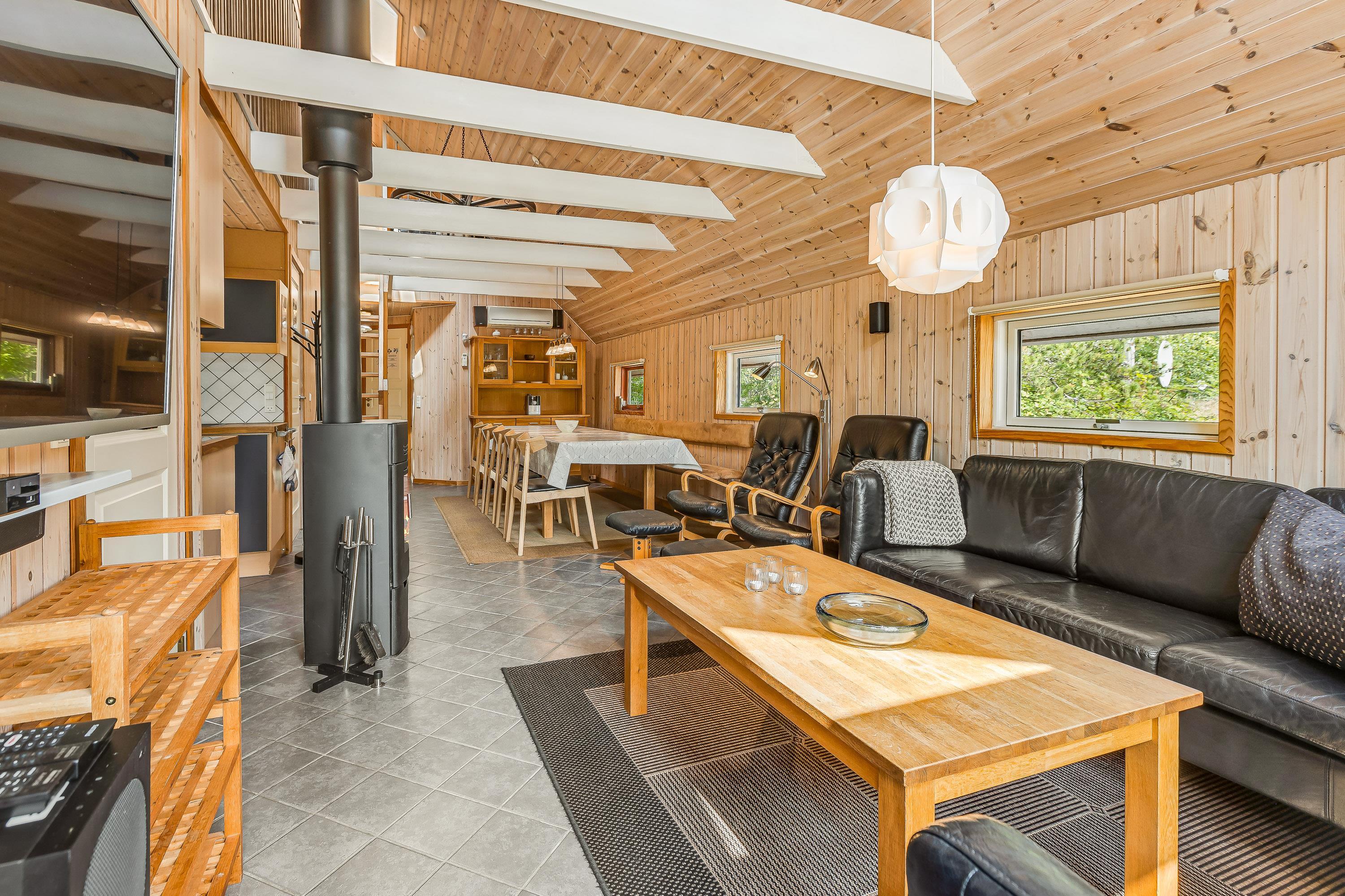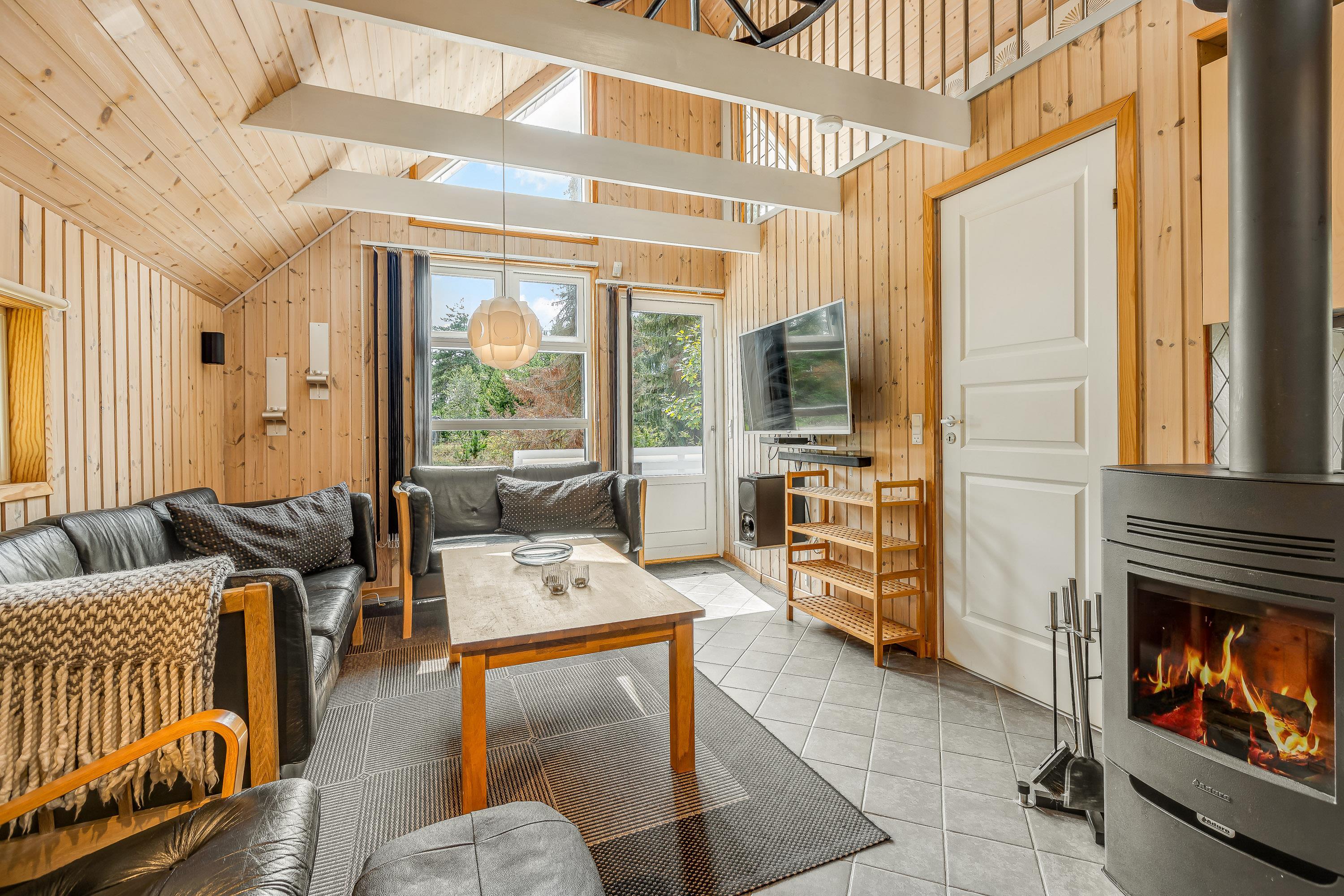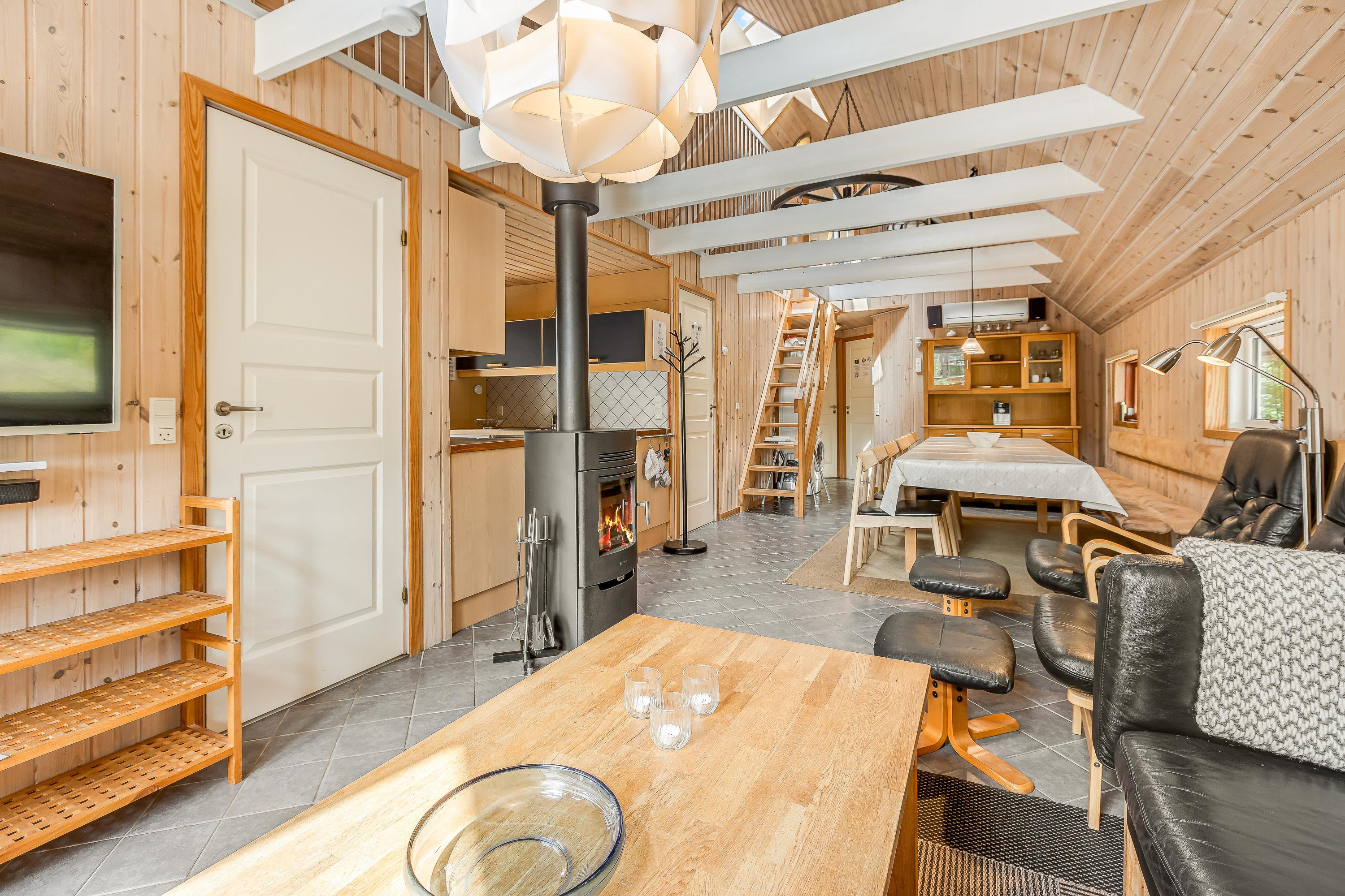 Den med køkkenet kombinerede opholds- og spisestue er indrettet med komfortable lædermøbler, 50” 4K UHD LED Smart TV med Chromecast, 5.1 surround sound med Bluetooth, parabol, Blu-Ray afspiller, stereoanlæg med CD-afspiller og trådløse opladere til smartphones. Stuen rummer også en centralt placeret effektiv brændeovn samt en luft til luft varmepumpe.