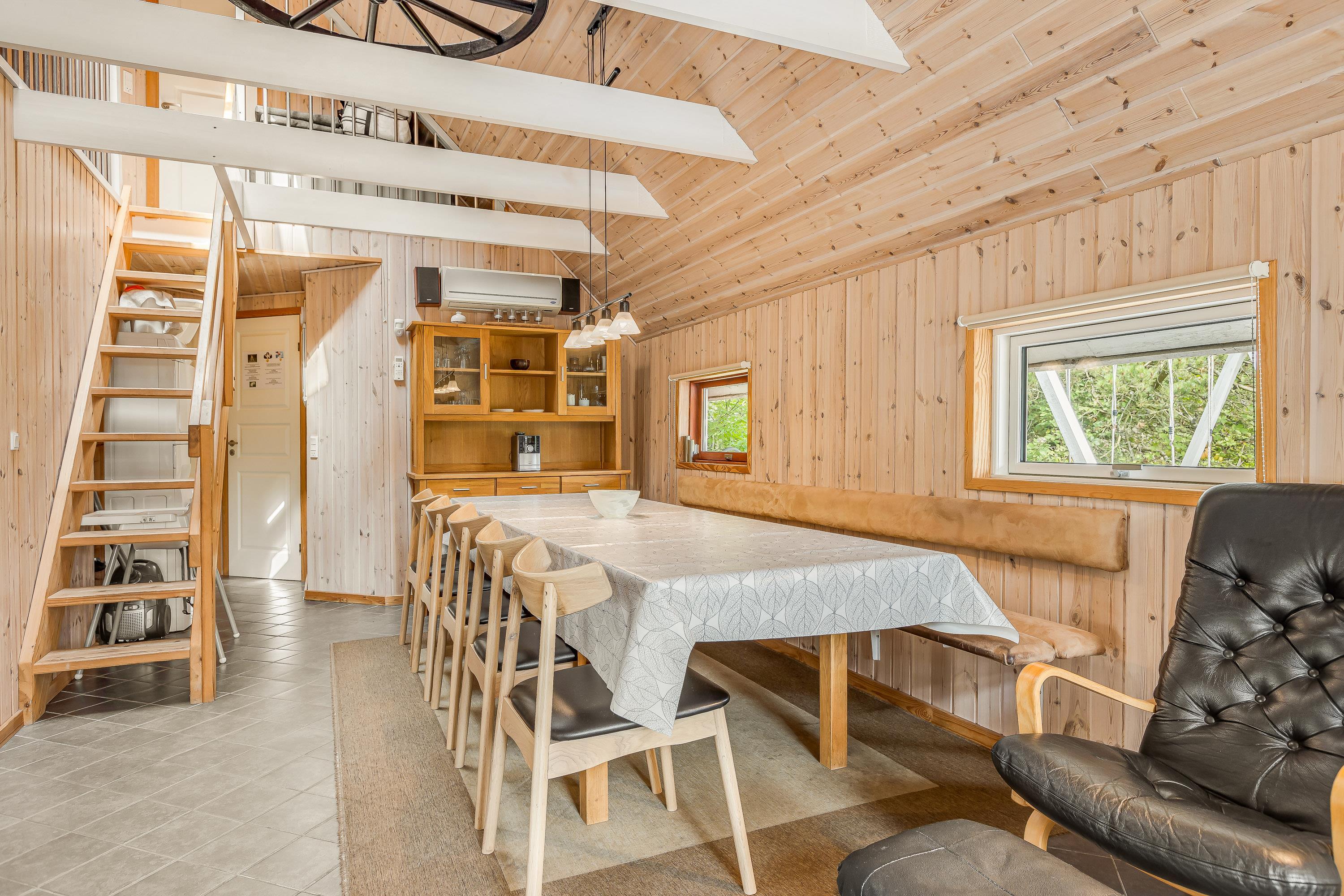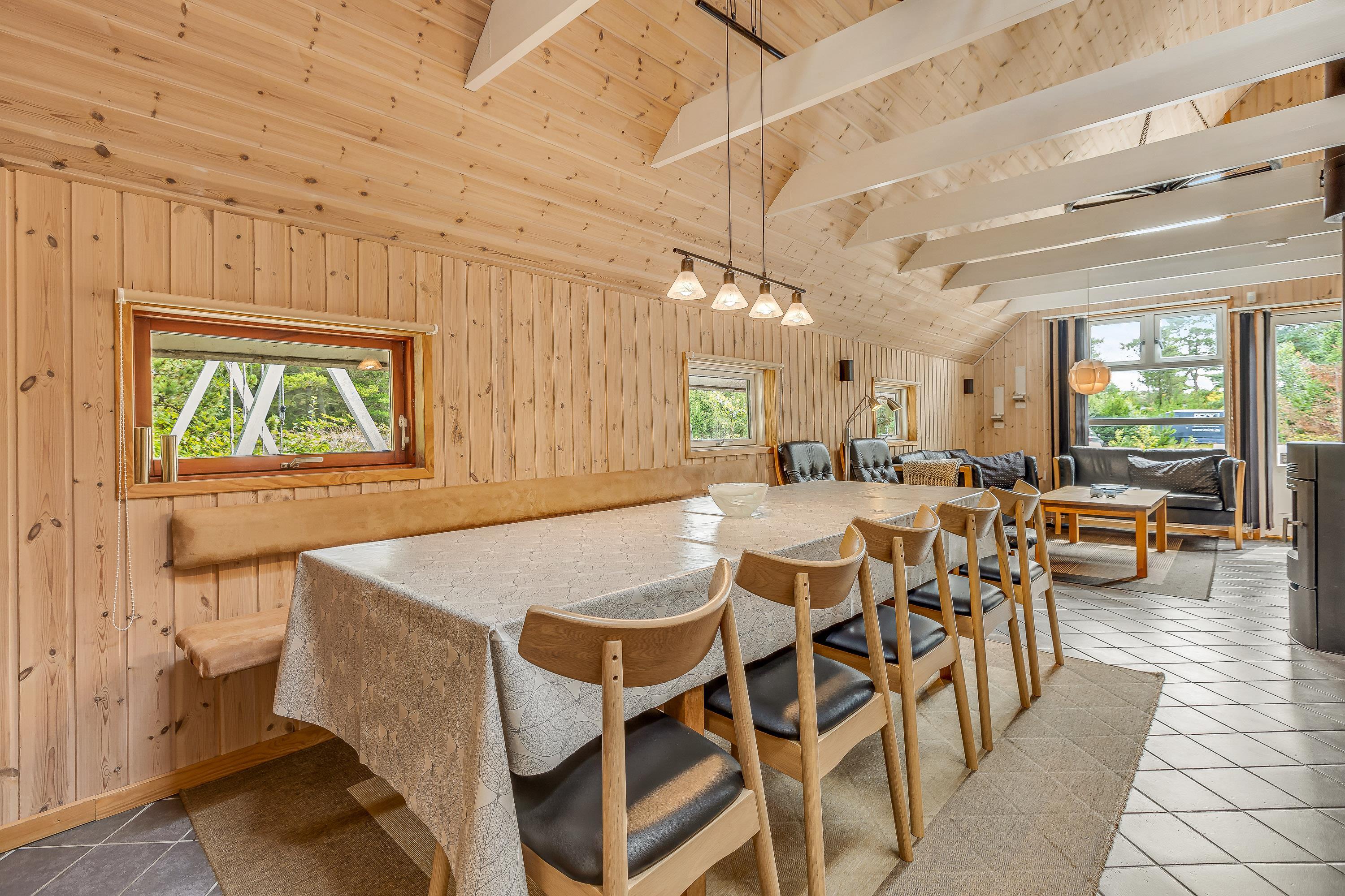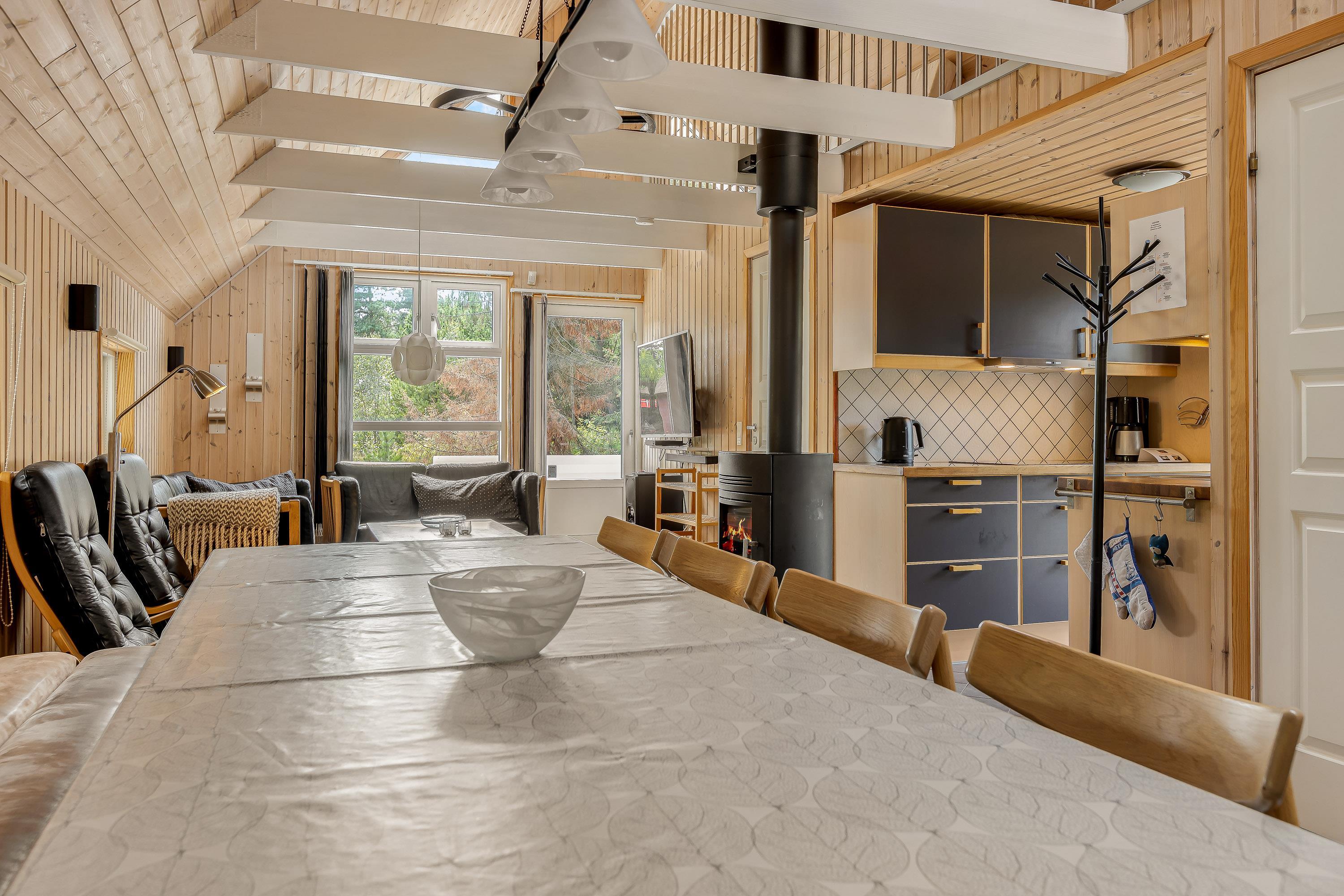 Den med køkkenet kombinerede opholds- og spisestue er indrettet med komfortable lædermøbler, 50” 4K UHD LED Smart TV med Chromecast, 5.1 surround sound med Bluetooth, parabol, Blu-Ray afspiller, stereoanlæg med CD-afspiller og trådløse opladere til smartphones. Stuen rummer også en centralt placeret effektiv brændeovn samt en luft til luft varmepumpe.