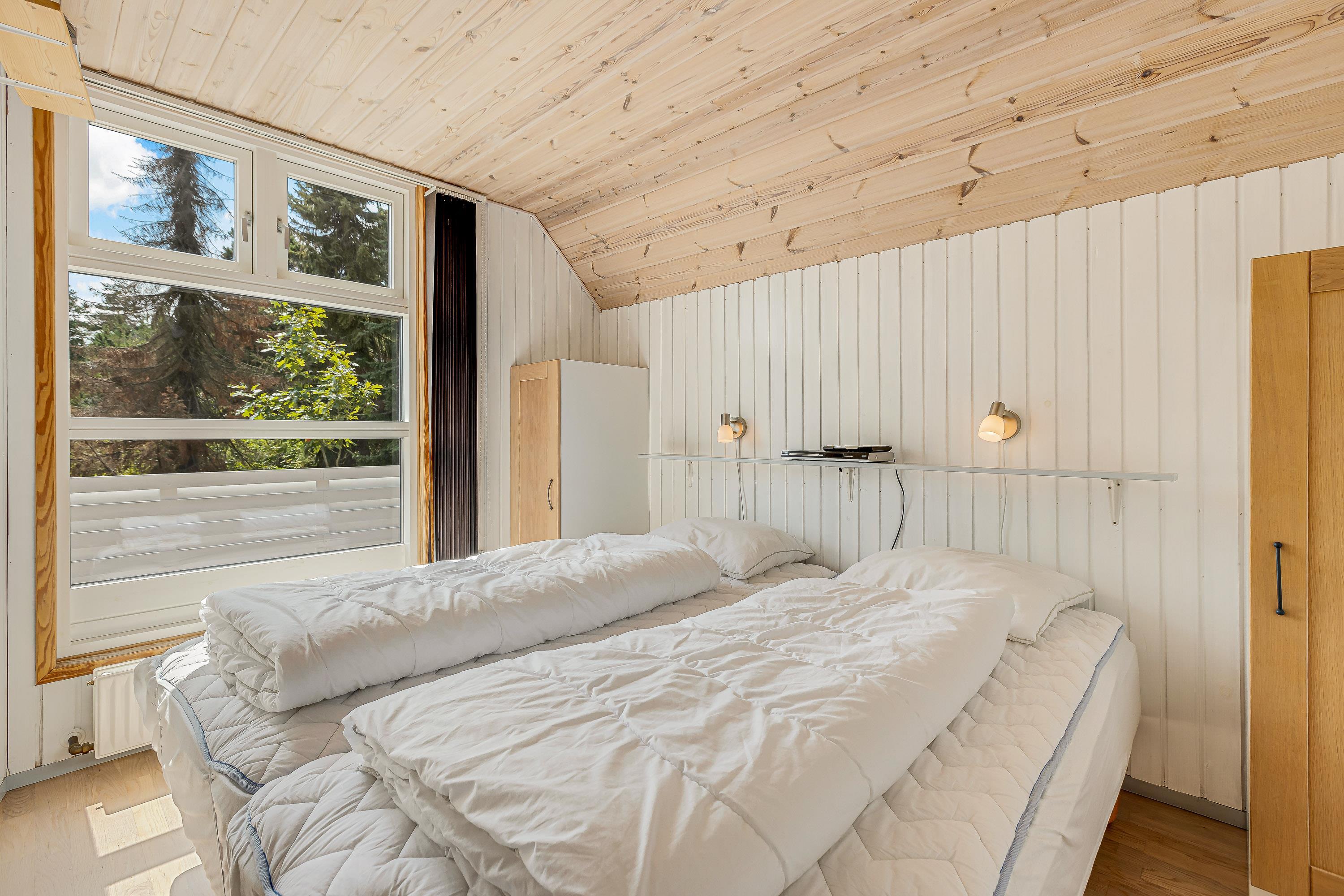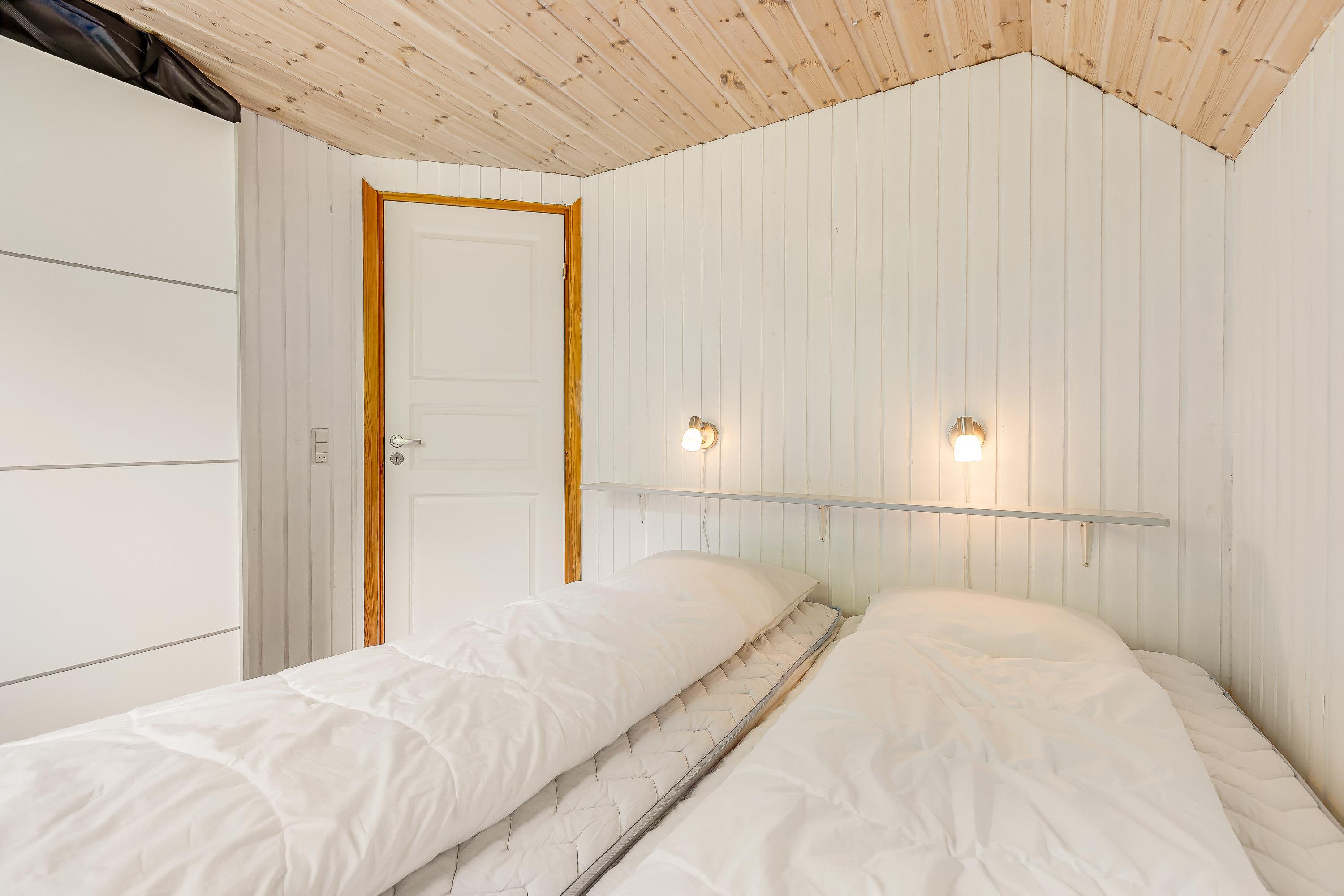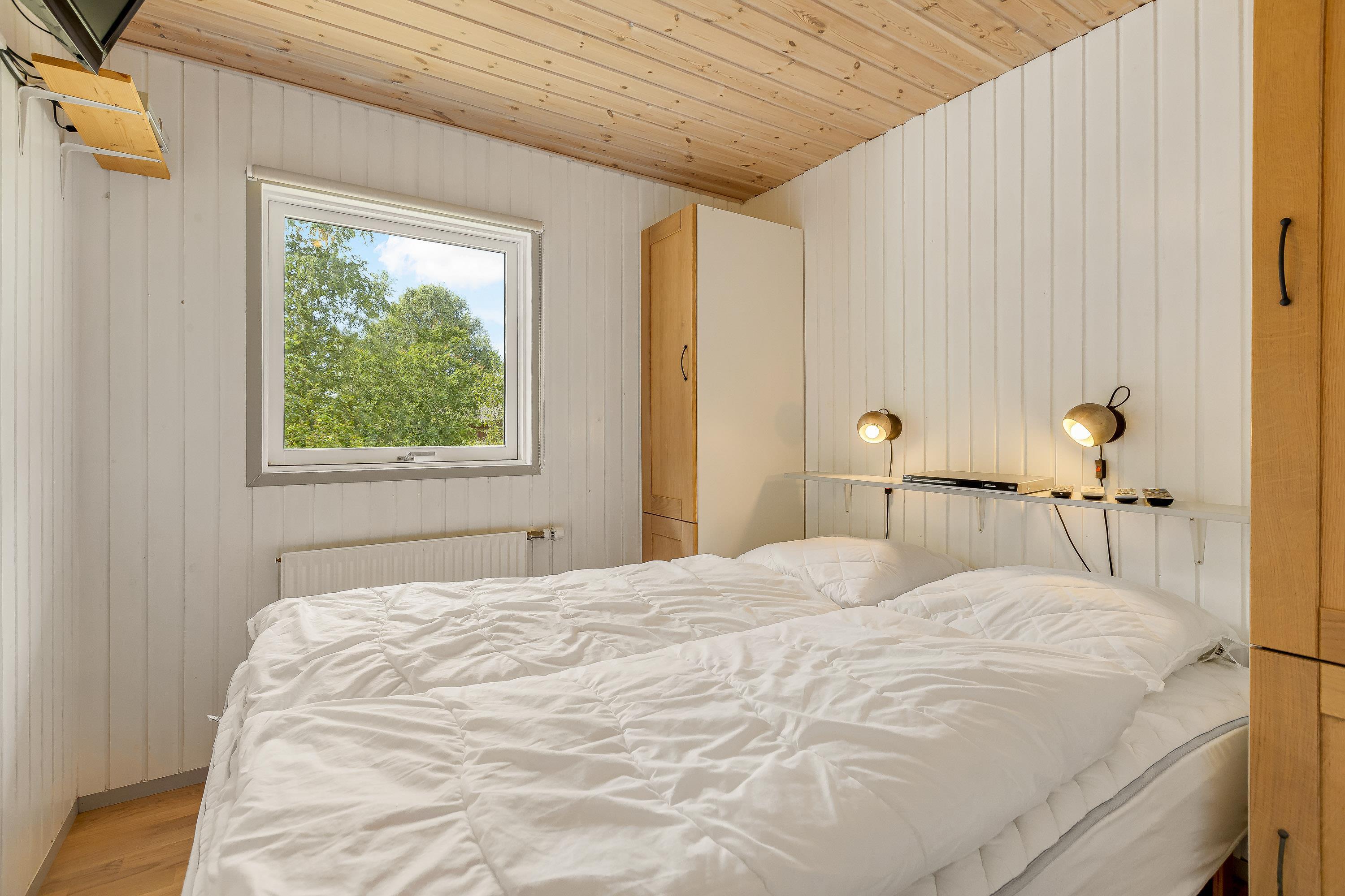 De tre separate soveværelser i stueetagen er alle med trægulve og dobbeltsenge med boksmadrasser samt vinterdyner, sommerdyner, puder og rullemadrasser. I to af værelserne kan dobbeltsengene nemt adskilles til hver to enkeltsenge. På hvert soveværelse er der et Full HD LED-TV med valgfri digitale kanaler samt en DVD-afspiller over sengene.