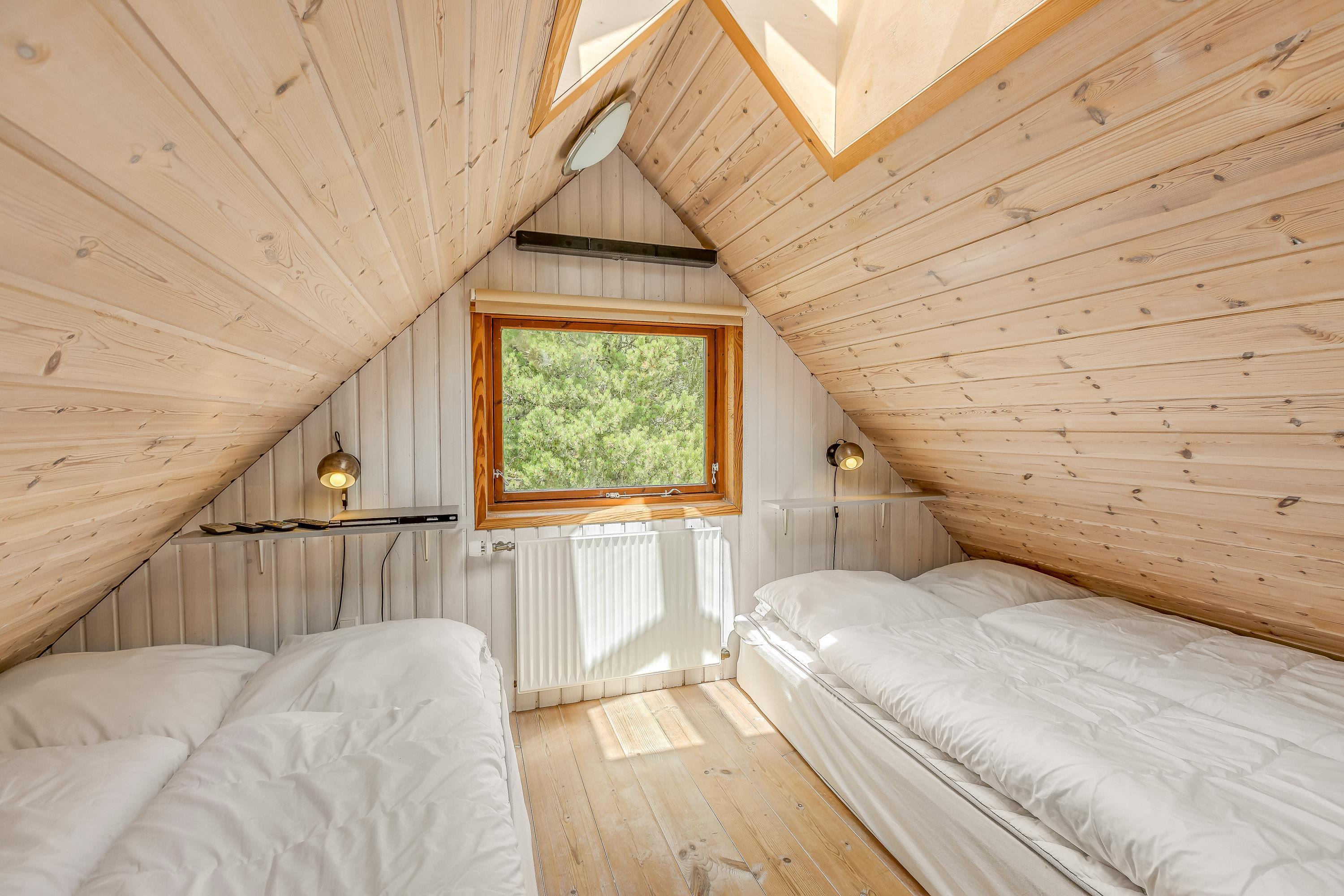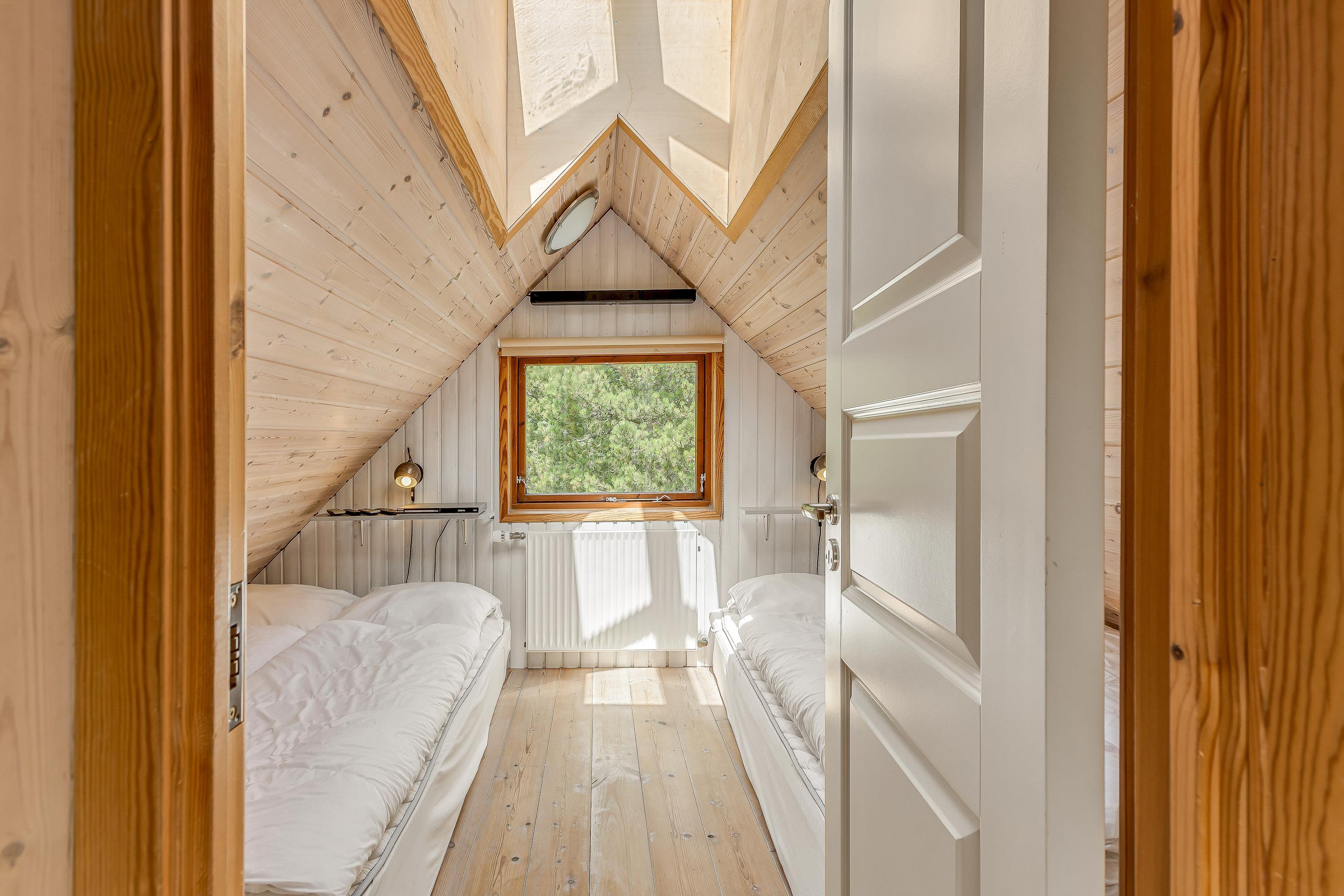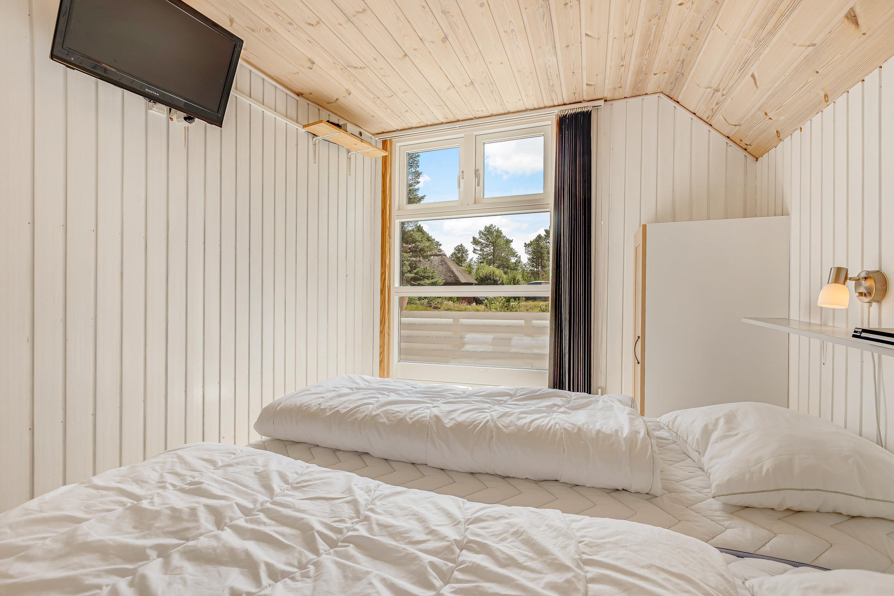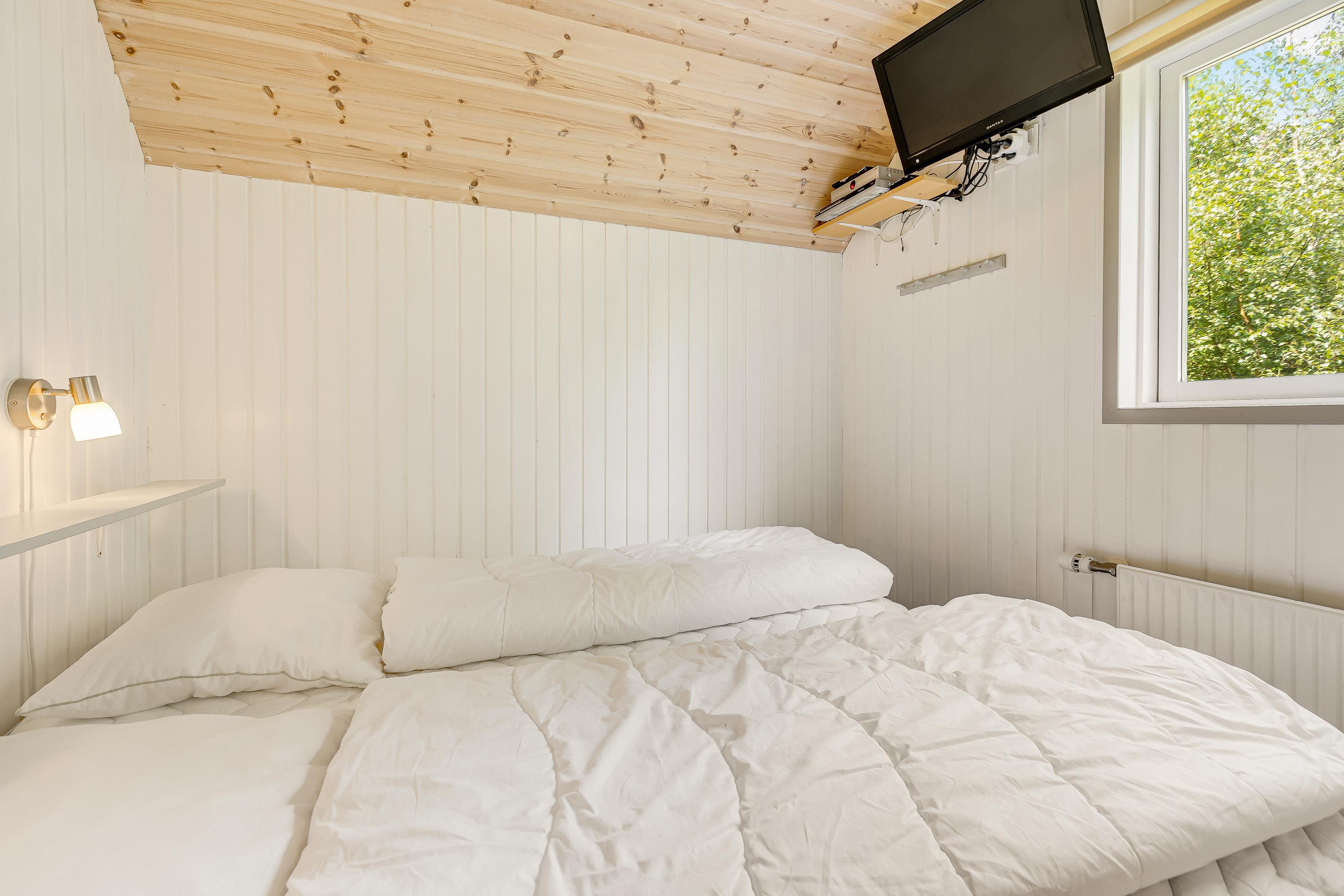 De tre separate soveværelser i stueetagen er alle med trægulve og dobbeltsenge med boksmadrasser samt vinterdyner, sommerdyner, puder og rullemadrasser. I to af værelserne kan dobbeltsengene nemt adskilles til hver to enkeltsenge. På hvert soveværelse er der et Full HD LED-TV med valgfri digitale kanaler samt en DVD-afspiller over sengene.