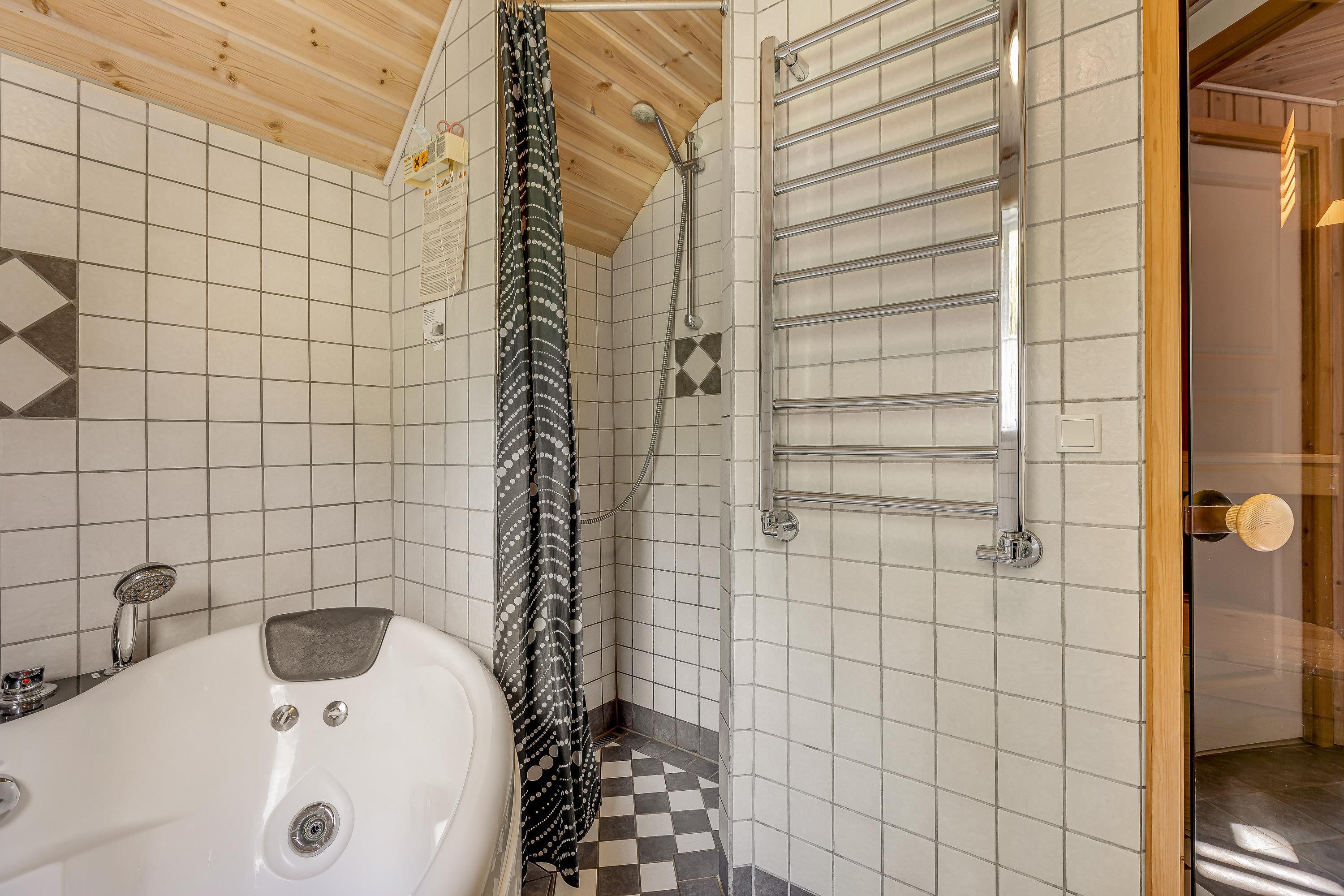 To komplette badeværelser med fliser og gulvvarme. Det store badeværelse har bruseniche, et 2 personers spabad med regulerbar luft- og vandmassage og lysterapi. Fra dette badeværelse er der direkte adgang til saunaen med 2 gennemgående bænke. Det andet badeværelse er indrettet med en damp-kabine med lysterapi. Desuden forefindes vaskemaskine og tørretumbler.