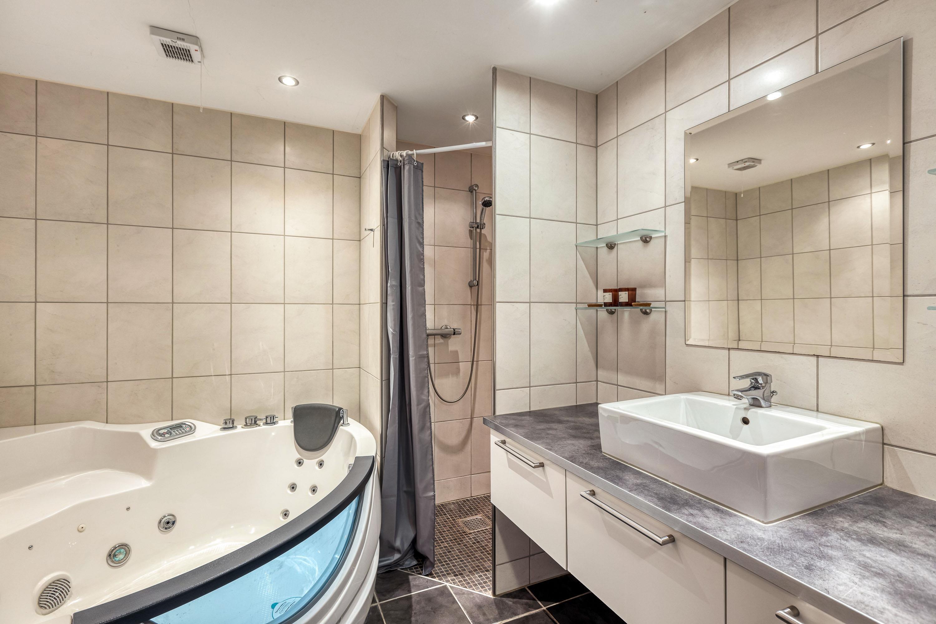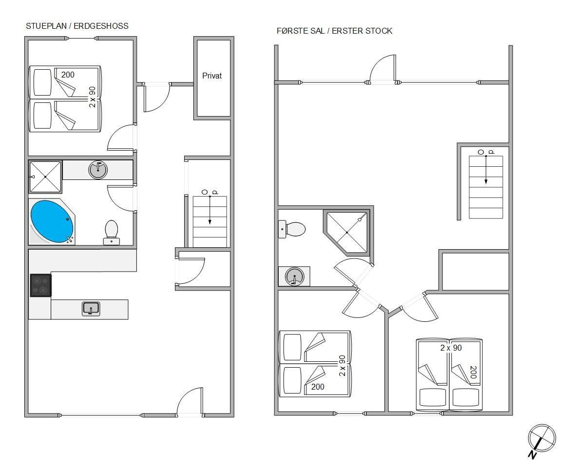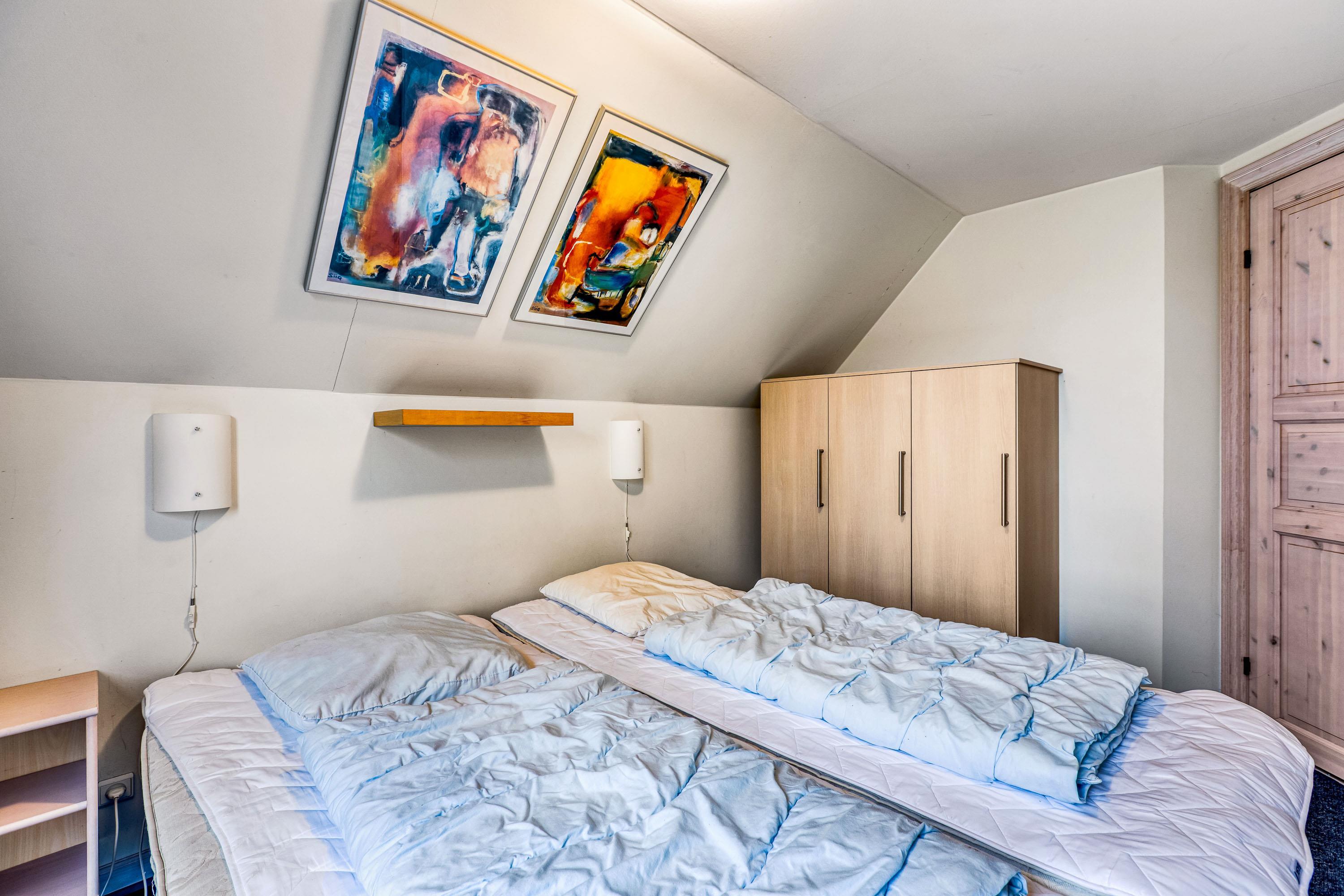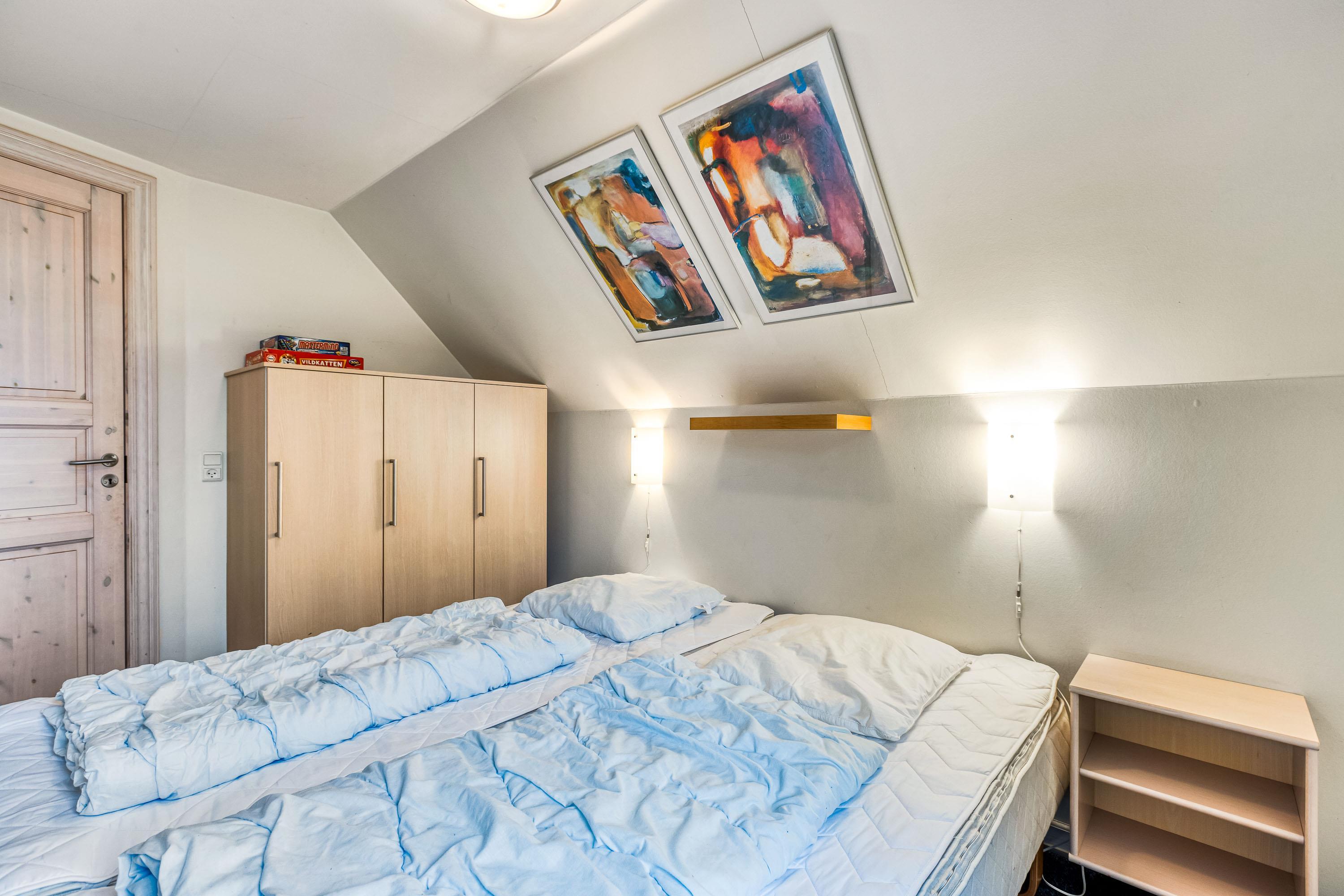 Her finder I også badeværelset med spabad og gulvvarme samt ét af de i alt 3 soveværelser, hvoraf de 2 andre ligger på 1. salen - alle er indrettet med dobbeltsenge. De resterende 2 sovepladser ligger på hemsen, som er udstyret med ekstra madrasser.