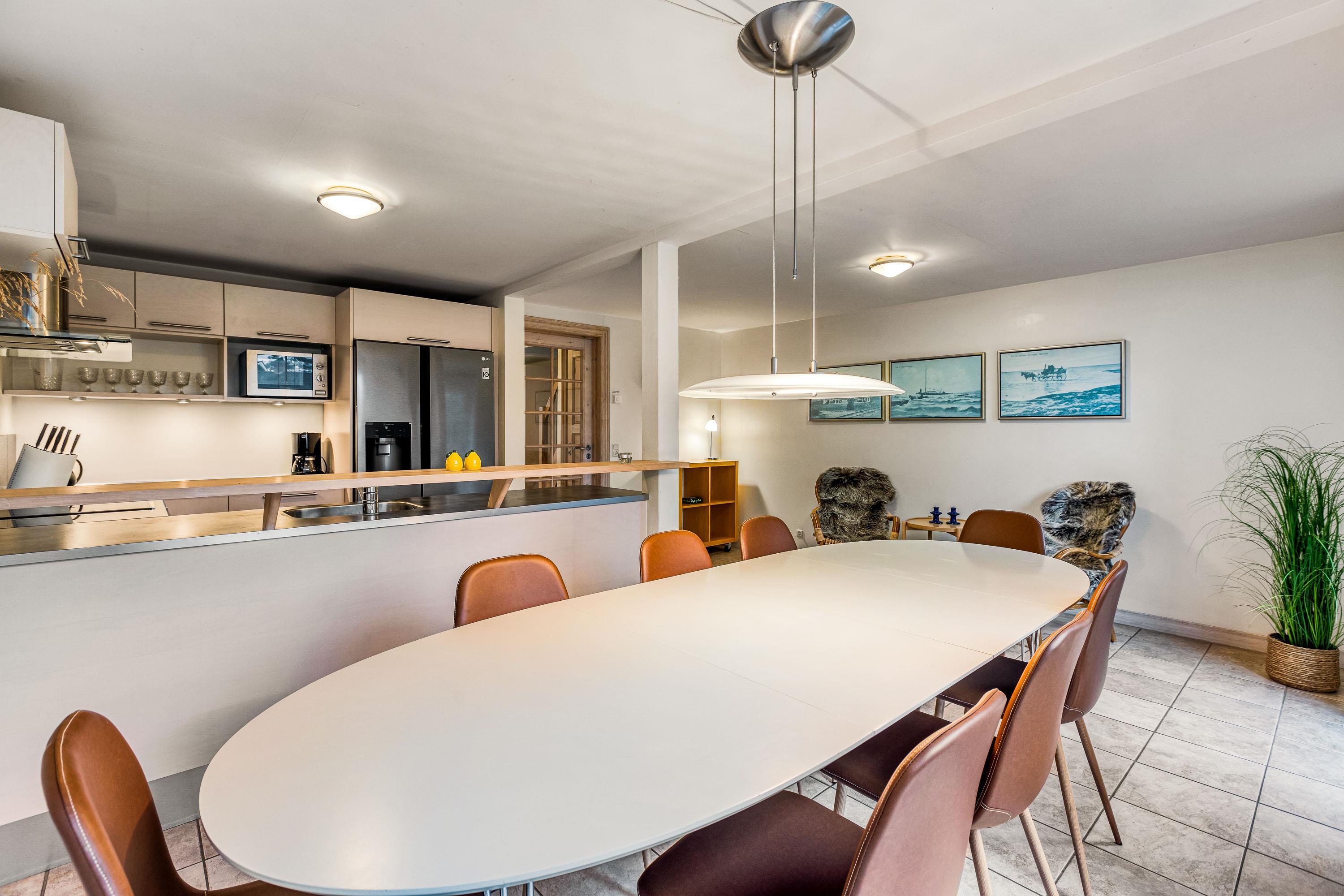 Ferielejligheden består af 2 plan og er hyggeligt og lyst indrettet med komfortable møbler. I stuetagen finder I et fint og veludstyret køkken med opvaskemaskine, mikroovn og køleskab med frostboks. Køkkenet ligger i åben forbindelse til spisepladsen, hvor I kan nyde lækre måltider på en regnvejrsaften.