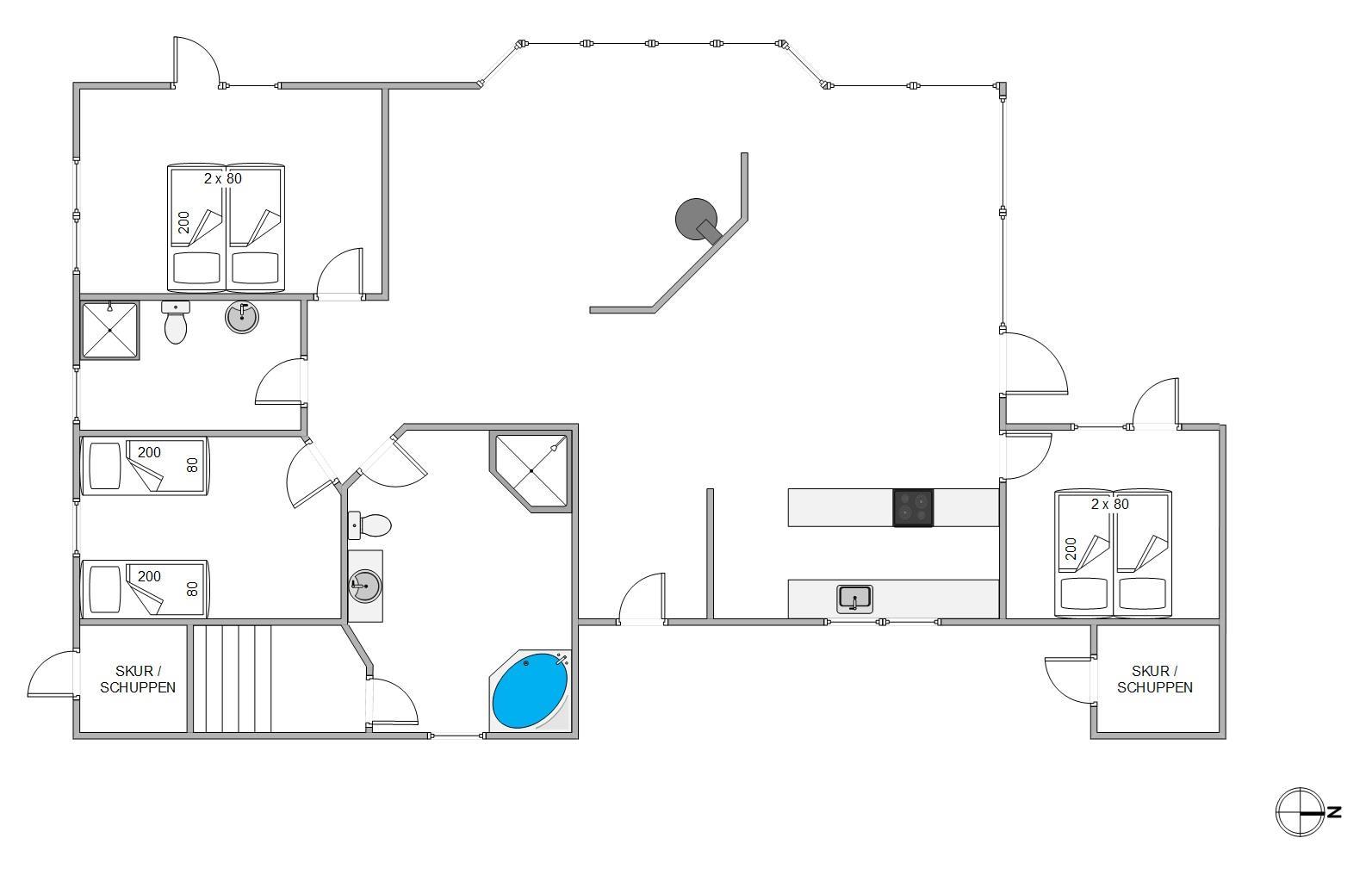 Et af højdepunkterne er saunaen og spaen i det største af de to badeværelser. Her er der også et luksuriøst brusebad med ekstraudstyr. I det mindre badeværelse er der også et brusebad. Soveværelserne er opdelt i 2 værelser med dobbeltsenge, 1 soveværelse med 2 enkeltsenge og en hems med 2 madrasser.