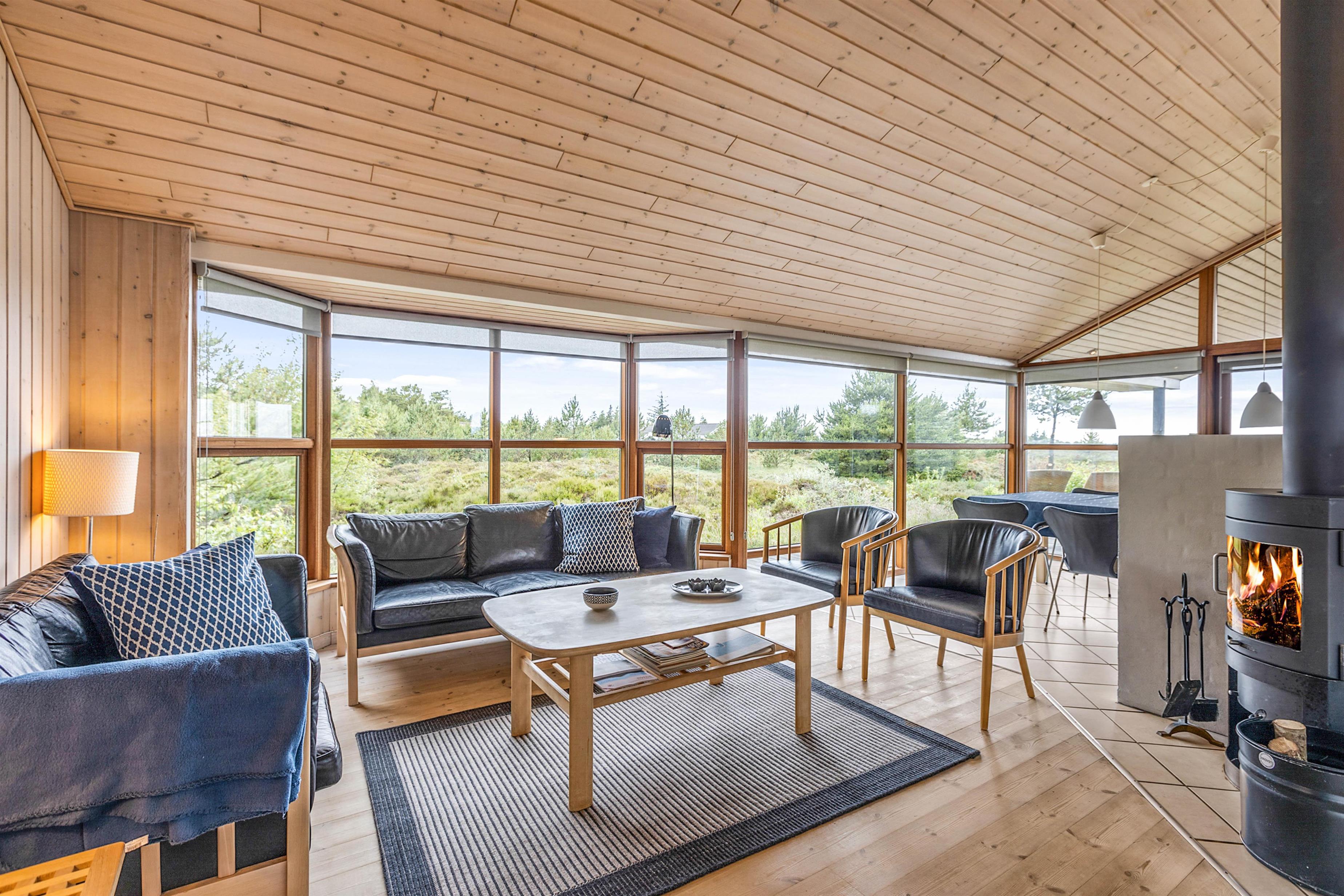 Når du træder ind i sommerhuset, vil du straks bemærke det lyse træ med lofterne til kip og de store panoramavinduer, der går gennem hele opholdsstuen. her kommer meget lys ind i feriehuset og du kan nyde den unikke udsigt over det grønne område. Klinkegulvet i dette område har gulvvarme, så du behøver ikke at frygte kolde fødder.