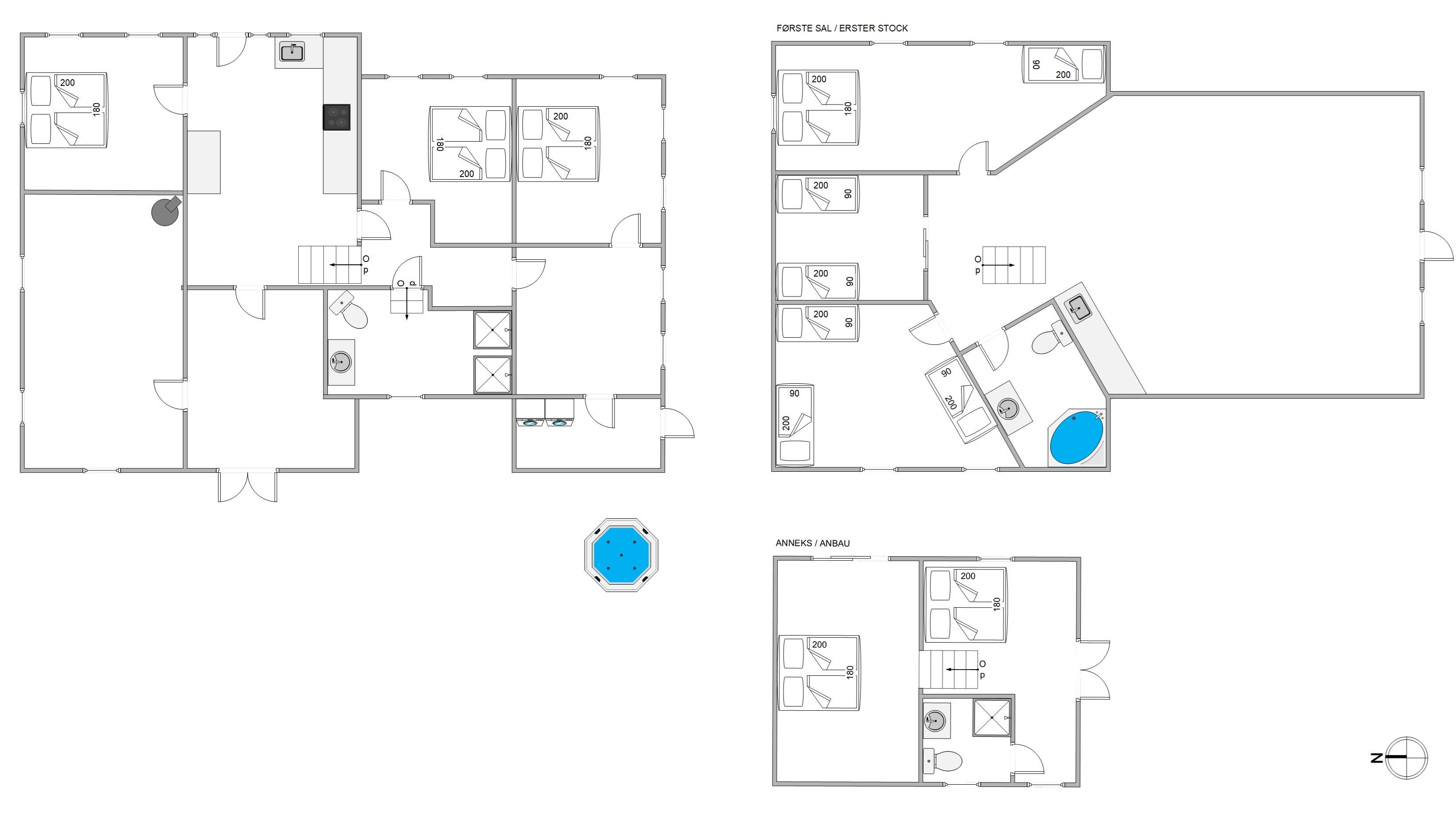 Det rummelige sommerus i Kongsmark er en sand rumoplevelse med sine 333 m2 boligareal. Det rummer 7 soveværelser, som er udstyret med 6 dobbeltsenge og 6 enkeltsenge, for at sikre at hver gæst får en velfortjent nattesøvn. Gæstehuset har eget badeværelse, hvor I finder 2 af de i alt 6 dobbeltsenge. De 3 moderniserede badeværelser er udstyret med gulvvarme, der omdanner jeres morgen- og aftenrutiner til rene velværeøjeblikke. Kun 300 meter fra huset inviterer vadehavet til uforglemmelige timer i naturen - gå ikke glip af de spektakulære solopgange. Til afslappende pauser står en stand-vand-spa samt en udendørs spa til jeres rådighed. Forkæl jer selv med en lille wellness-enhed!