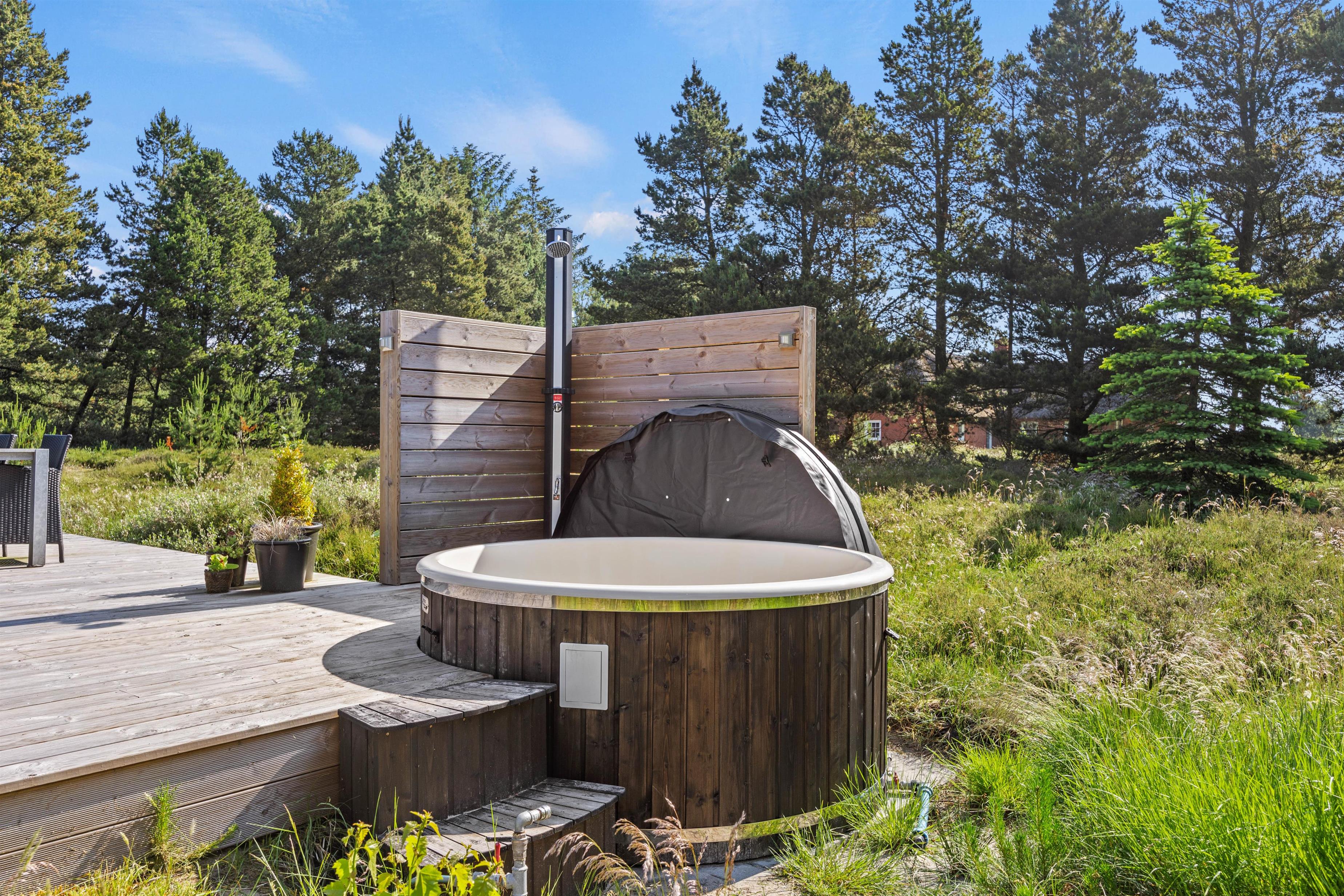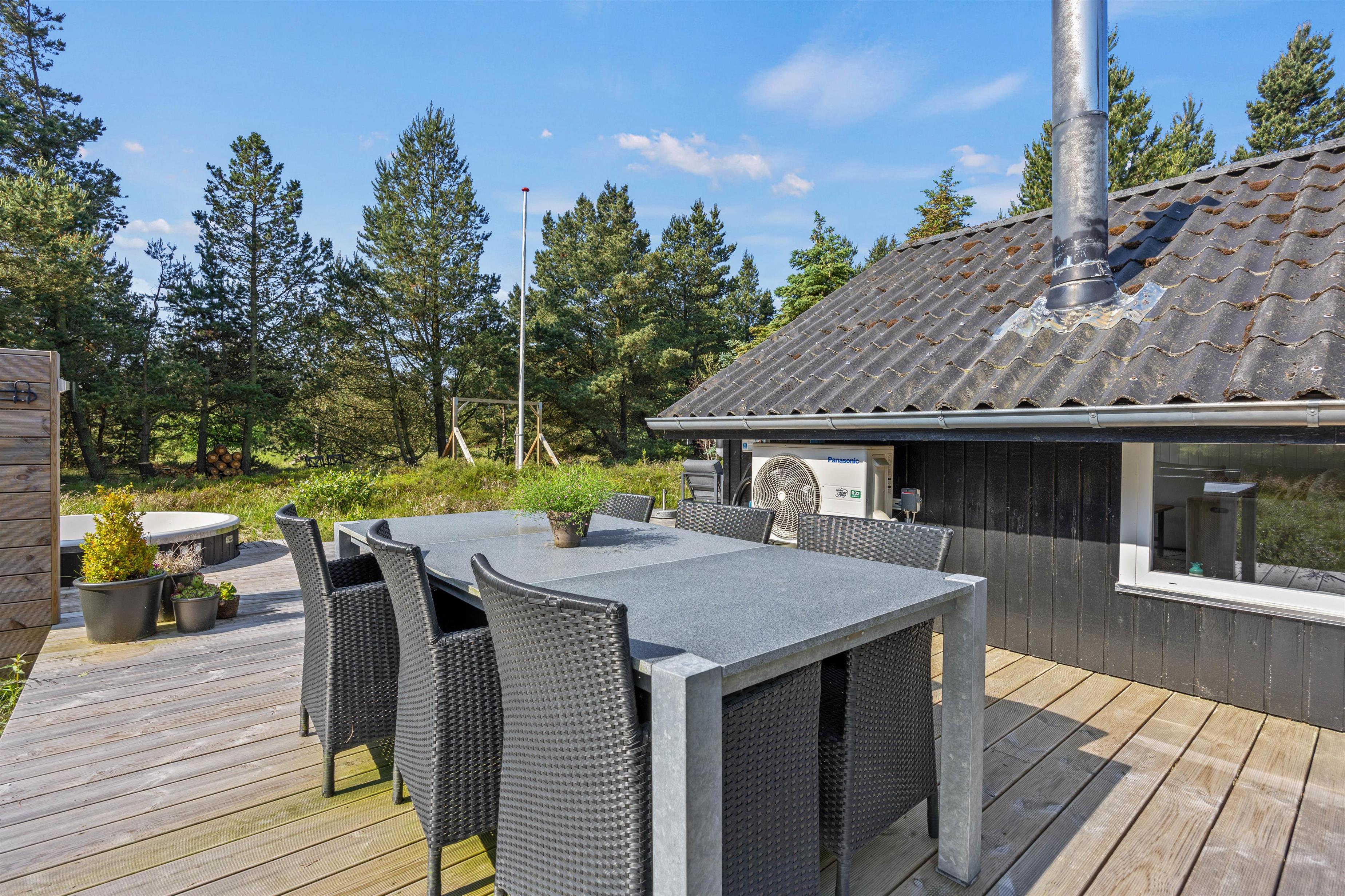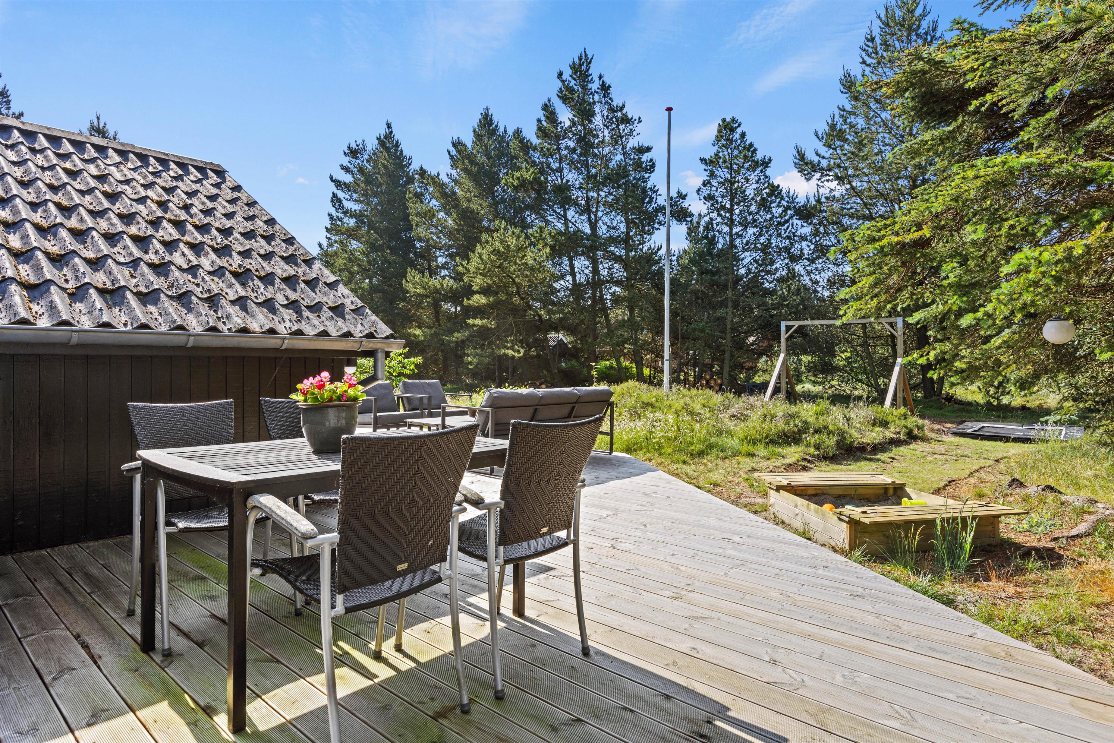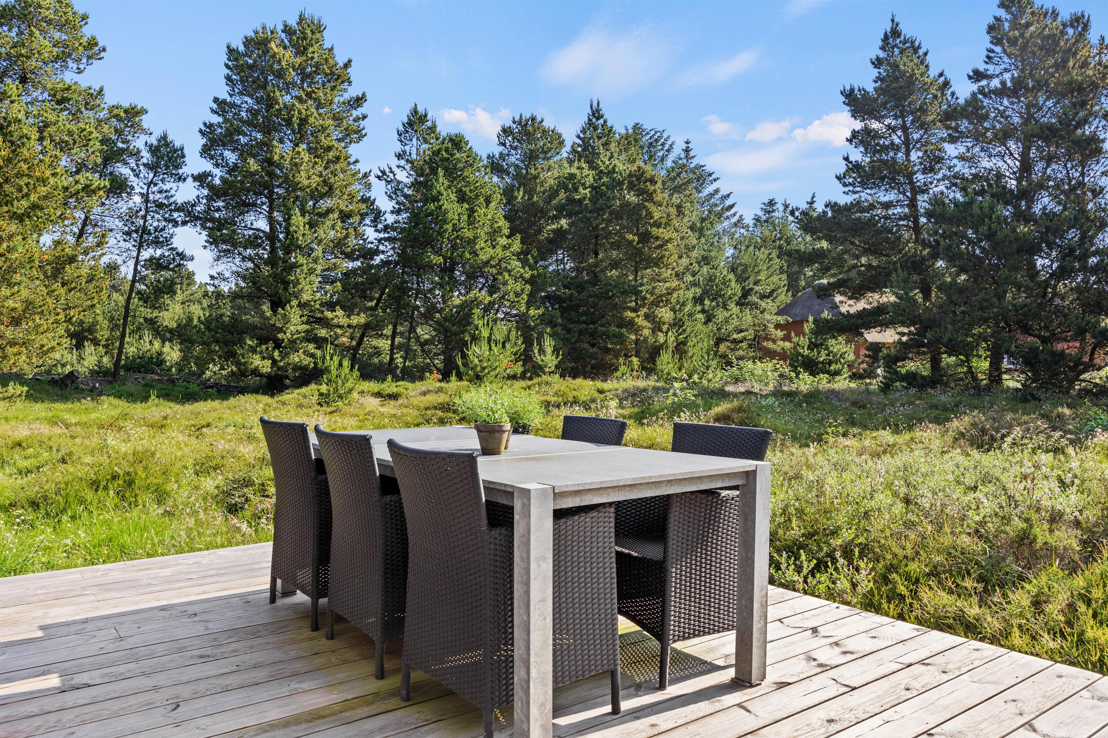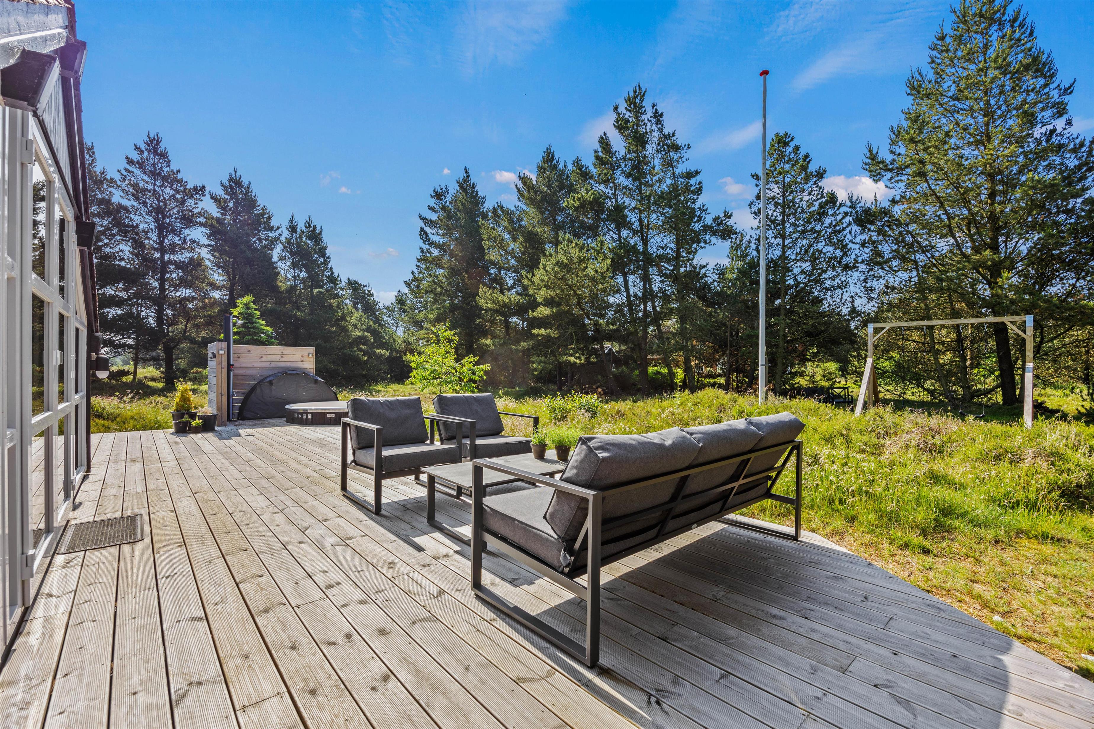 På den smukke brede træterrasse, som omgiver feriehuset, kan I tage solbad i havemøblerne eller trække jer tilbage i skyggen, hvis solen bliver for stærk. Her er mange kroge, så man kan altid finde sig en god plet, hvor man kan trække sig tilbage med sin yndlingsroman. Udsigten over den lyngklædte naturgrund er helt unik, og I kan nyde den samtidig med, at I holder øje med børnenes leg i sandkassen, gyngerne og på trampolinen. Det samme kan I fra vildmarksbadet – eller I kan benytte det i aftentimerne og nyde freden under stjernehimlen.