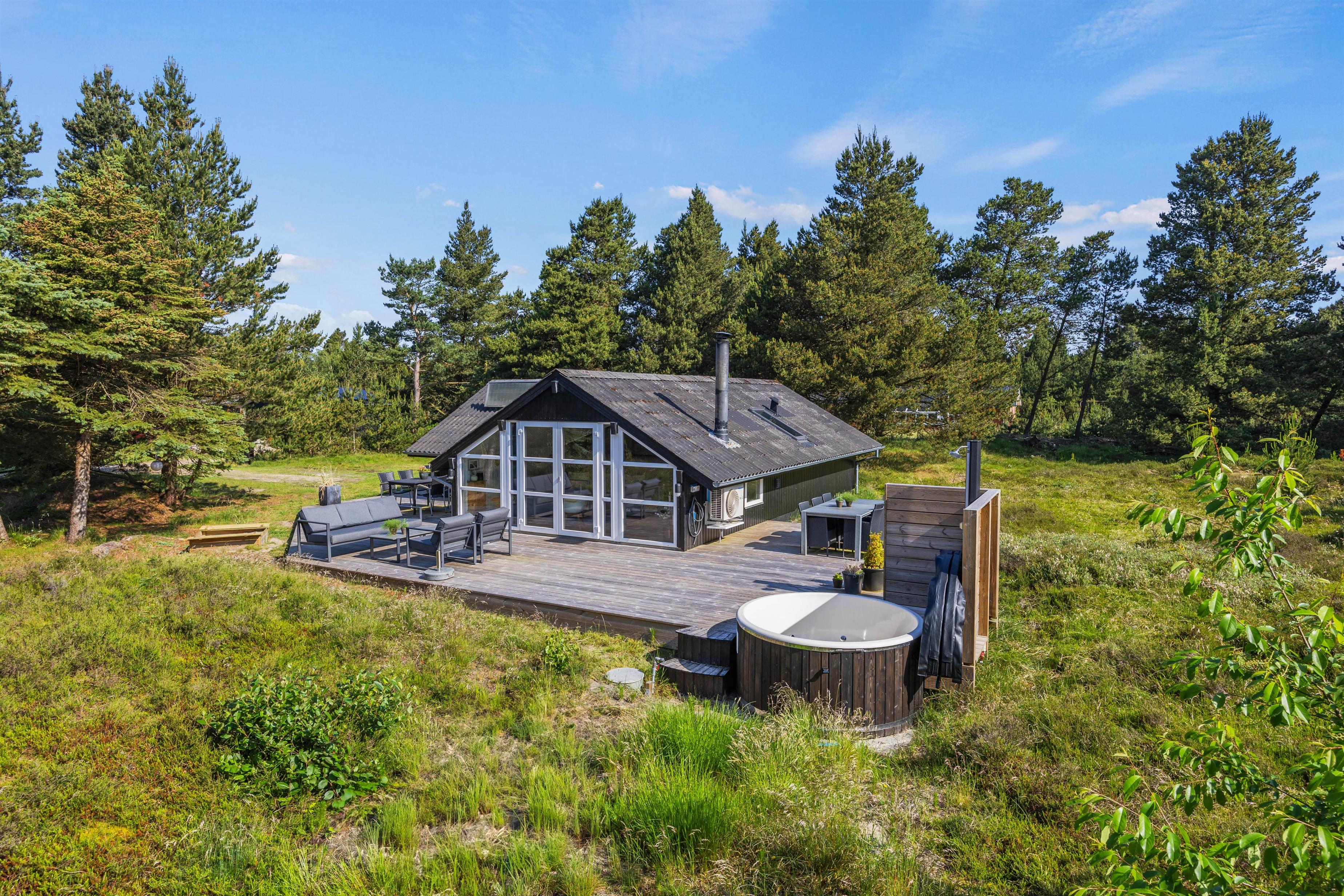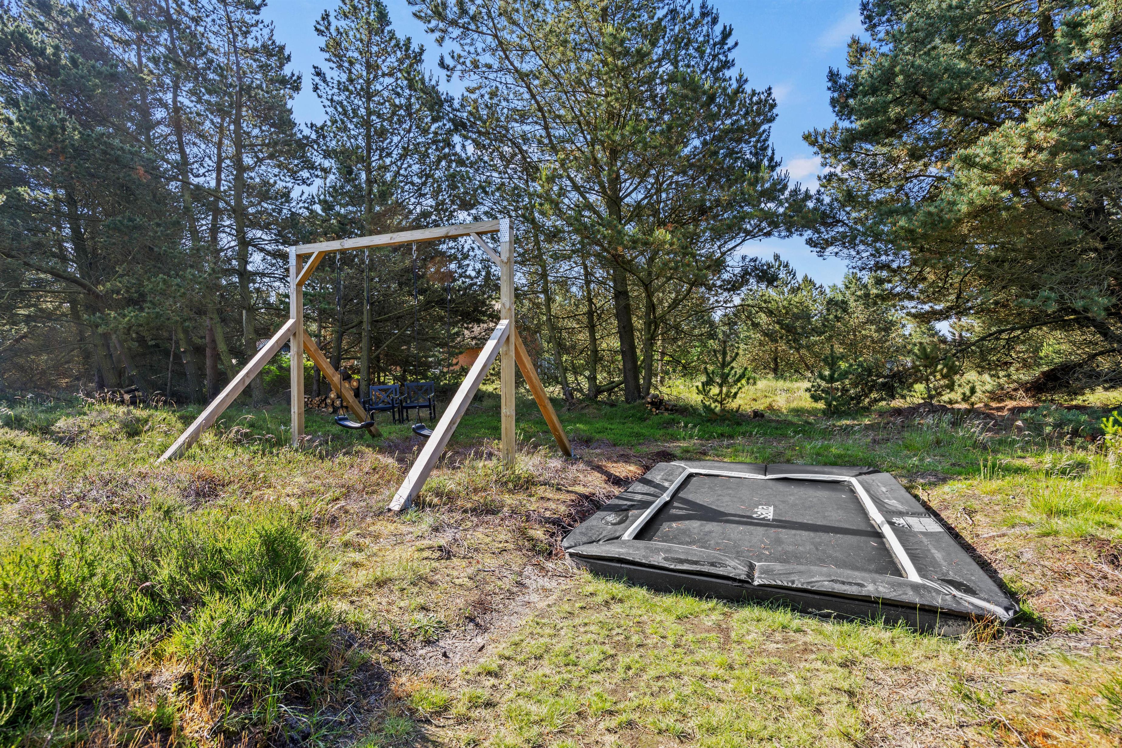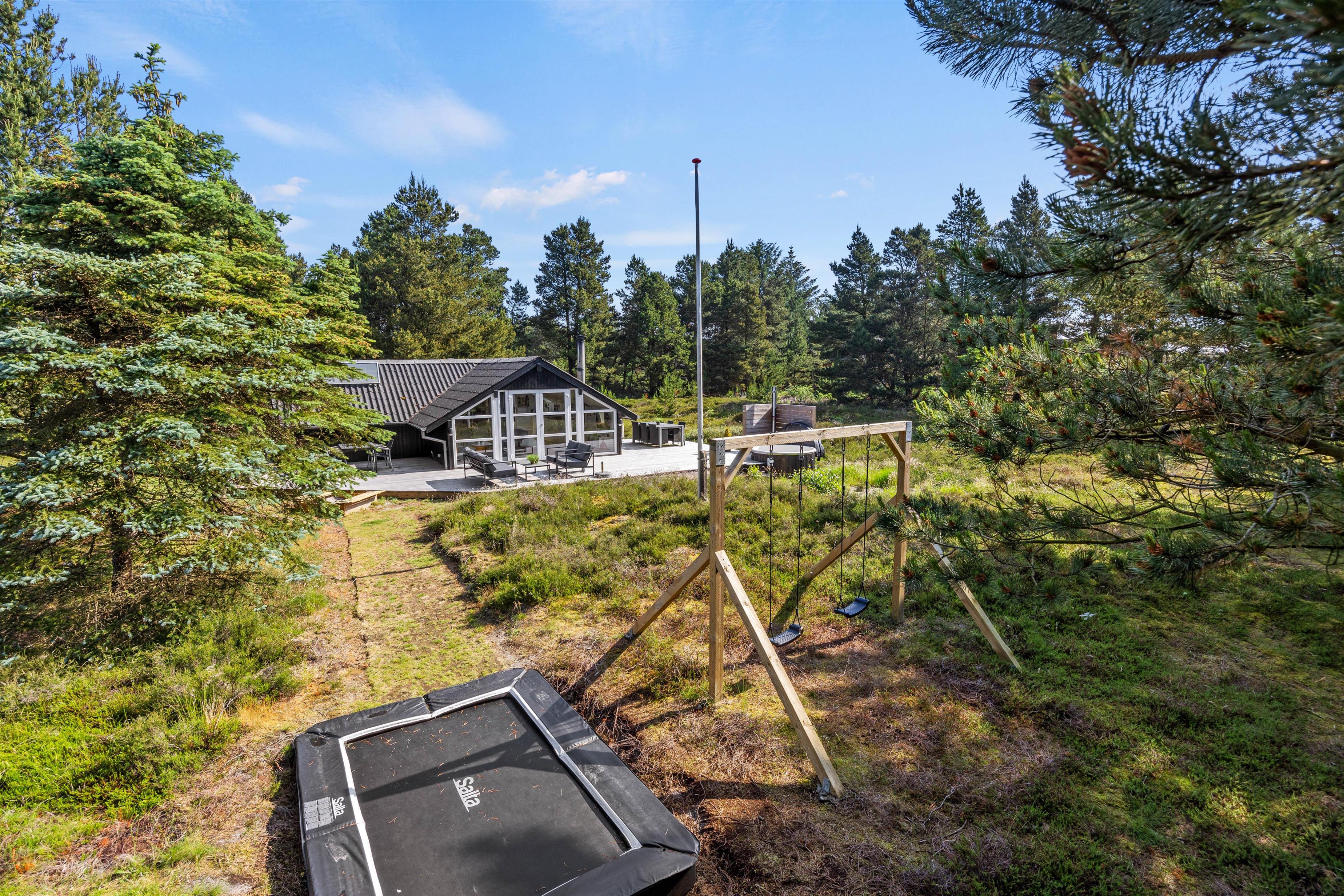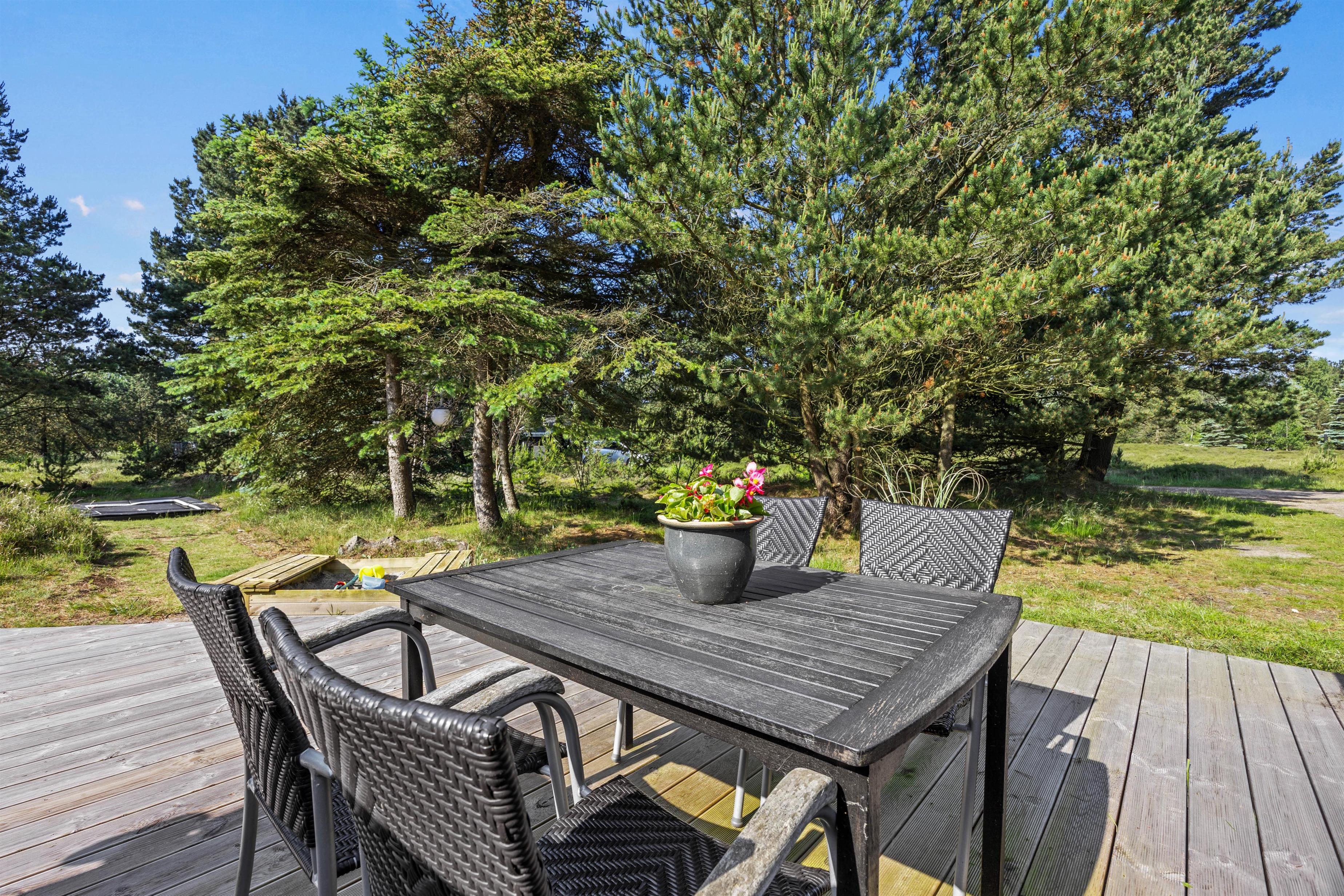 På den smukke brede træterrasse, som omgiver feriehuset, kan I tage solbad i havemøblerne eller trække jer tilbage i skyggen, hvis solen bliver for stærk. Her er mange kroge, så man kan altid finde sig en god plet, hvor man kan trække sig tilbage med sin yndlingsroman. Udsigten over den lyngklædte naturgrund er helt unik, og I kan nyde den samtidig med, at I holder øje med børnenes leg i sandkassen, gyngerne og på trampolinen. Det samme kan I fra vildmarksbadet – eller I kan benytte det i aftentimerne og nyde freden under stjernehimlen.