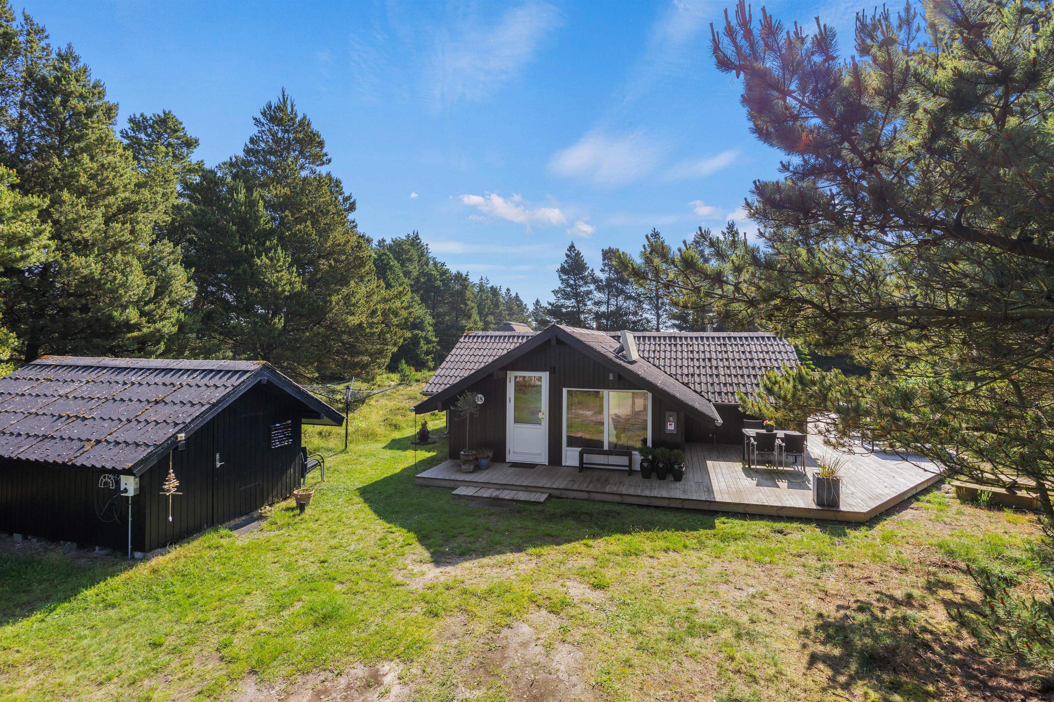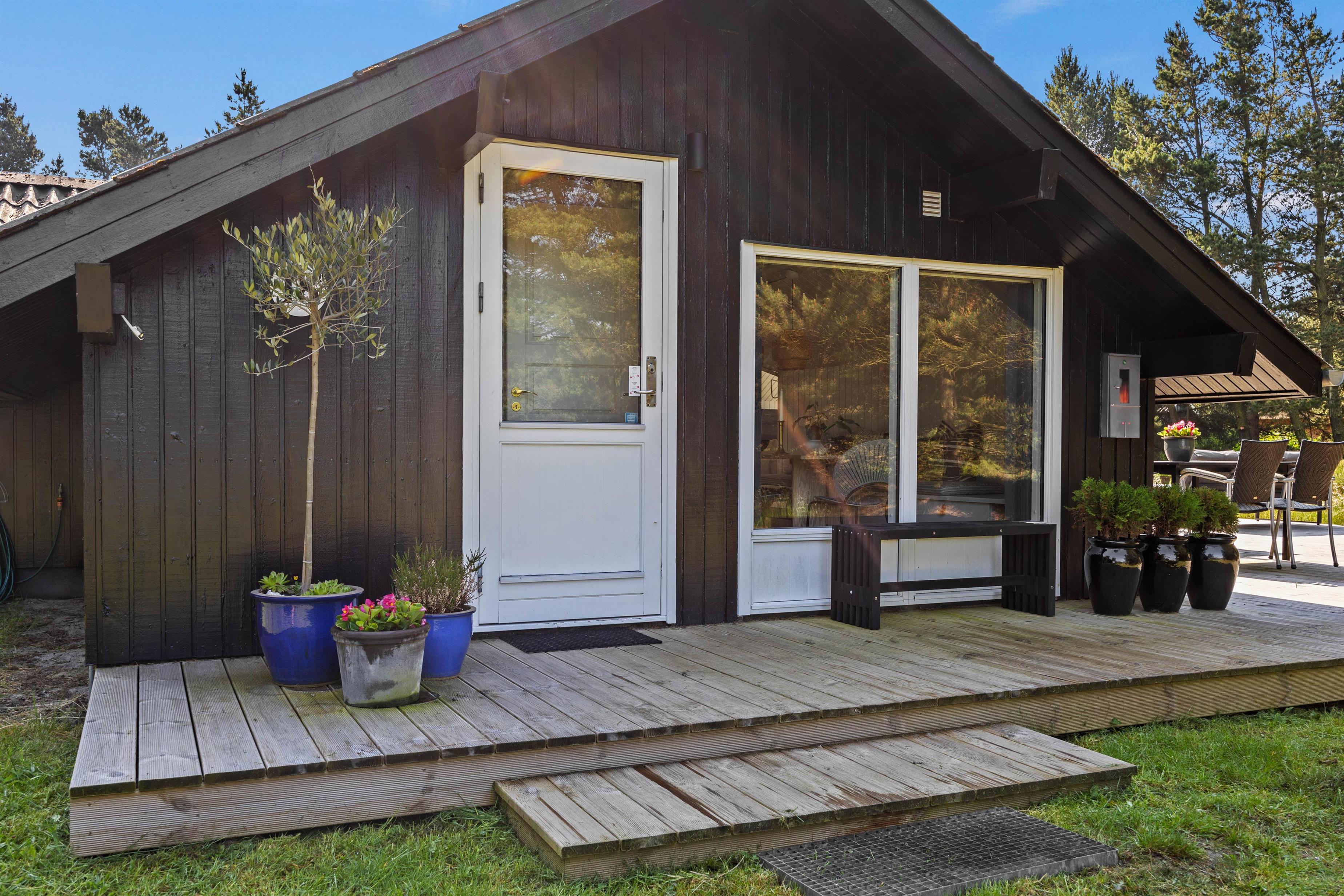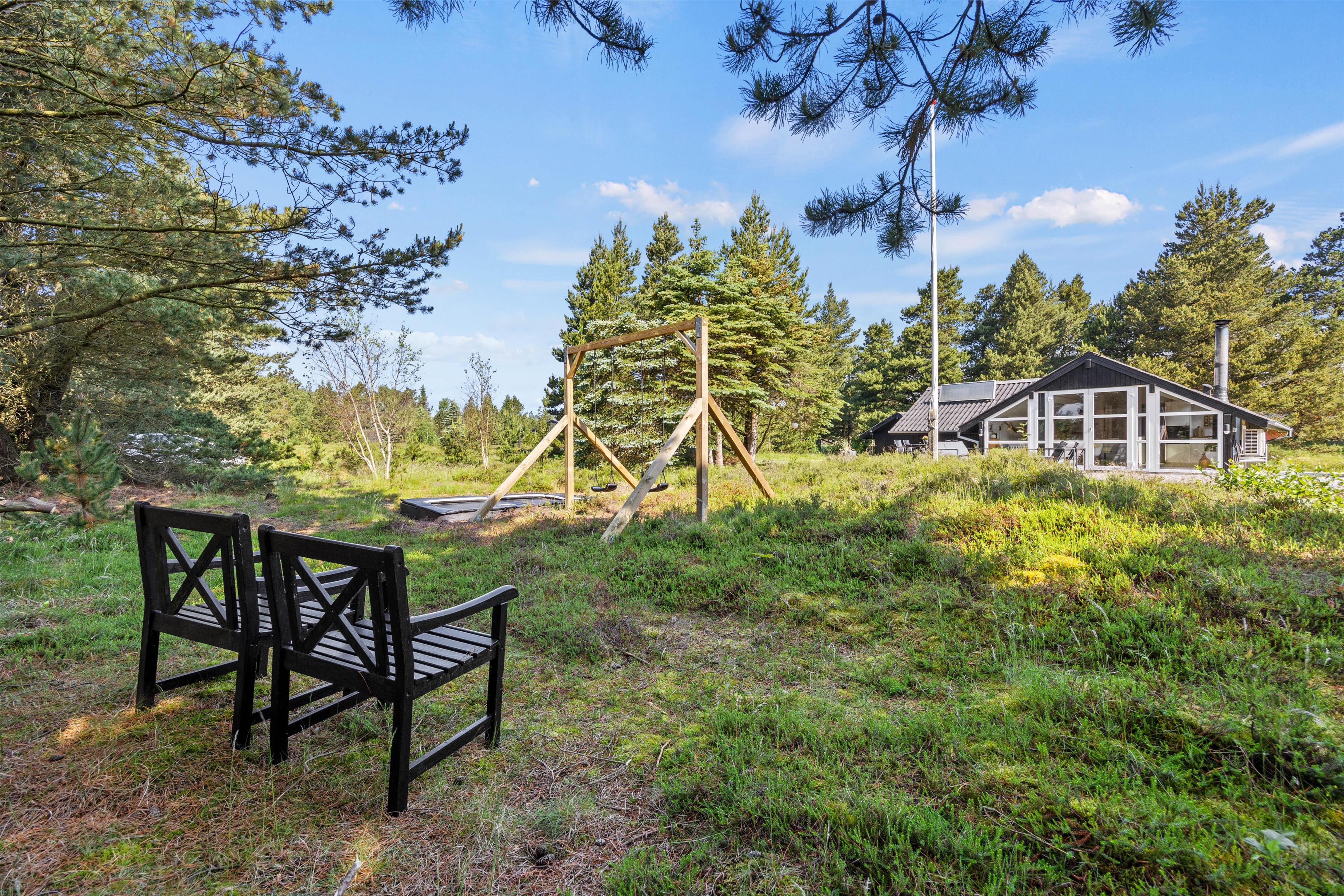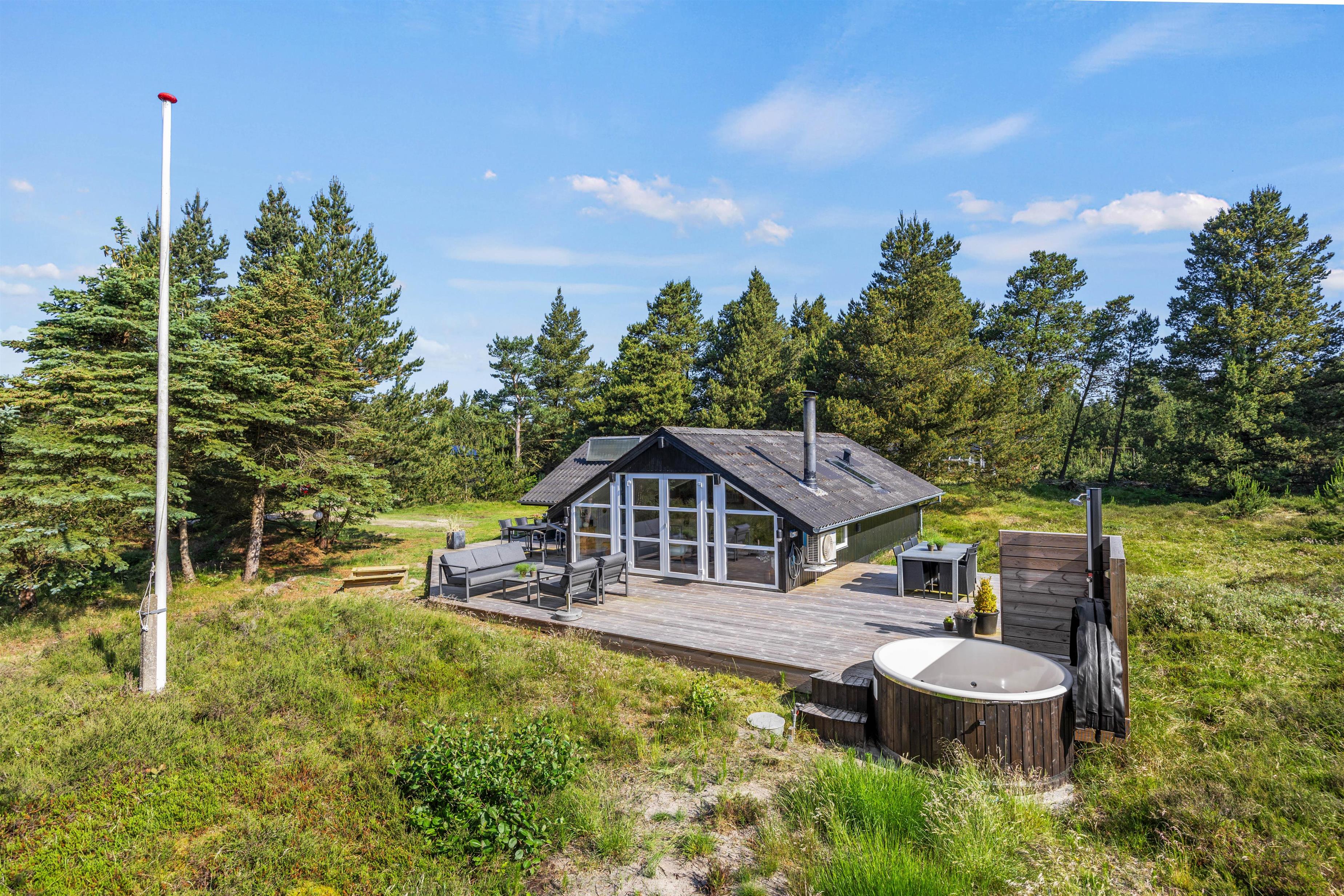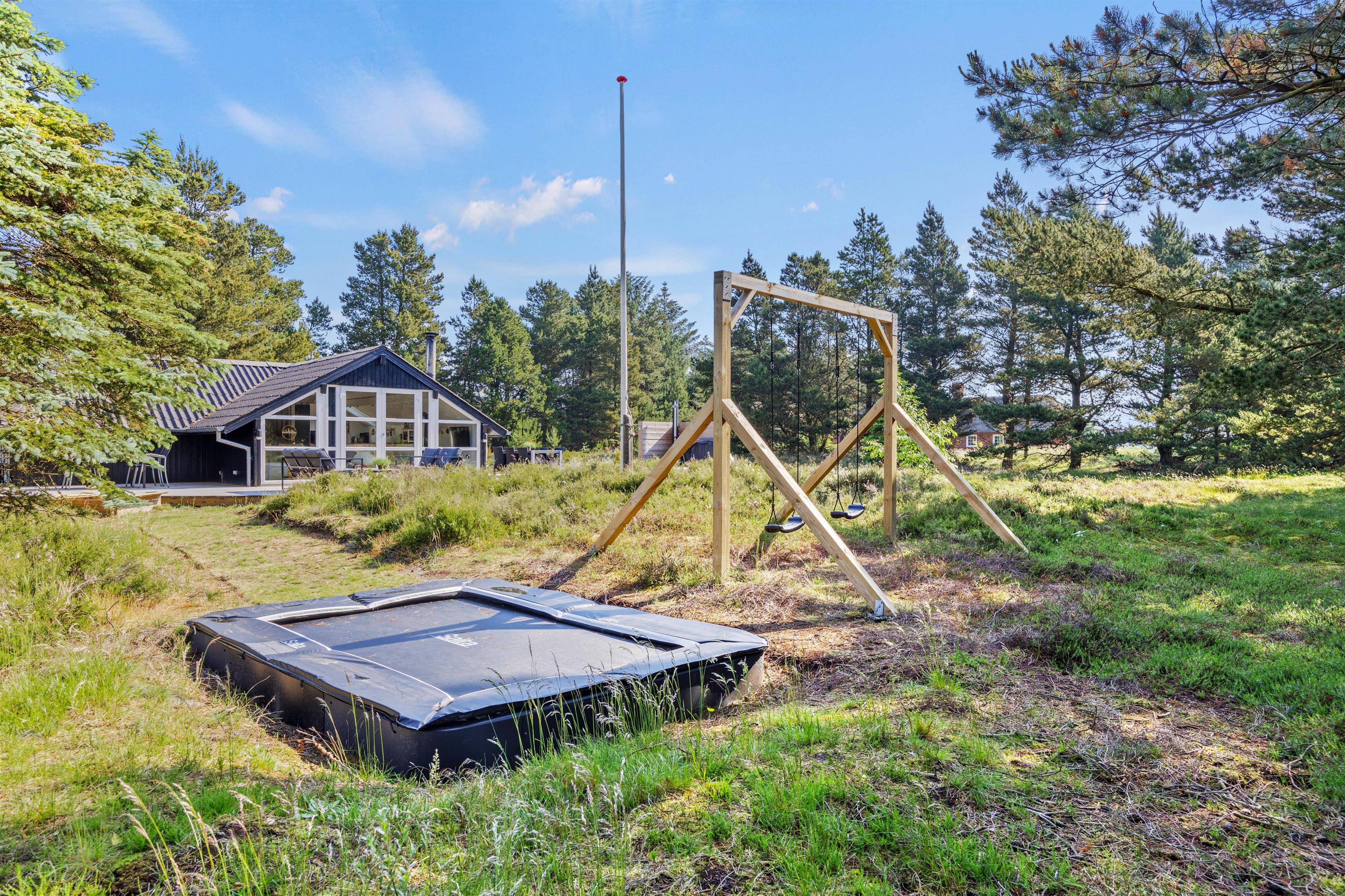 På den smukke brede træterrasse, som omgiver feriehuset, kan I tage solbad i havemøblerne eller trække jer tilbage i skyggen, hvis solen bliver for stærk. Her er mange kroge, så man kan altid finde sig en god plet, hvor man kan trække sig tilbage med sin yndlingsroman. Udsigten over den lyngklædte naturgrund er helt unik, og I kan nyde den samtidig med, at I holder øje med børnenes leg i sandkassen, gyngerne og på trampolinen. Det samme kan I fra vildmarksbadet – eller I kan benytte det i aftentimerne og nyde freden under stjernehimlen.