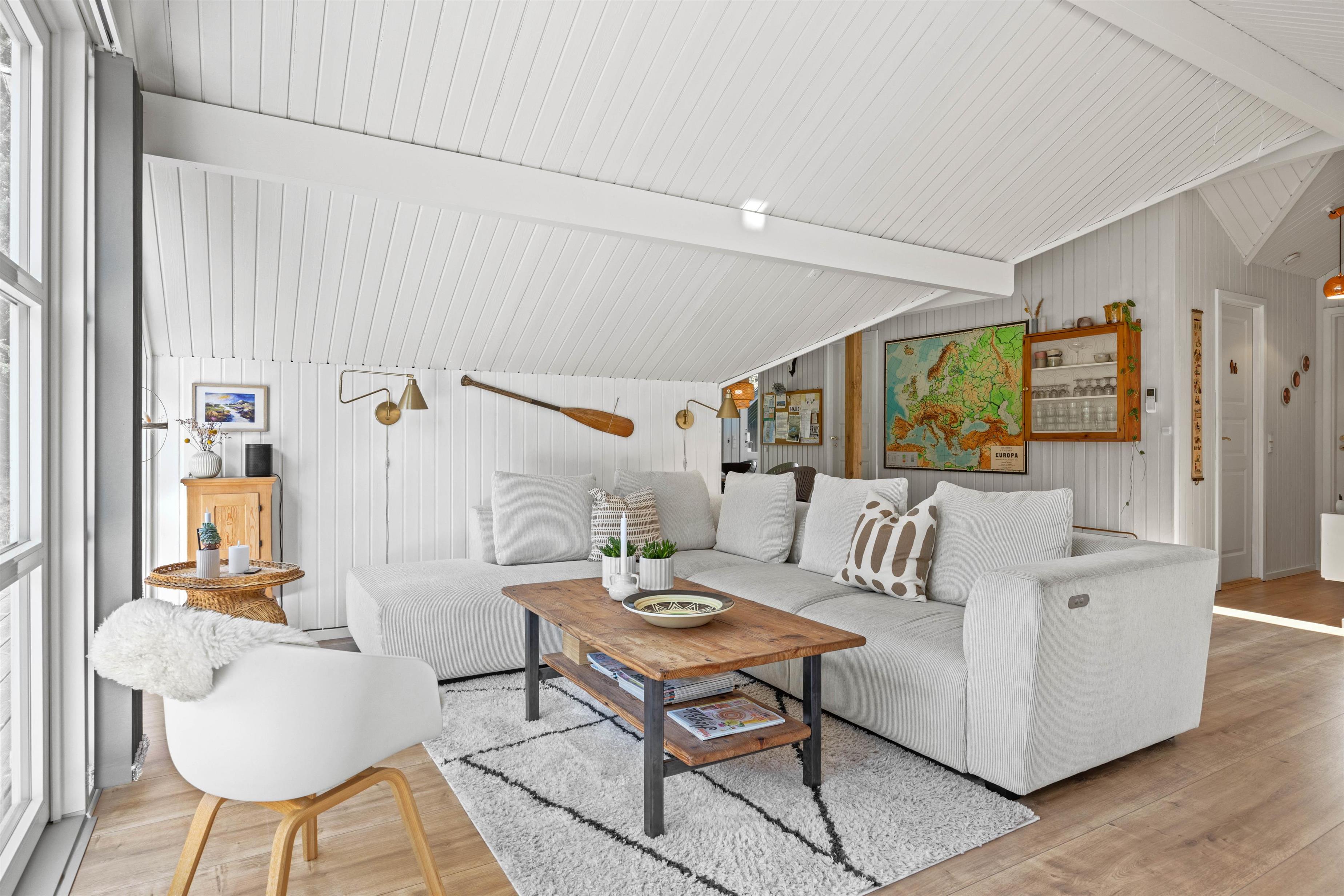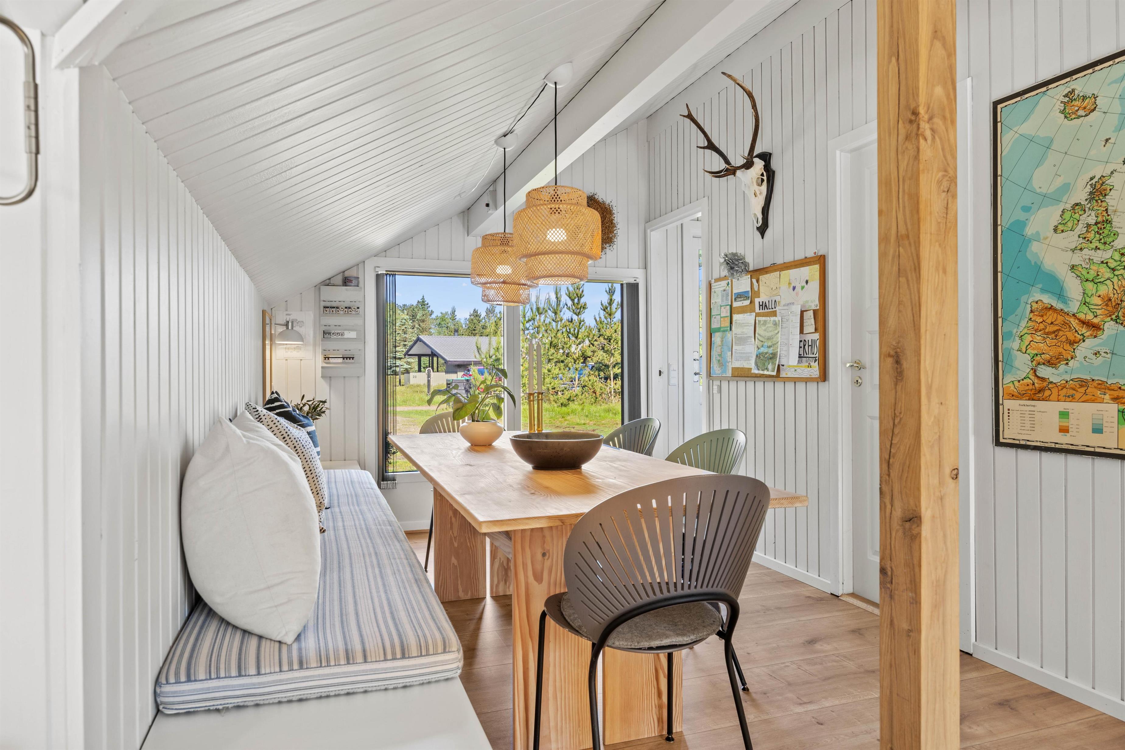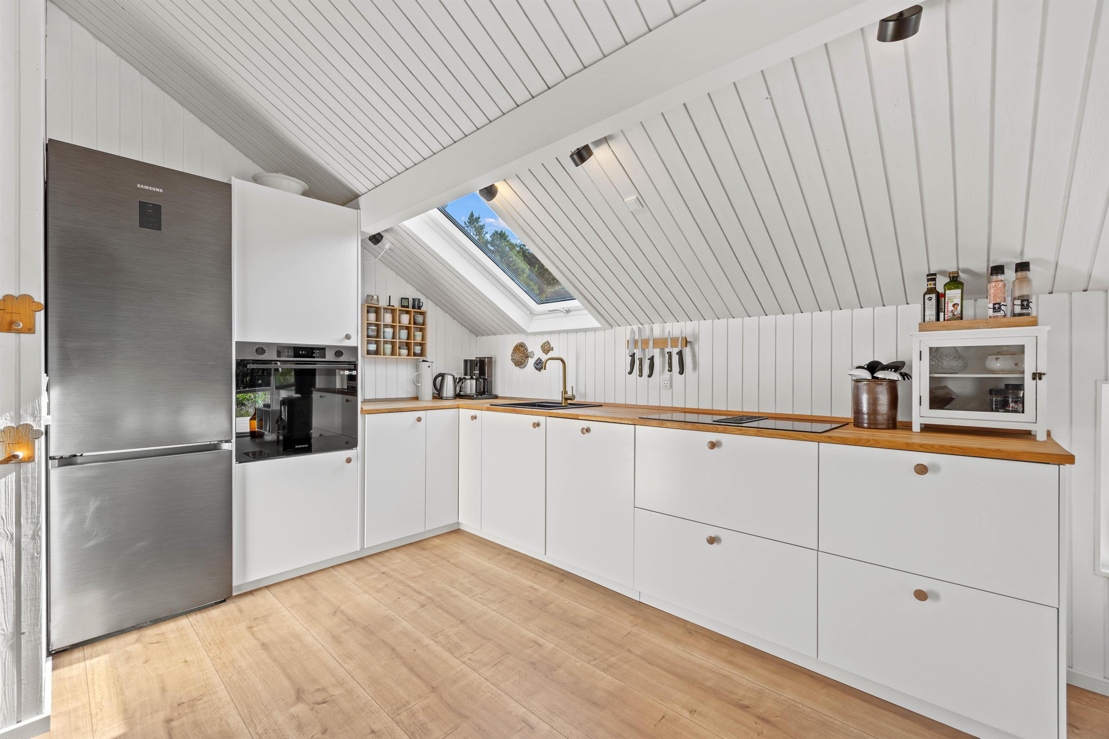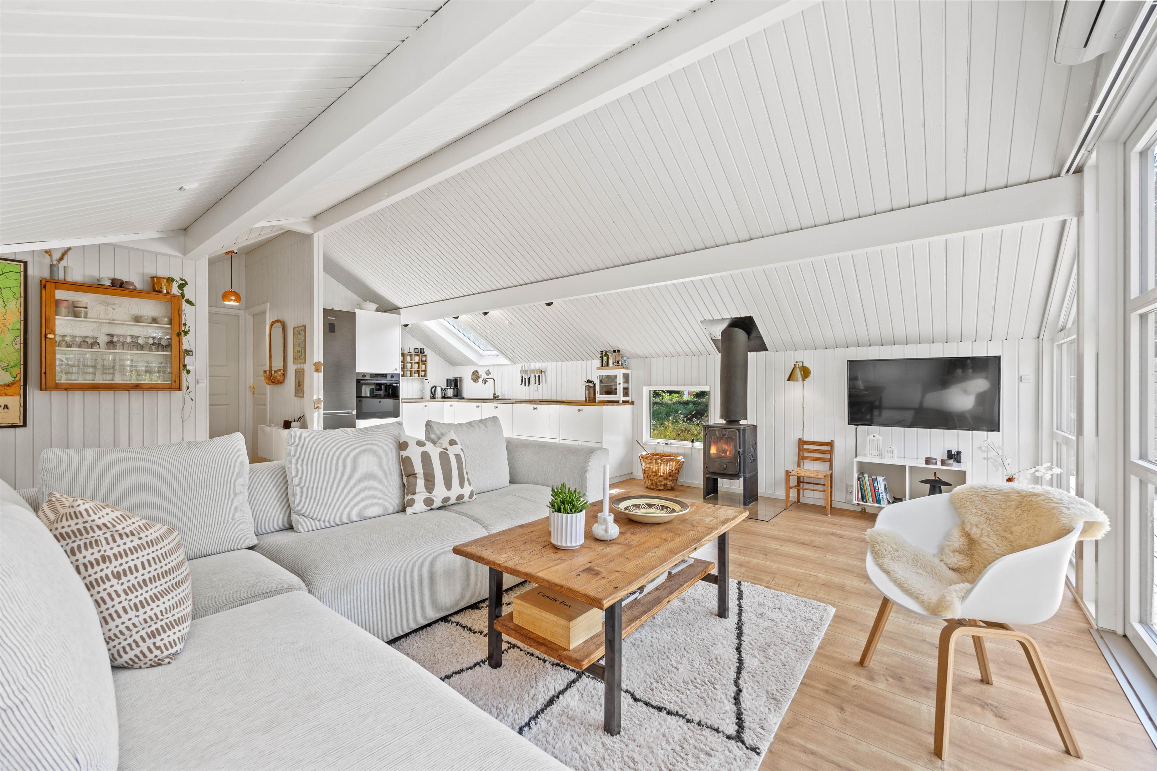 Feriestemningen melder sig straks, man træder ind ad døren til Småfolksvej 18. De lyse, træbeklædte vægge og gulve giver et dejlig let miljø, og med ild i brændeovnen kan man slappe af i sofaen og mærke fred og ro folde sig ud i rummet. Den omkostnings- og energibesparende varmepumpe sørger for behagelige temperaturer i feriehuset. Det veludstyrede køkken indeholder alt, hvad I har brug for, når I vil forkæle hinanden med lækre hjemmelavede måltider, herunder opvaskemaskine, mikrobølgeovn og en 114 liters separat fryser.