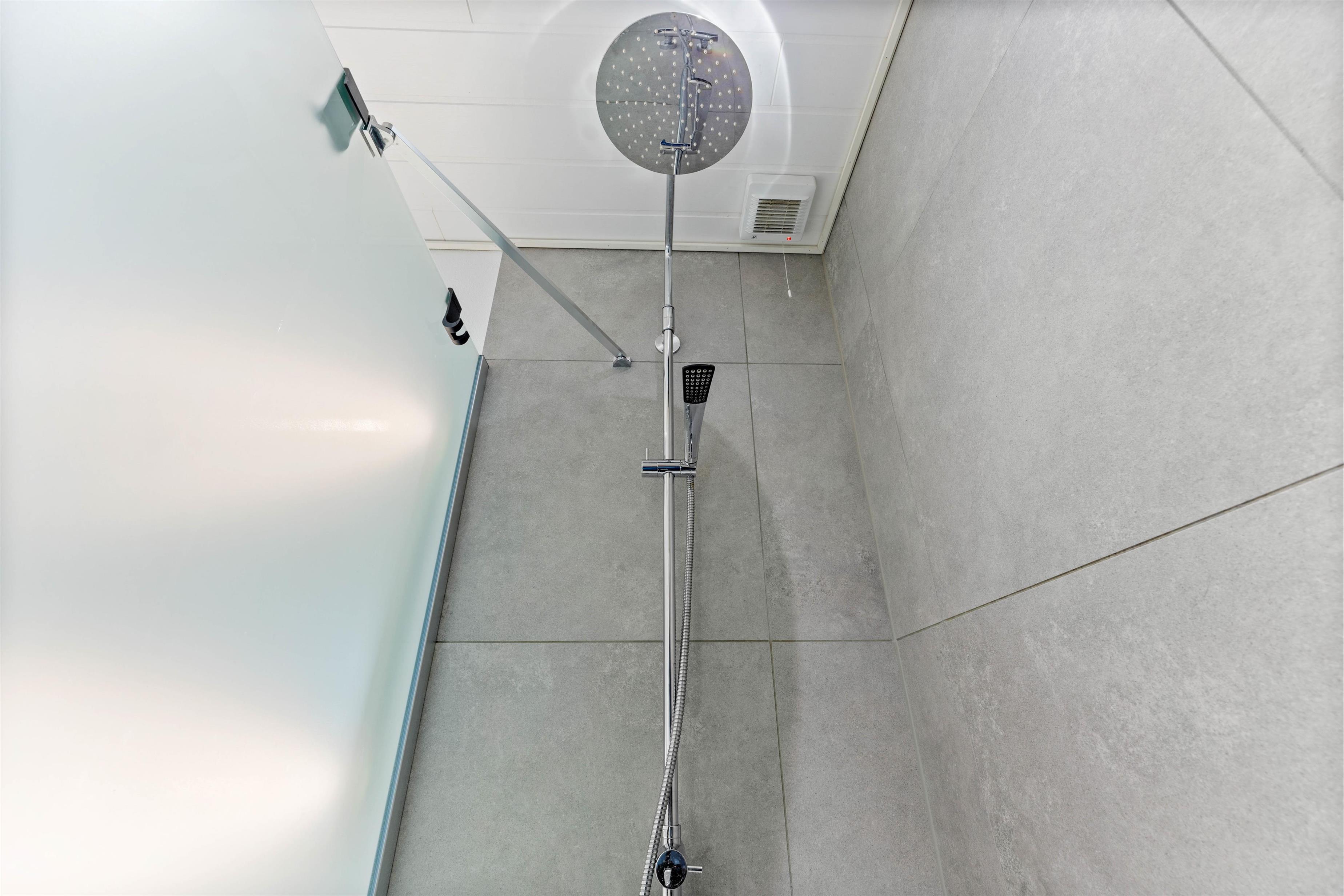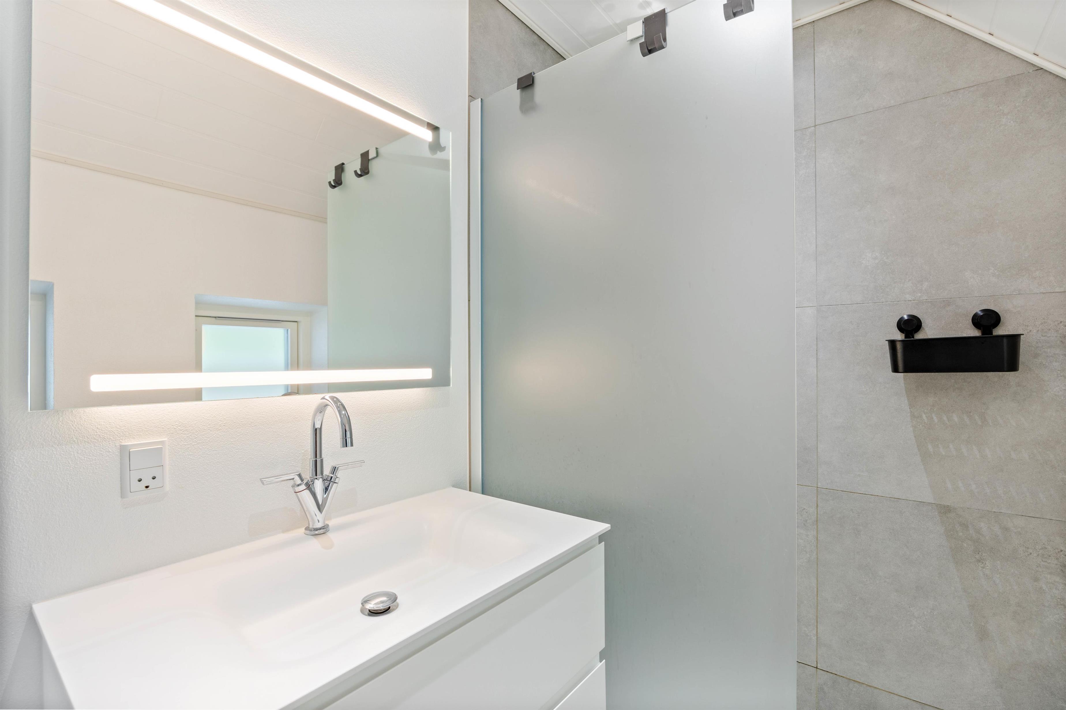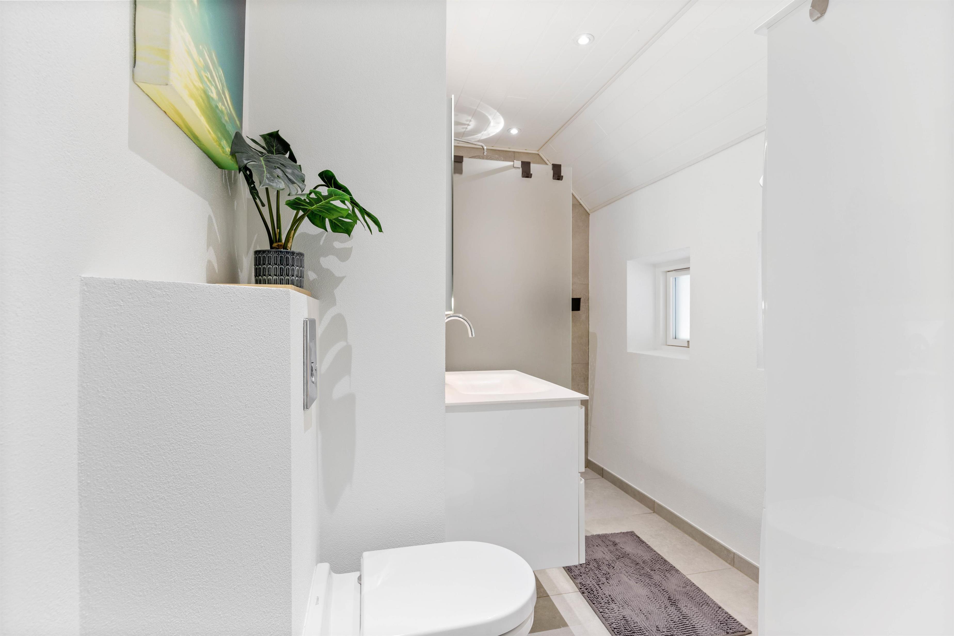 Huset har et badeværelse med en bruseniche og en regnvandsbruser samt toilet, en vaskemaskine og en tørretumbler. Gulvvarme sørger for behagelig varme.