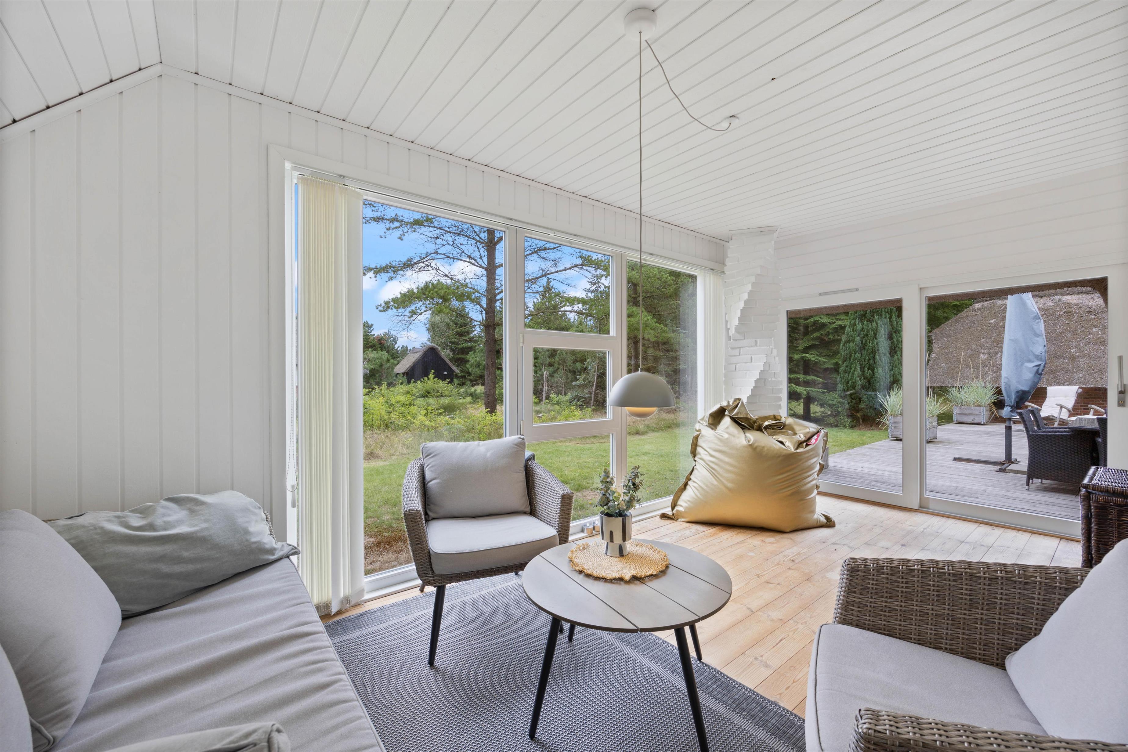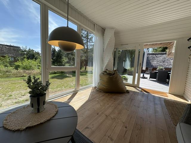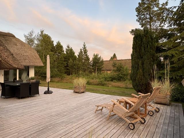 Dette smukke og yderst smagfuldt indrettede feriehus på Råbjergvej 4 på Rømø ligger på en stor, rolig naturgrund på 2654 kvadratmeter, omgivet af træer, lyng og græs. Rådyr, harer og fasaner strejfer roligt rundt i haven. Afstanden til Lakolk badestrand er kun 2600 meter, og der er ca. 650 meter til Vadehavet på Rømøs østlige kyst.