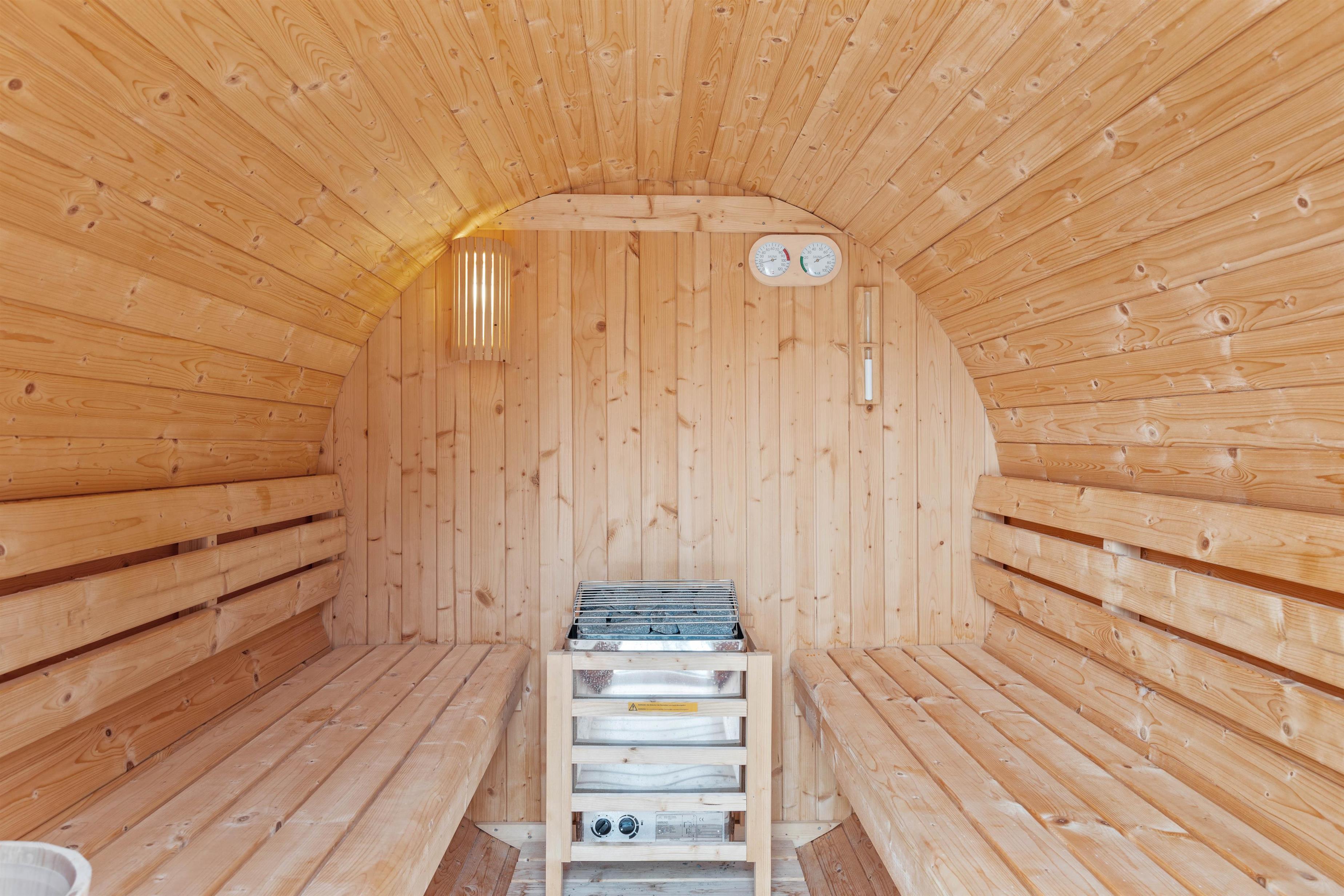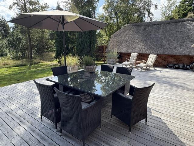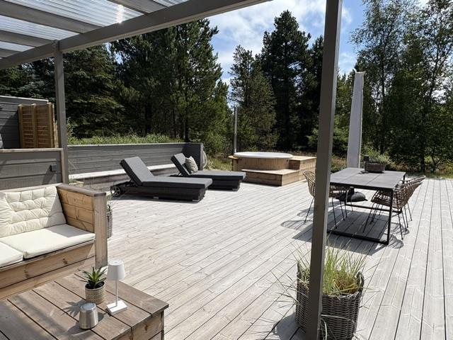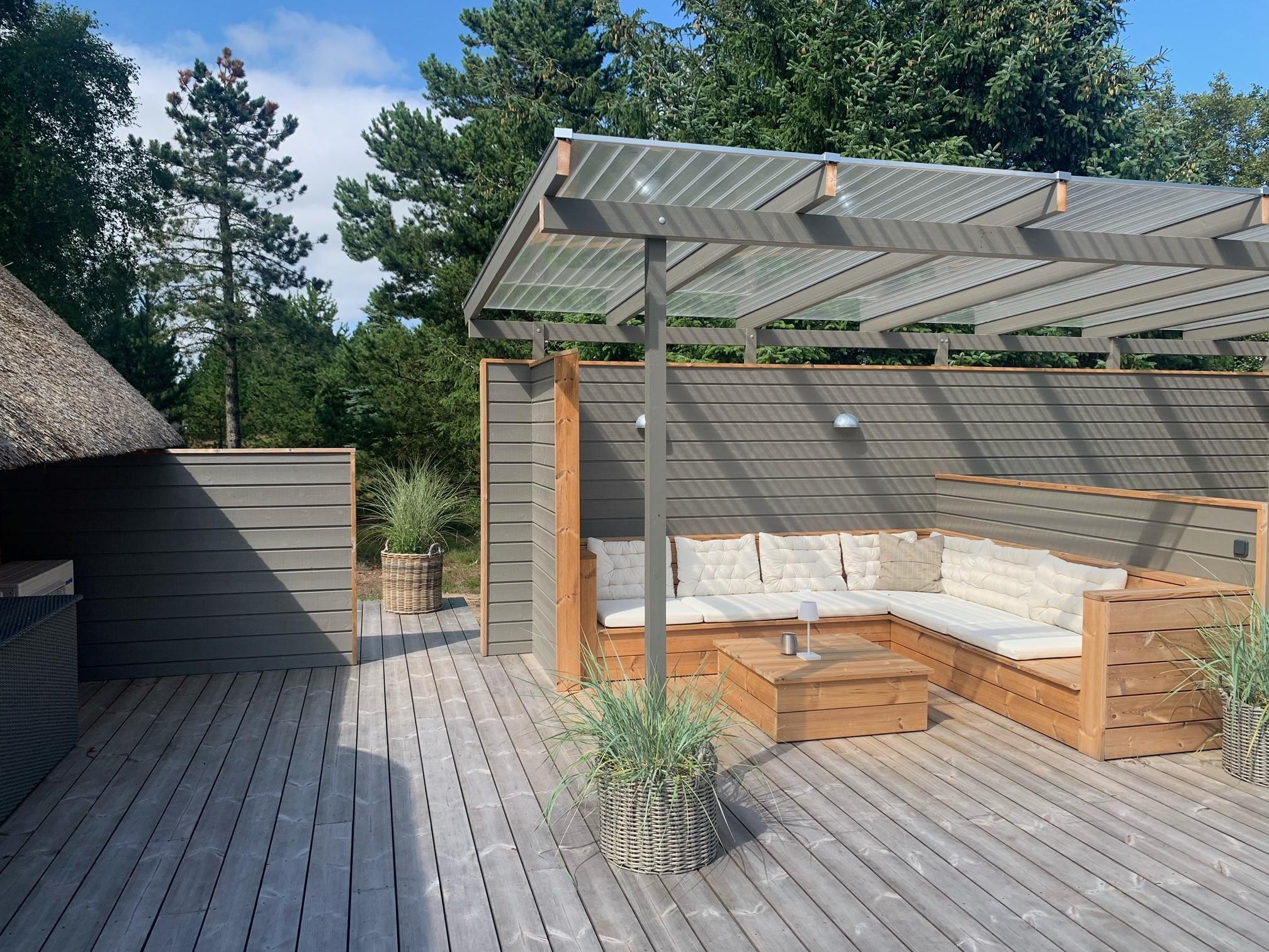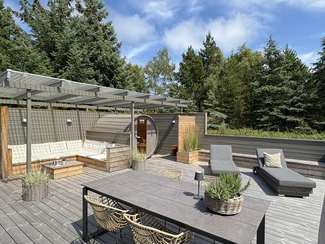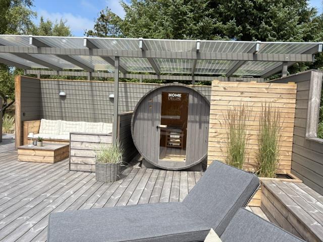 To rummelige åbne terrasseområder, beskyttet mod vind og nysgerrige øjne, inviterer dig til at blive hængende. Her kan du nyde solen og slappe af fra de tidlige morgentimer til aften. Den sydøst vendte terrasse, nybygget i 2024, er en lille wellness-oase med overdækket loungeområde med sauna og udendørs bruser. På begge terrasser (sydøst og sydvest) er der spiseborde til op til otte personer, liggestole og parasoller, så du kan vælge alt efter vejret. En kul og en gasgrill, som i er velkommen til at gøre brug af. Den engang overdækkede terrasse blev omdannet til en vinterhave.