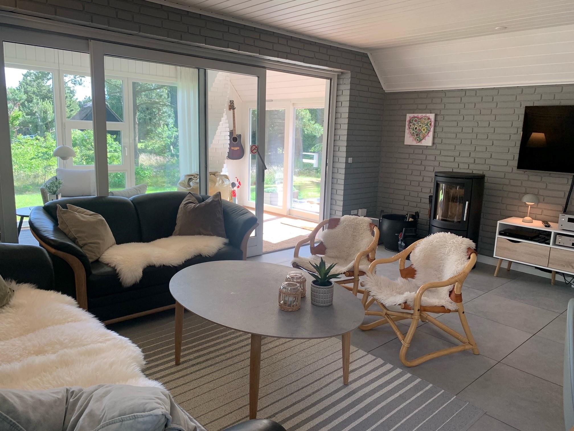 Feriehuset er udstyret med en energivenlig varmepumpe. I de køligere måneder kan den elektrisk betjente gulvvarme, der er installeret i hele huset, individuelt tændes i de relevante områder. En brændeovn sørger også for varme og hygge.
