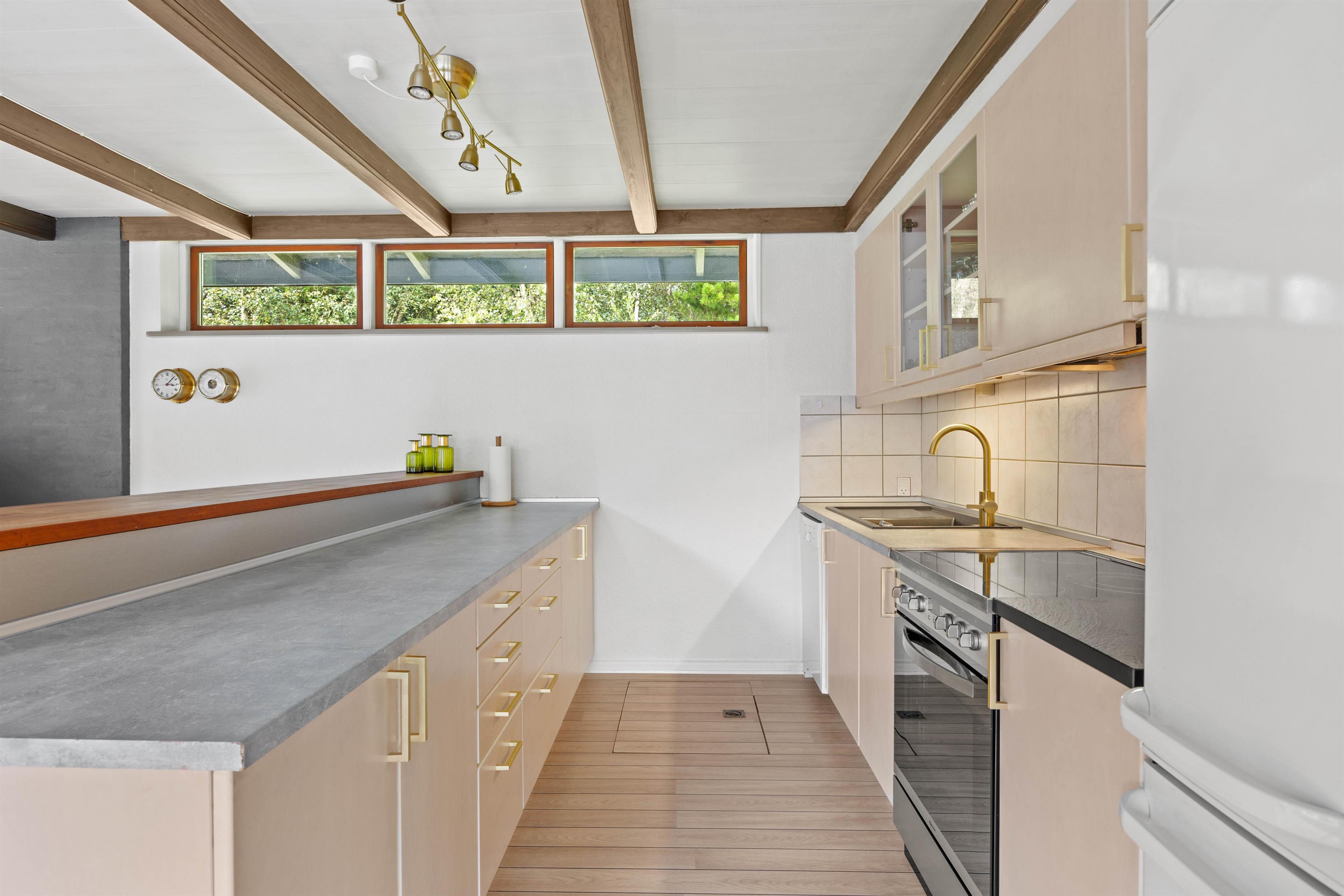 Man føler sig velkommen, straks man træder ind ad døren på Sukkertoppen 8. De fine trægulve, lyse vægge og lofter samt synlige bjælker byder velkommen, og straks du tænder op i brændeovnen, er feriestemningen i top. I stuen kan I slappe af sammen i sofagruppen, eller du kan slænge dig på chaiselongen med en god bog eller bare nyde udsigten over naturgrunden. I kan også vælge at se en film via chromecast. Det åbne køkken indeholder alt, hvad I behøver til at forkæle hinanden med hjemmelavede måltider. Ved spisebordet kan I både nyde varmen fra brændeovnen og være i dialog med dem, som har gang i køkkenet.