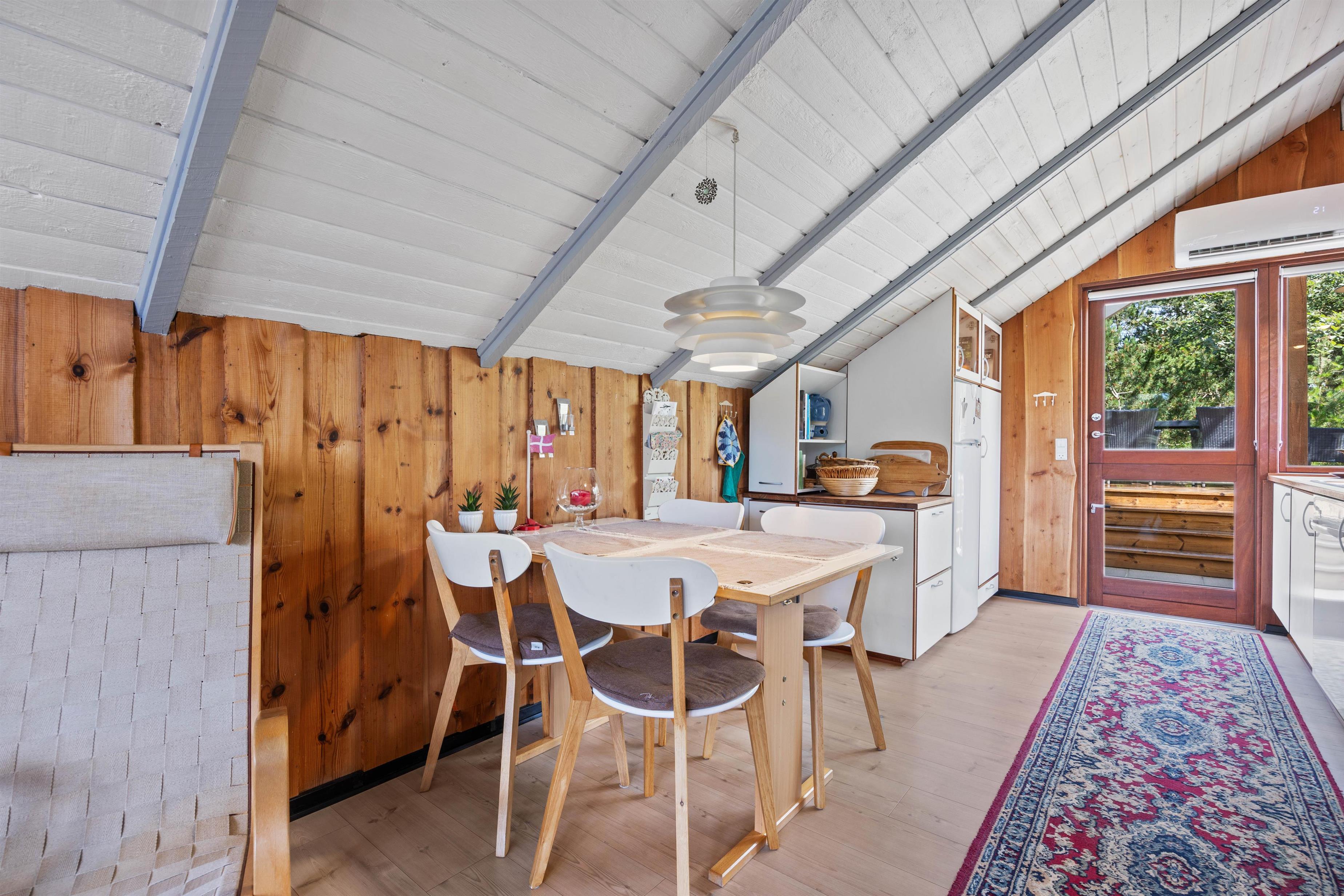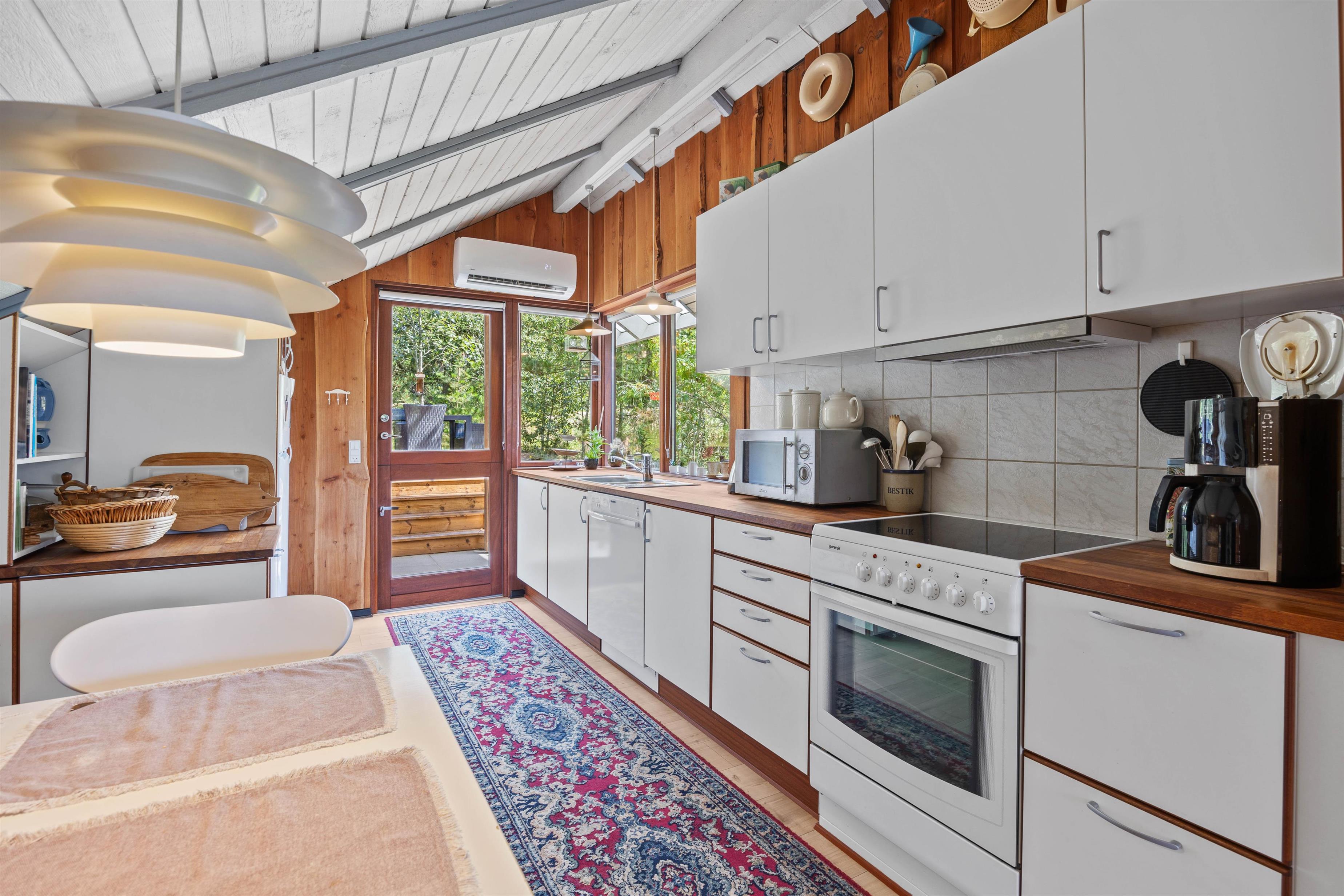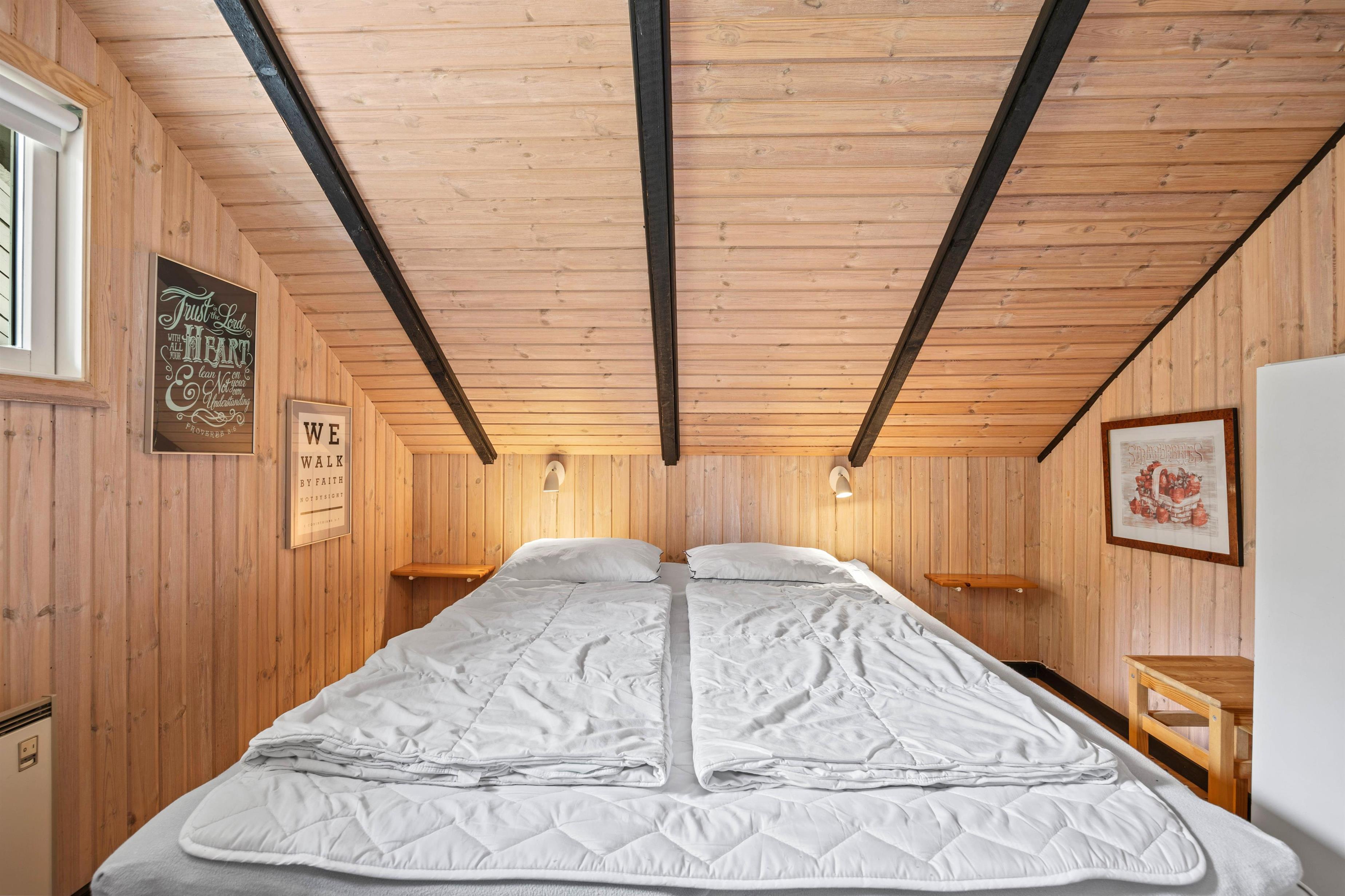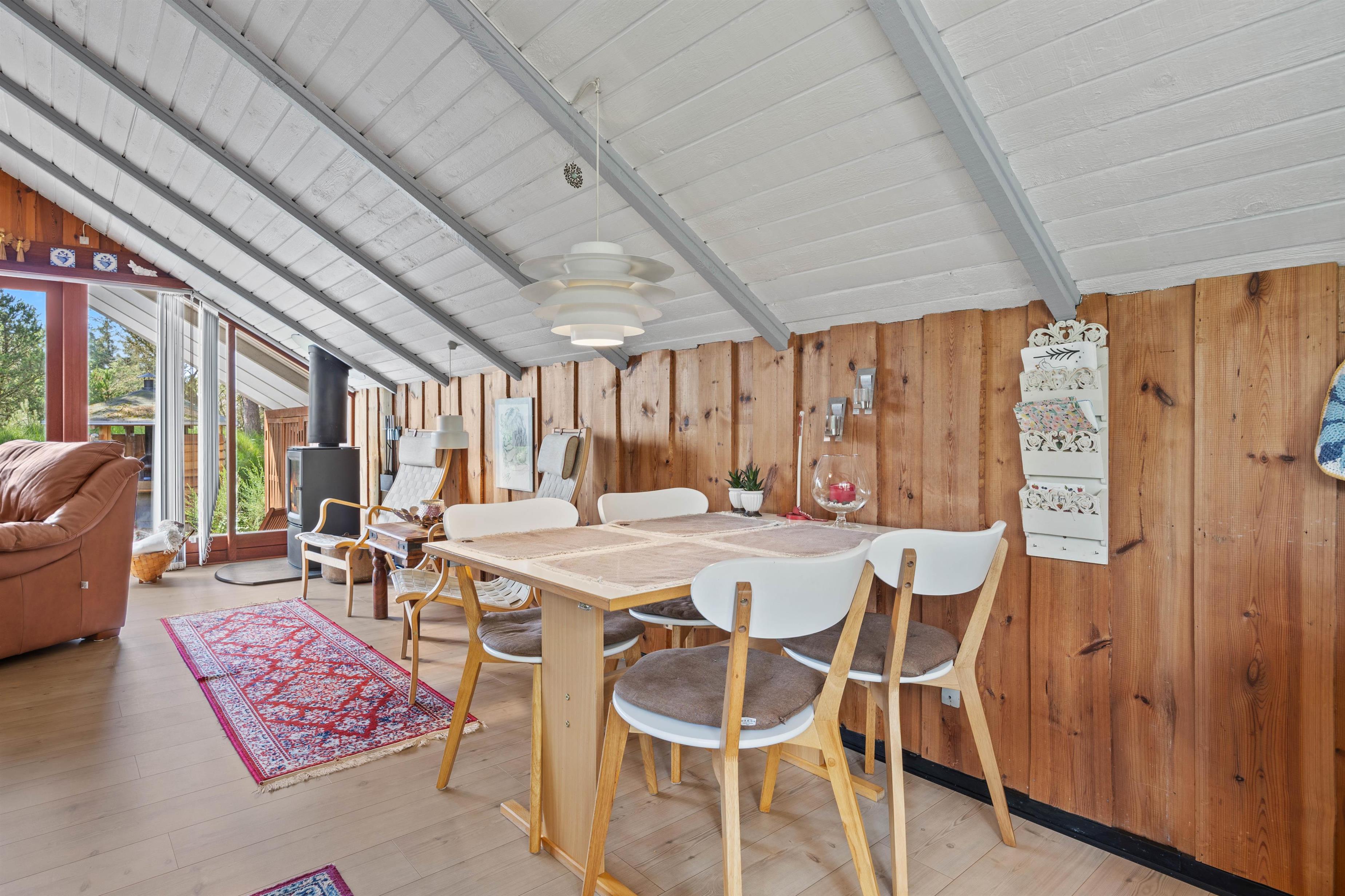 Hjerterummet er opholdsrummet, hvor stue, køkken og spiseplads er i åben forbindelse. Ligesom i resten af sommerhuset er her også loft til kip, varme trænuancer og komfortable møbler. Som et plus er her både brændeovn og en energibesparende varmepumpe, som sørger for et godt indeklima. Sid foran brændeovnen med en god bog, lav dejlig mad i køkkenet eller spil brætspil – mulighederne er mange. Nyd tiden med familien efter en spændende dag med gode oplevelser.