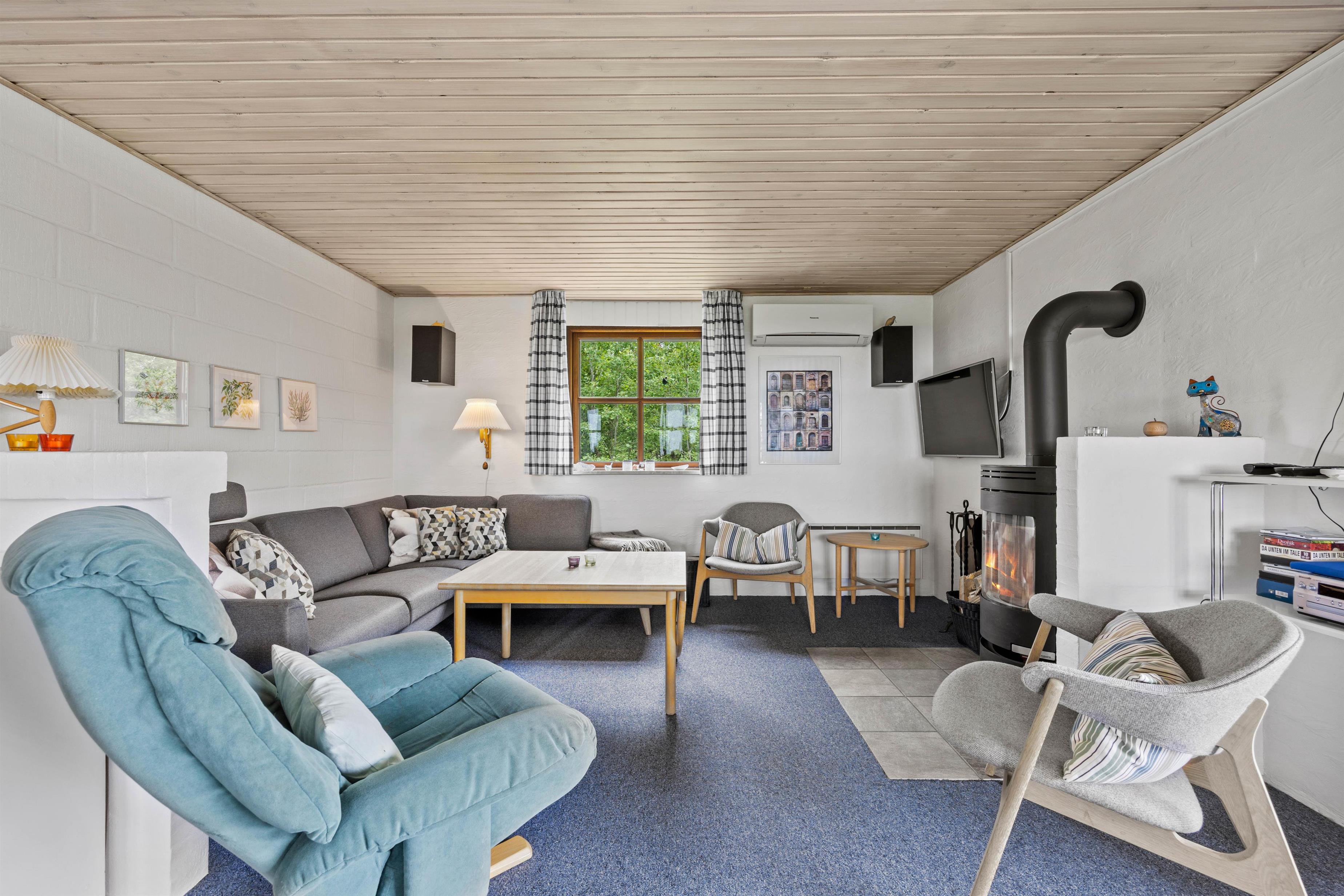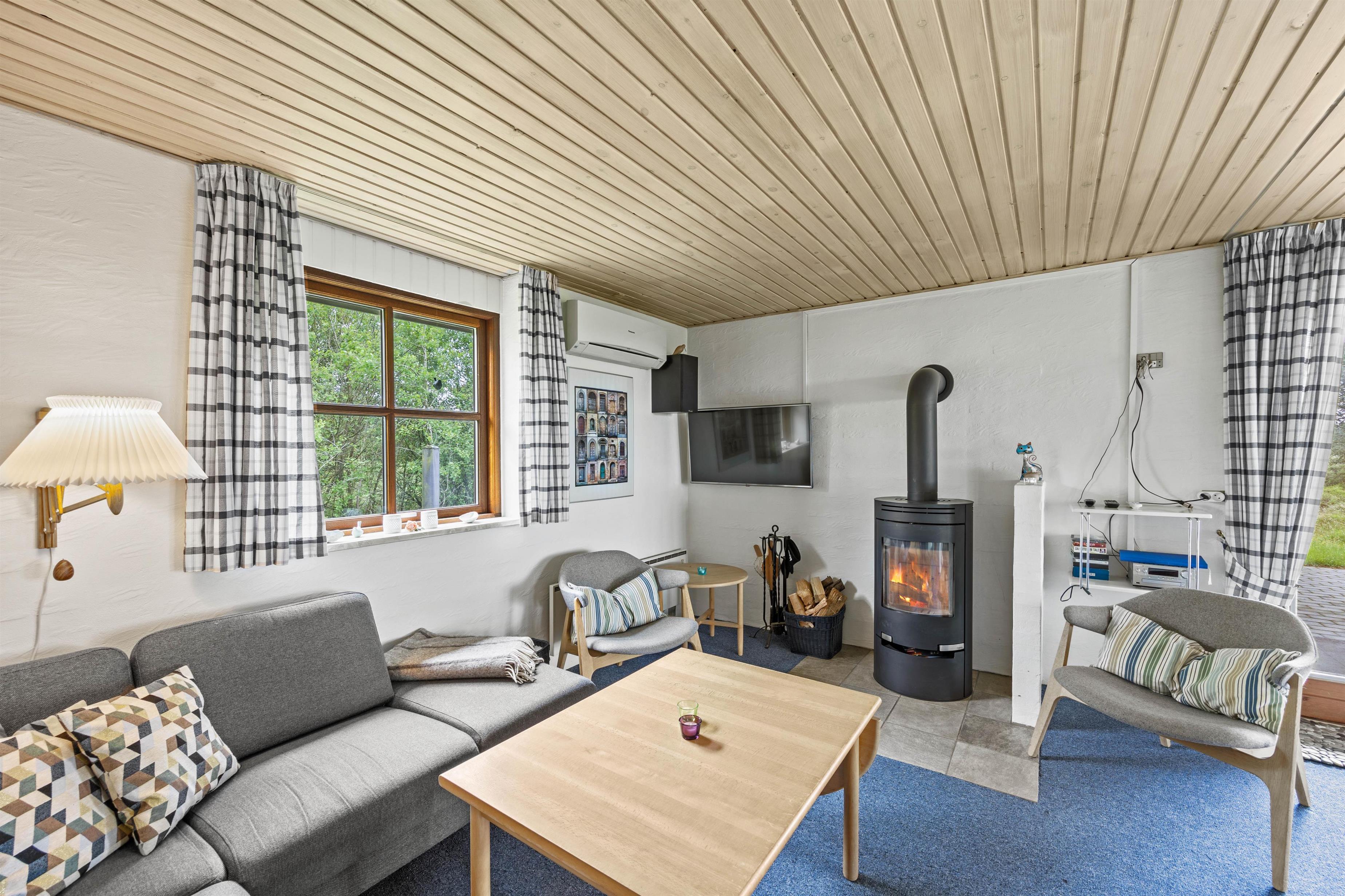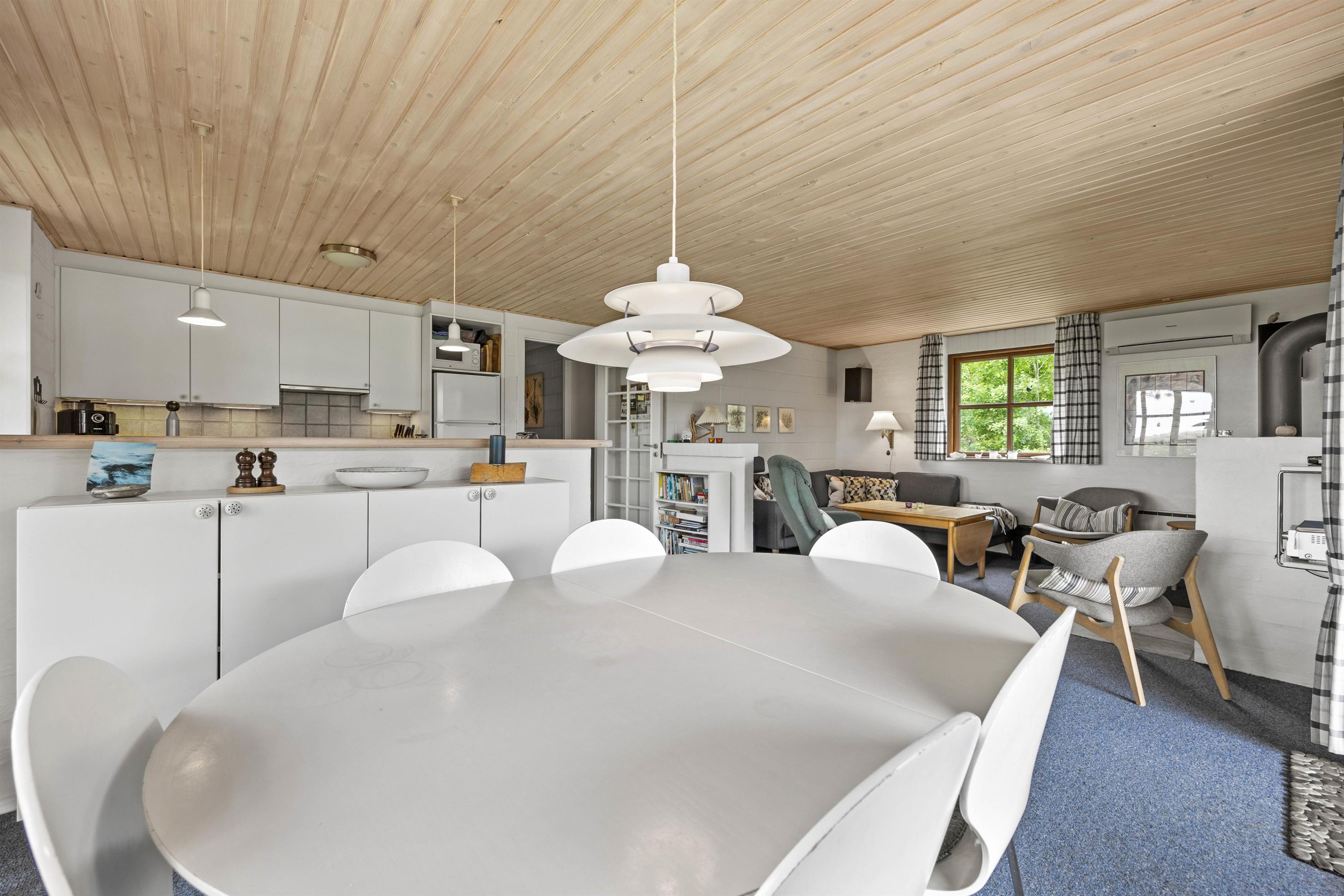 Helt nede i bunden af vejen ligger dette fine sommerhus på 109 m², hvor der er plads til seks gæster. Her er familiens firbenede venner også meget velkommen! Et funktionelt indrettet feriehus hvor I kan koble af. Alrummet er feriehusets midtpunkt og indbyder til dejlige stunder med de nærmeste. I køkkenet kan I sammen trylle lækre retter, mens andre kan samles omkring et spil i sofaen. De store vinduespartier mod terrassen giver jer en god udsigt over naturgrunden, som I kan nyde, mens I varmer jer ved brændeovnen. Desuden har feriehuset også en energibesparende varmepumpe, der sørger for et behageligt indeklima.