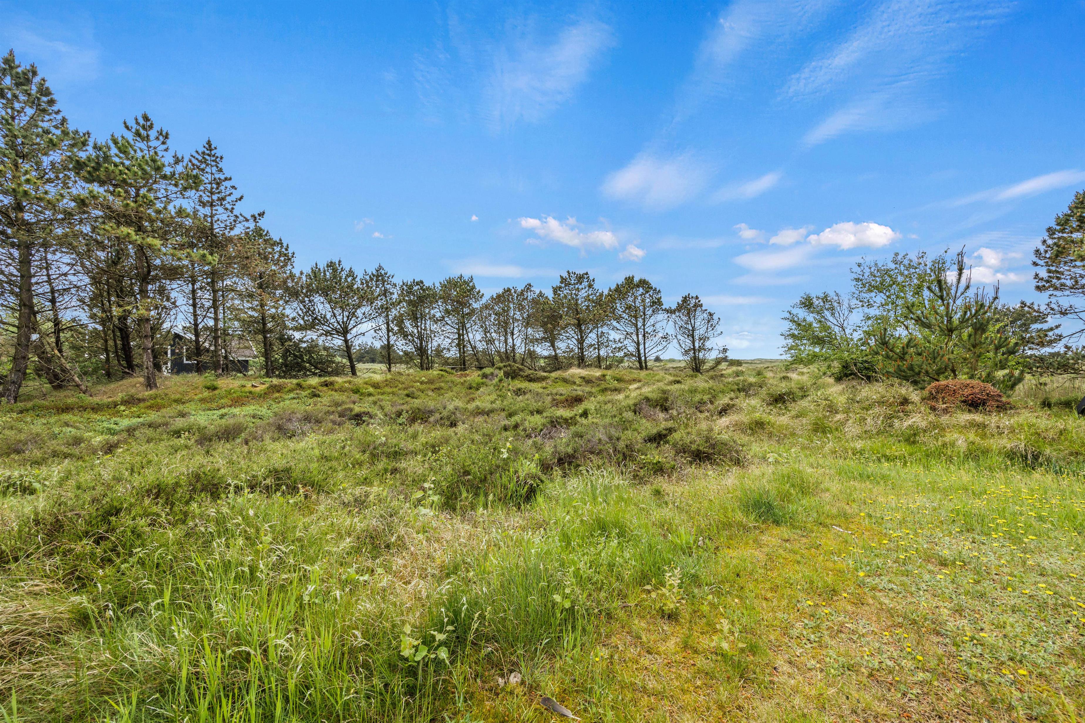 På sydsiden af feriehuset finder I terrassen. Her er I afskærmet for naboer og har den flotteste udsigt udover den lyngebeklædte hede. Udenfor er der både plads til morgenkaffe på terrassen eller boldspil på græsplænen. Fredfyldte omgivelser, hvor I kan slappe af og nyde roen. Til de mindste er her sandkasse og gynger.