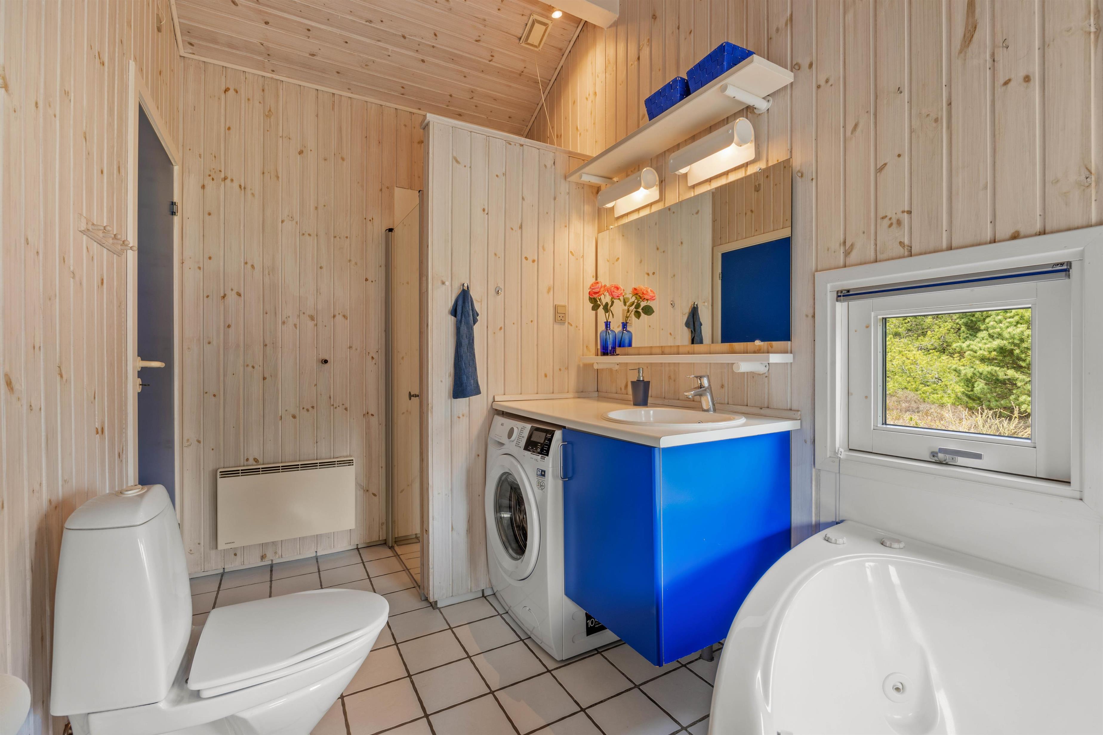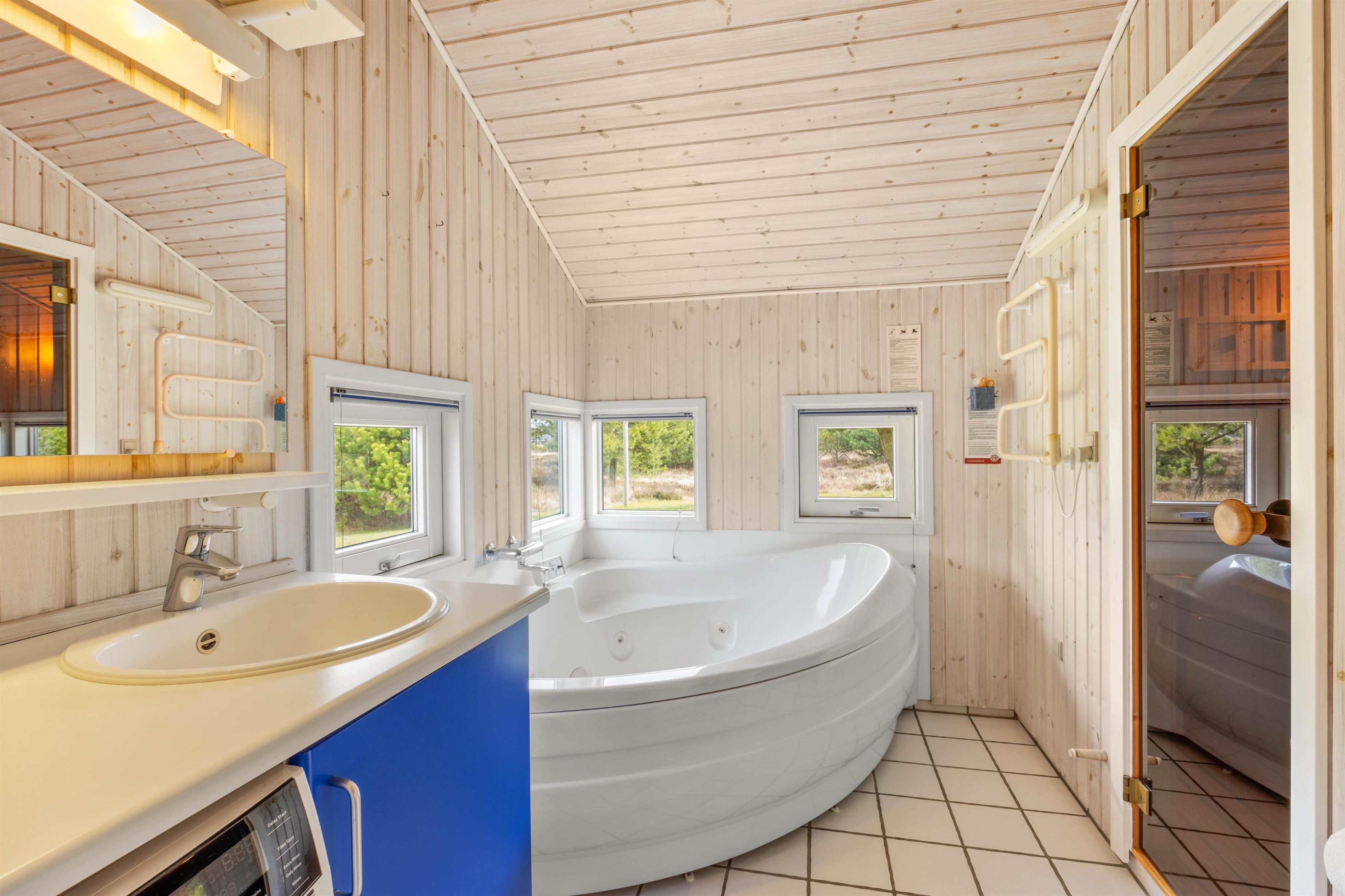 Det rummelige badeværelse har både sauna og spa. Her kan I slappe af og blive varmet igennem efter en lang tur i naturen. Således afslappede kan I sove rigtigt godt i et af de 2 soveværelser med dobbeltsenge – Vesterhavsluften gør noget ekstra godt for nattesøvnen. Der er både opvaskemaskine og vaskemaskine i sommerhuset, så I kan føle jer hjemme her midt i naturen.
