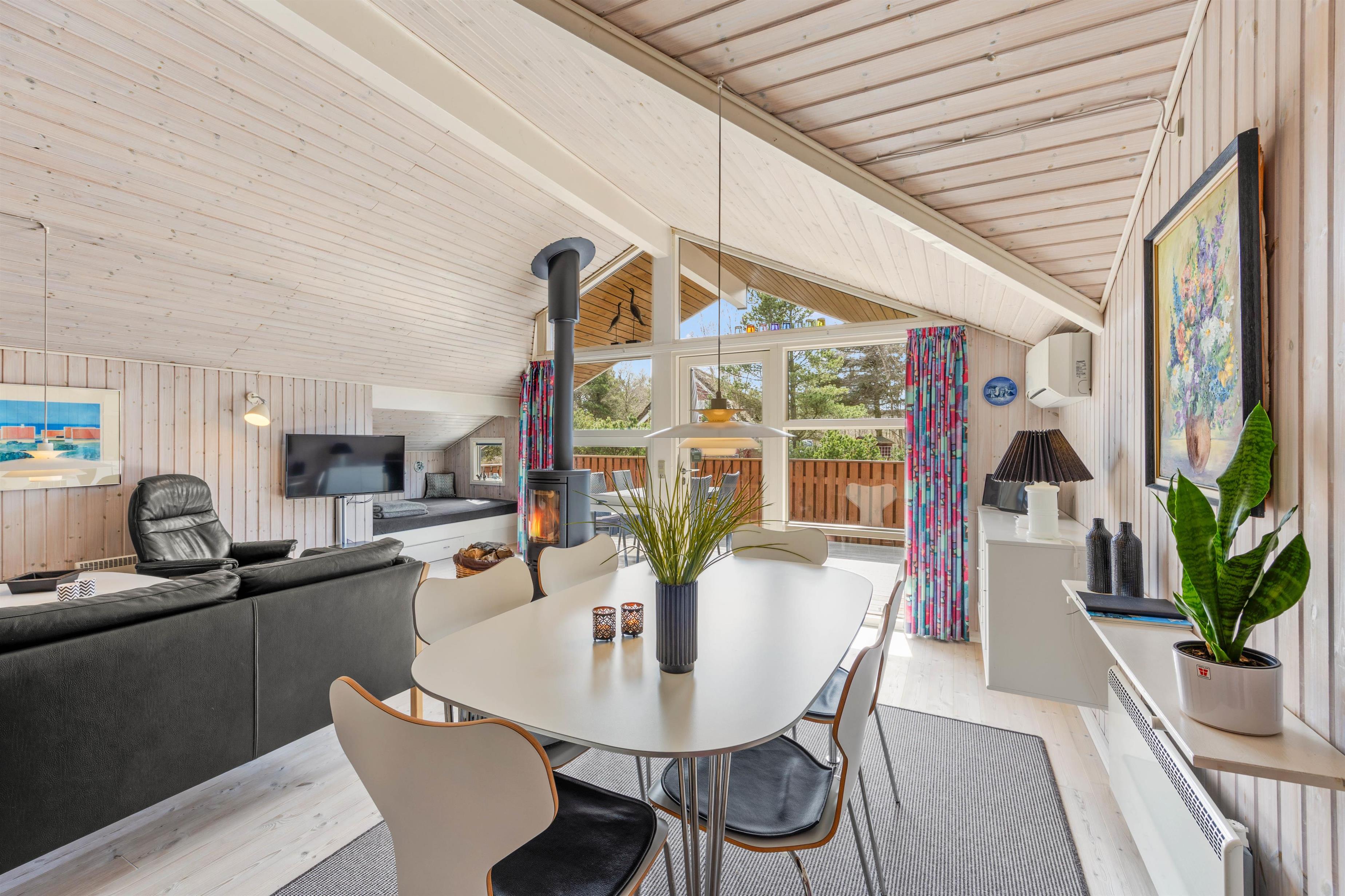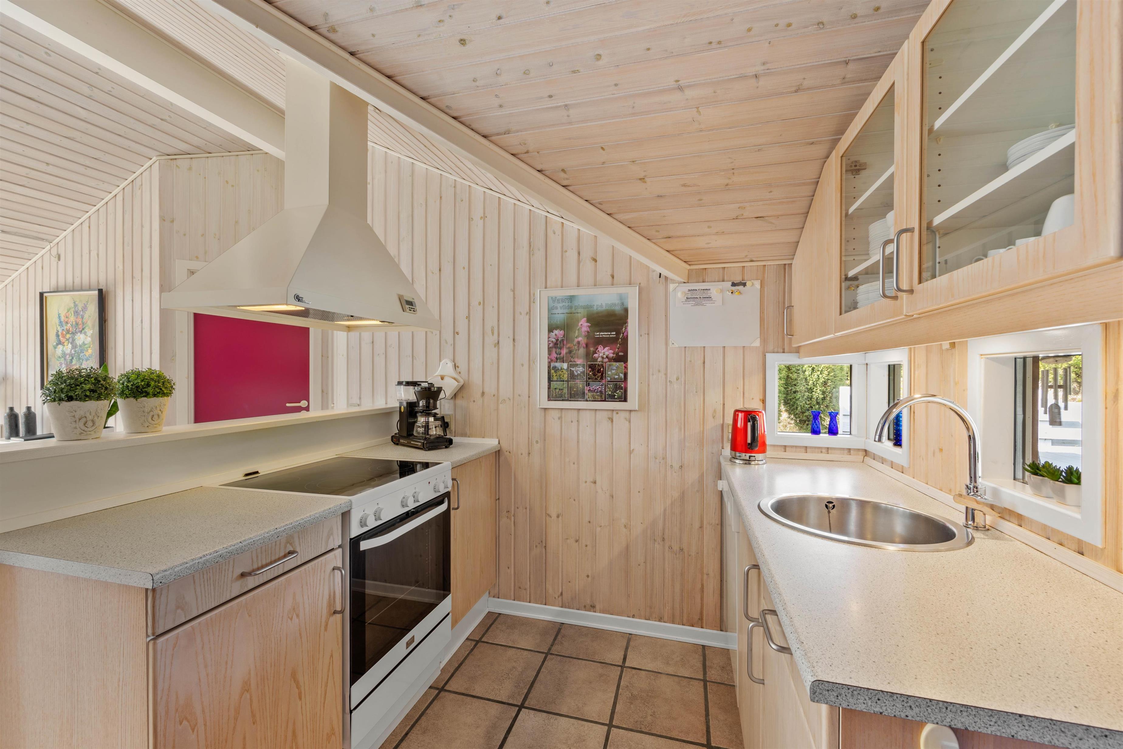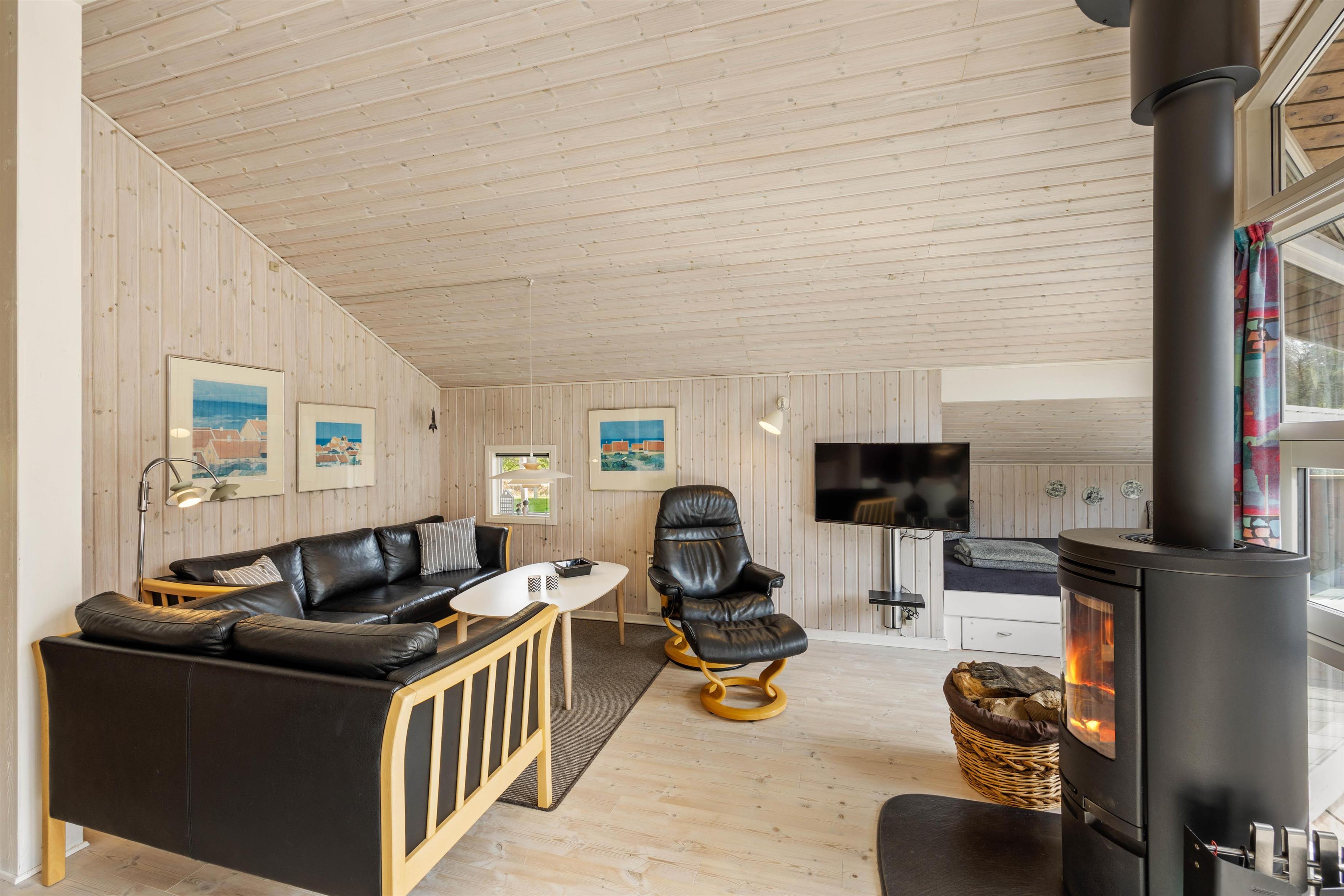 Det lille køkken, med gulvvarme, er åbent i forbindelse med spiseplads og sofagruppe. Her er alt, hvad I behøver for at tilberede lækre måltider, hygge jer foran brændeovnen ved spisebordet eller i sofaen med en god bog og en kop kaffe. Her er endda en alkove, hvis du får brug for et hvil midt på dagen. Sommerhusets mange vinkler og kroge i sammensætning med de lyse, træbeklædte vægge og lofter op i kip giver luft, hygge og feriestemning. På kølige dage eller mørke aftener er det nærliggende at tænde op i brændeovnen, lægge fødderne op og hygge sig sammen om et spil yatzy og et glas vin.