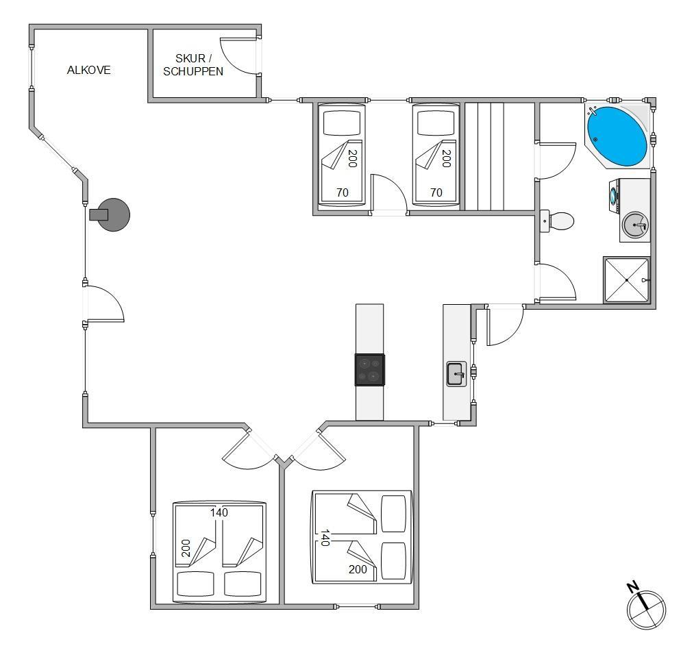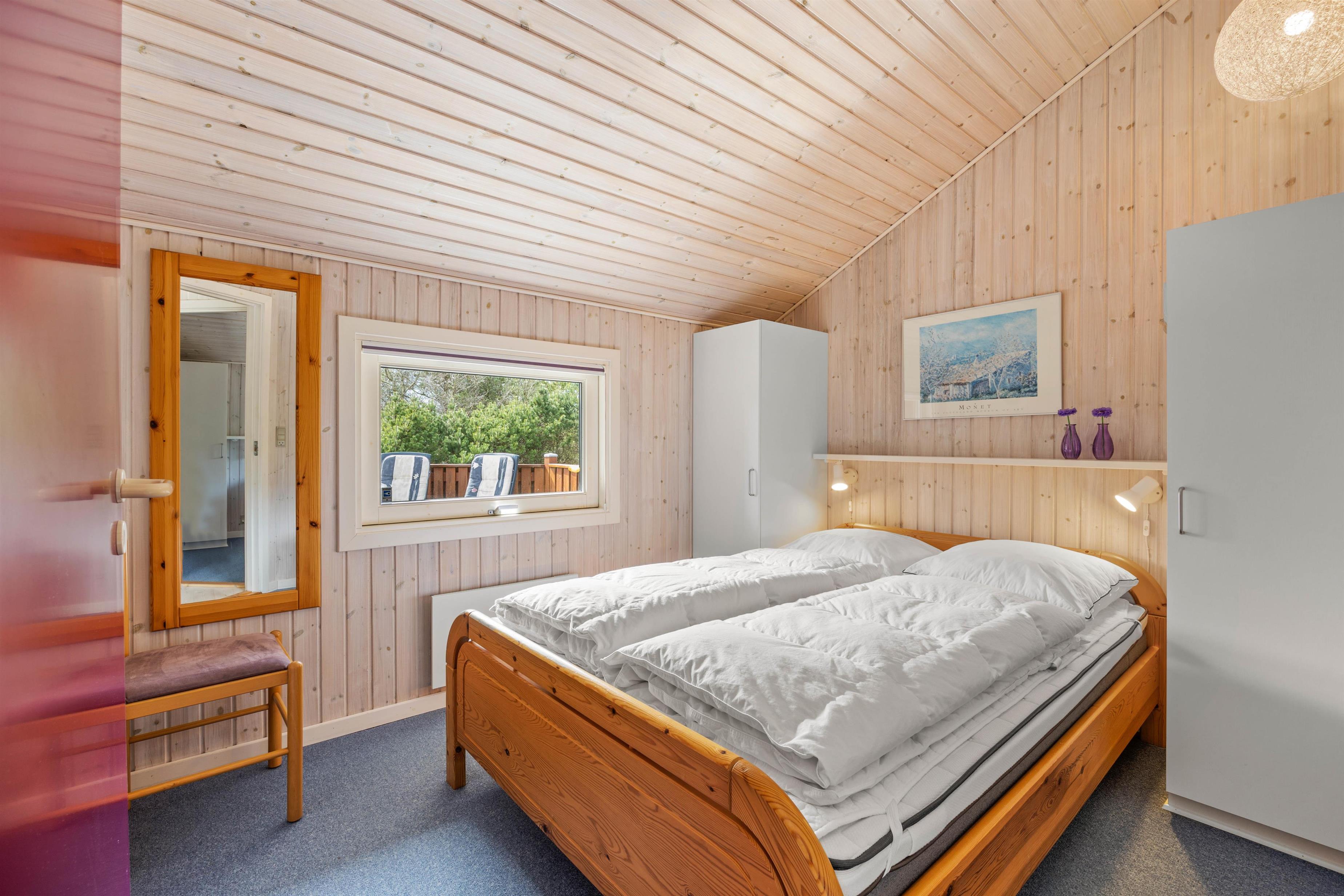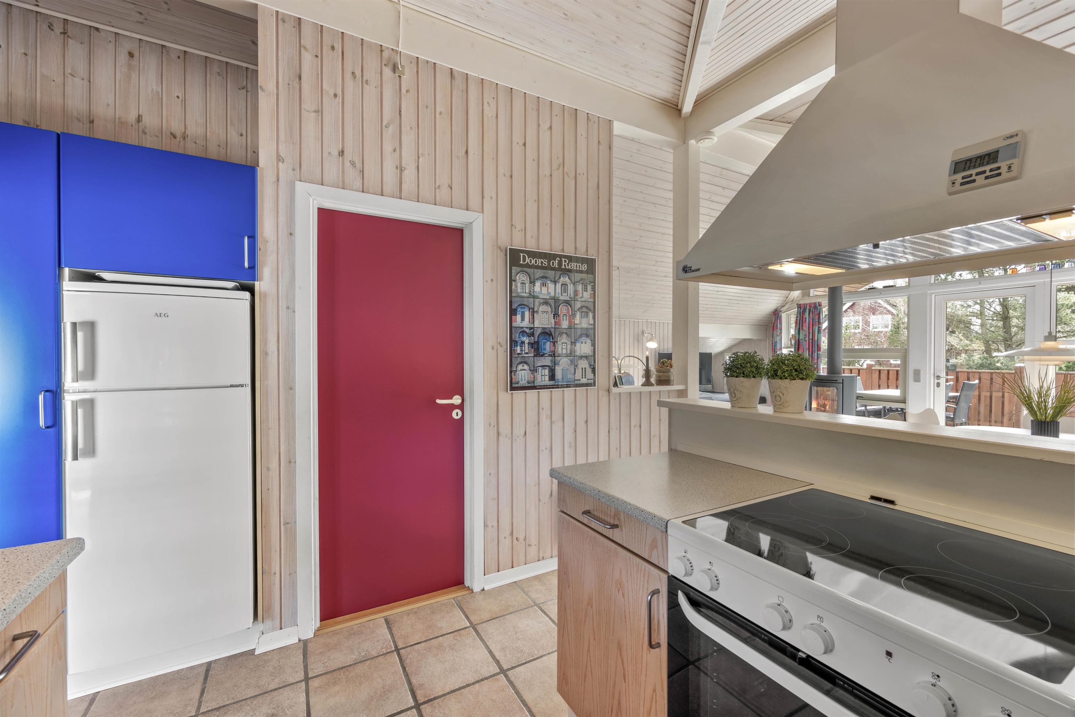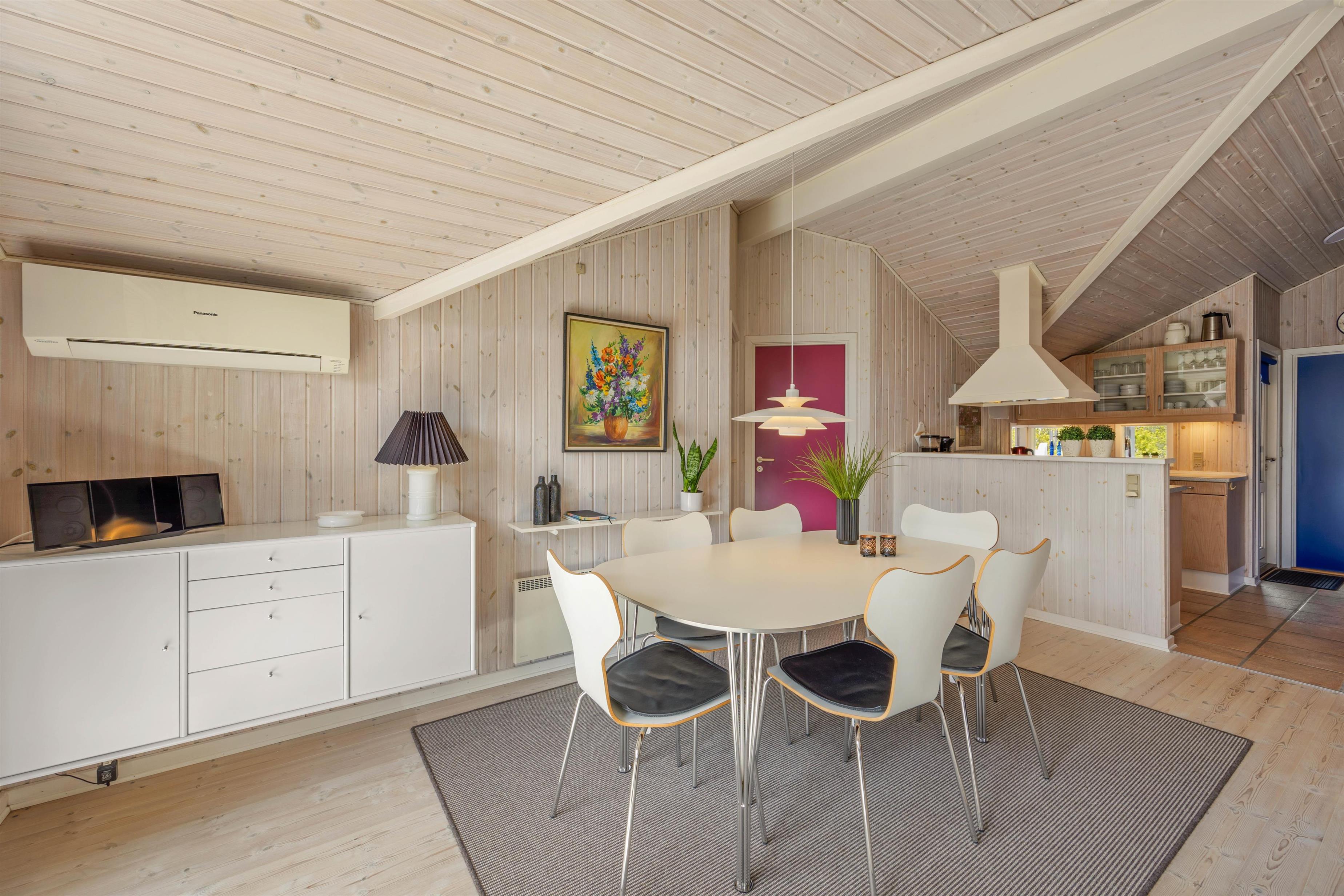 Det lille køkken, med gulvvarme, er åbent i forbindelse med spiseplads og sofagruppe. Her er alt, hvad I behøver for at tilberede lækre måltider, hygge jer foran brændeovnen ved spisebordet eller i sofaen med en god bog og en kop kaffe. Her er endda en alkove, hvis du får brug for et hvil midt på dagen. Sommerhusets mange vinkler og kroge i sammensætning med de lyse, træbeklædte vægge og lofter op i kip giver luft, hygge og feriestemning. På kølige dage eller mørke aftener er det nærliggende at tænde op i brændeovnen, lægge fødderne op og hygge sig sammen om et spil yatzy og et glas vin.