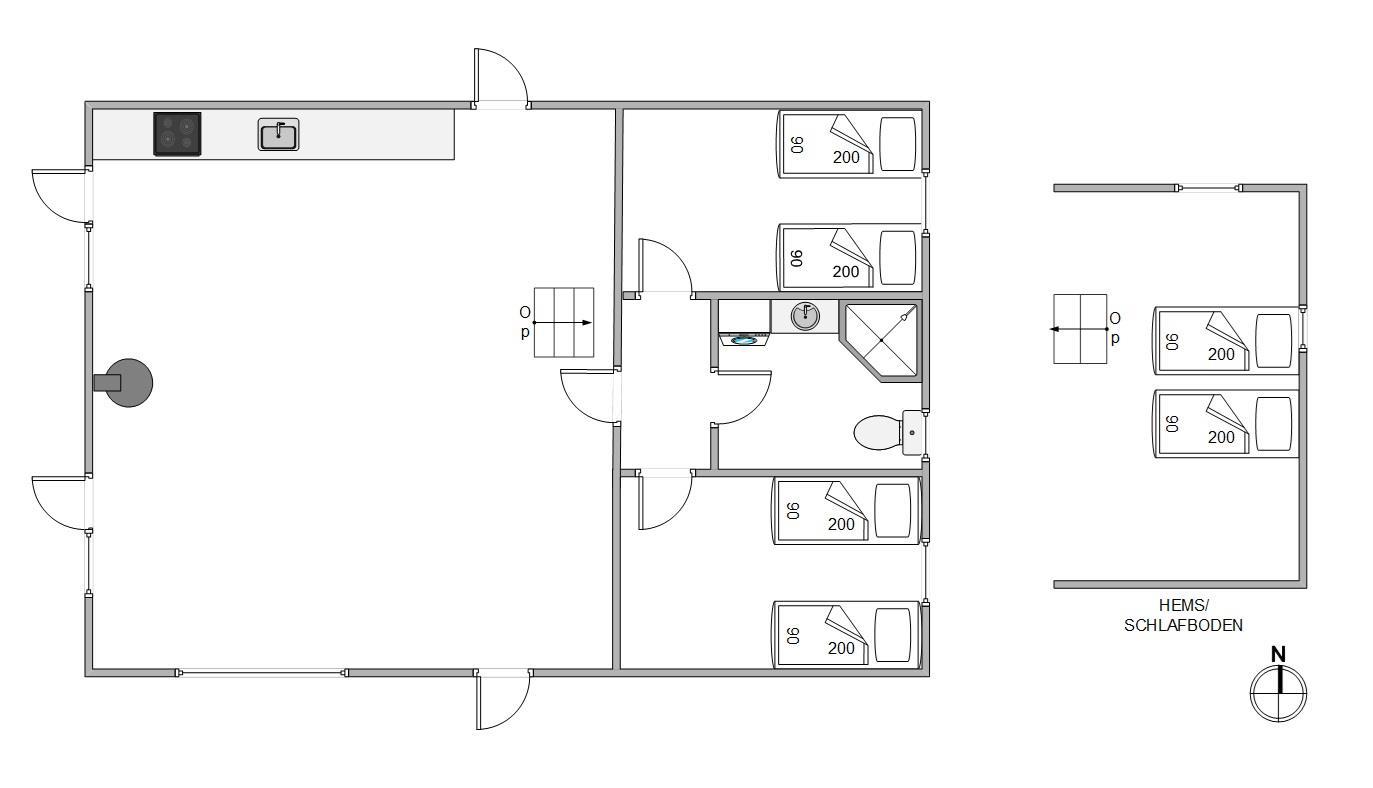 De 6 sovepladser er fordelt på 2 gode værelser samt en fin hems. Det ene værelse er indrettet med en dobbeltseng, mens det andet er indrettet med 2 enkeltsenge.