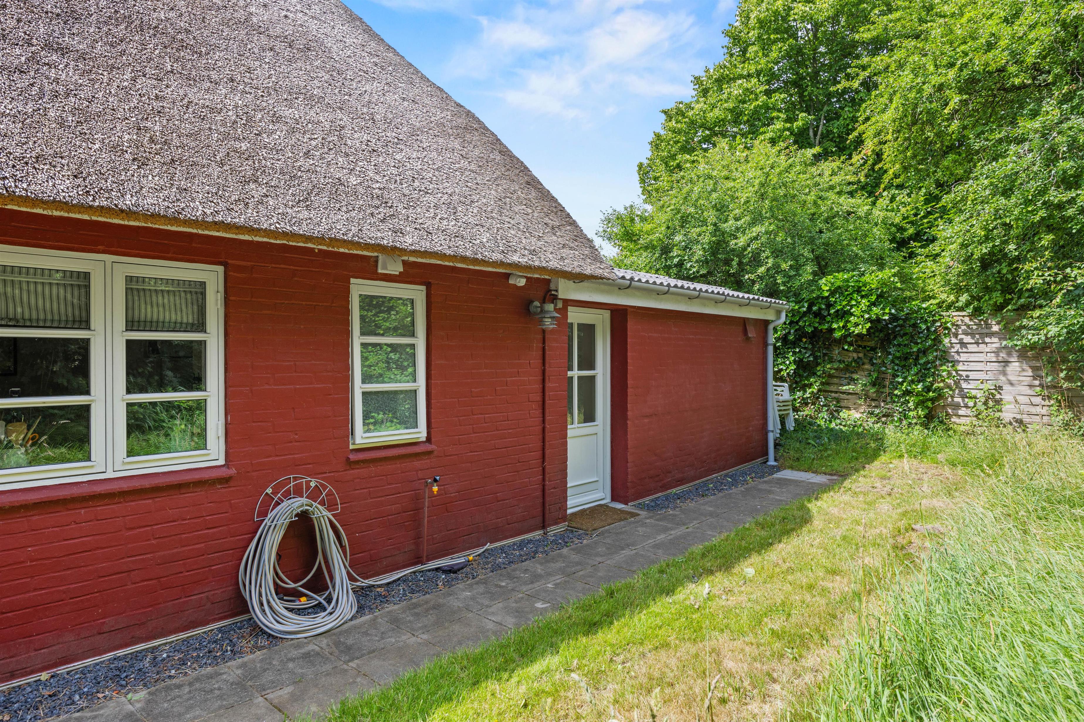 Sommerhuset ligger på en stor naturgrund og har en skøn terrasse, hvor I kan nyde solskinstimerne. Havemøblerne venter på jer! Slap af på solsengene, tag eftermiddagskaffen med udenfor eller sæt dig godt til rette med en god bog. Til aften kan I tænde op i gasgrillen, tilberede lækre sommerretter, der samler familien.
