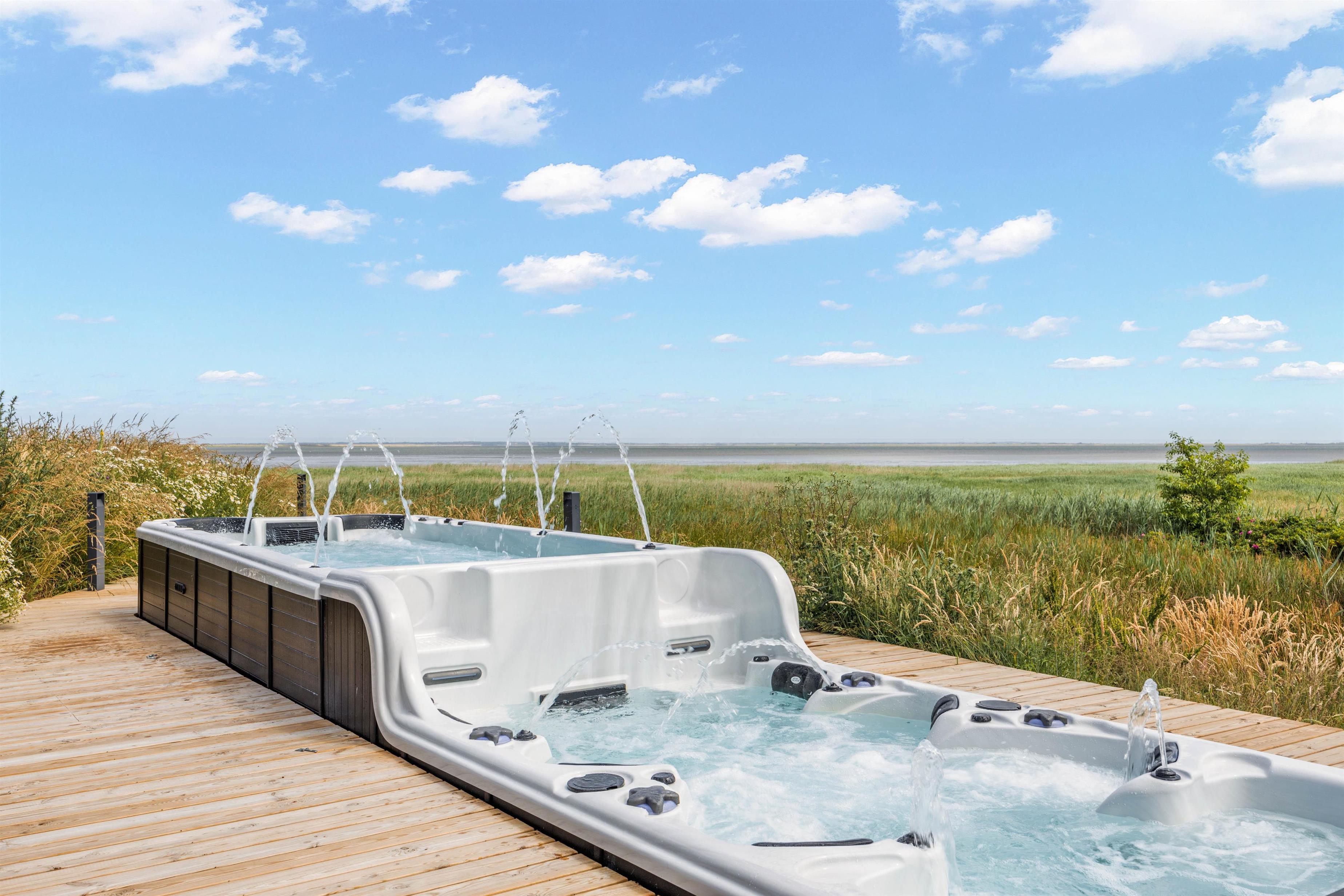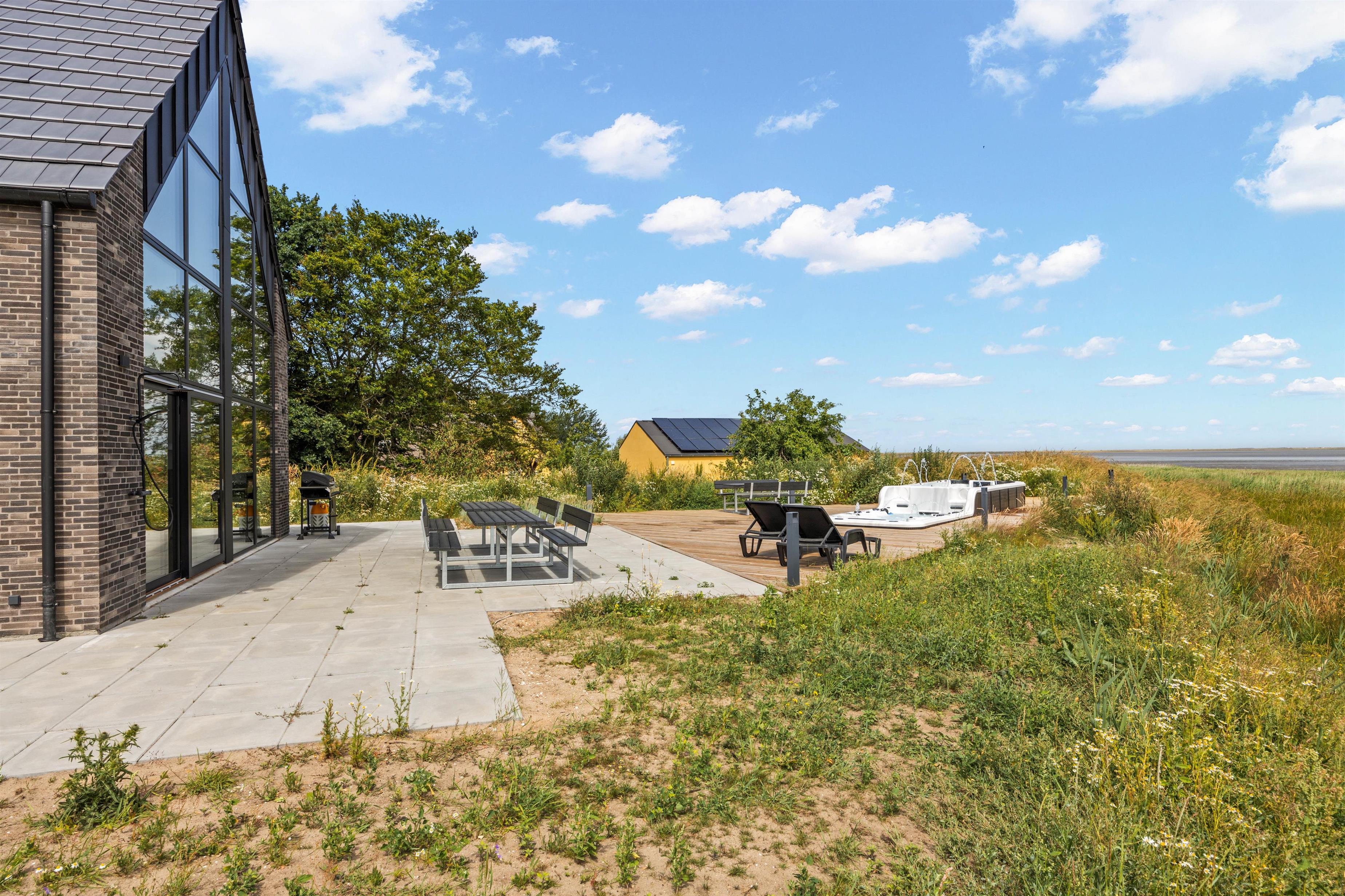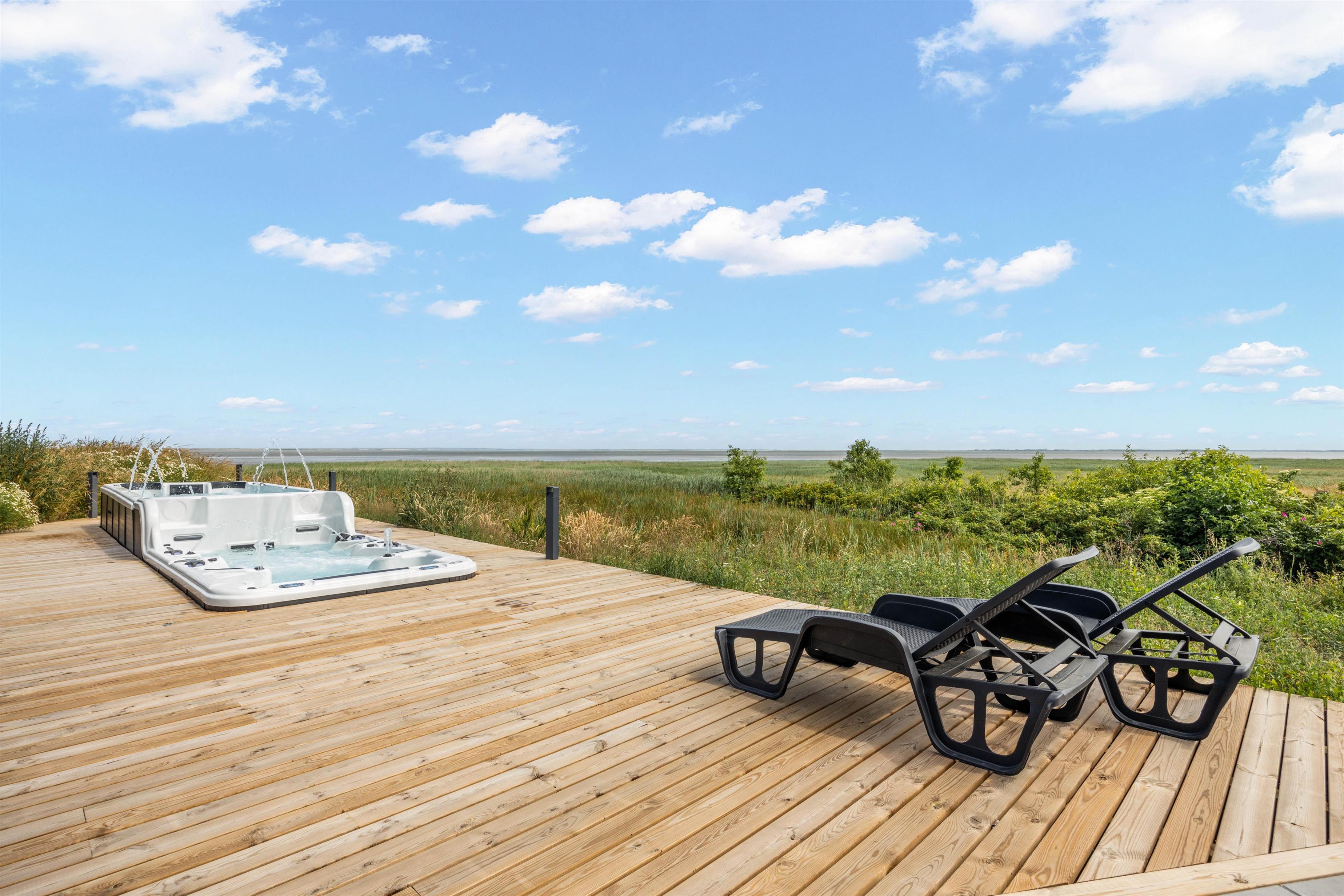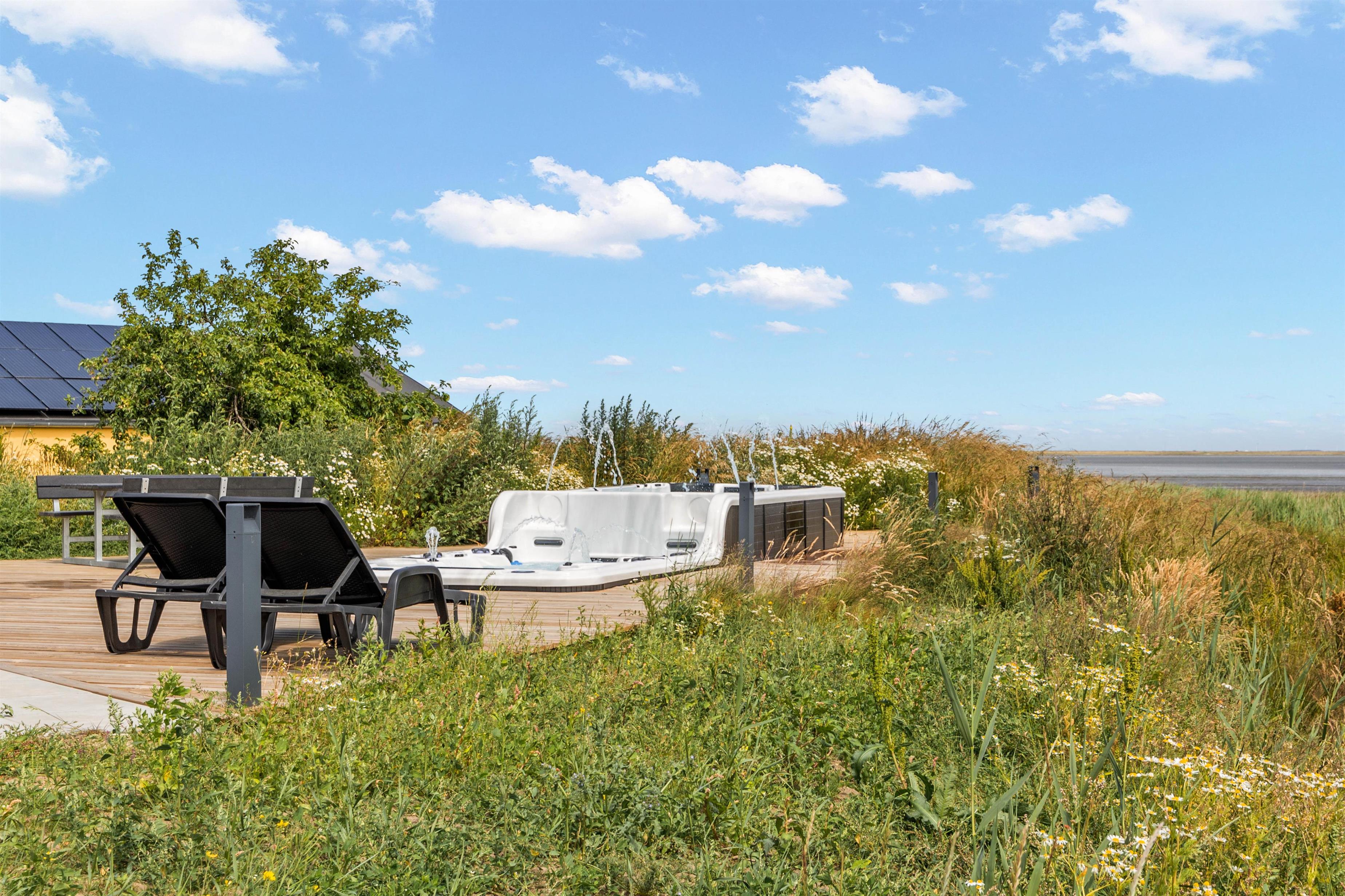 På den åbne terrasse kan I nyde solen og vesterhavsluften i de komfortable havemøbler og solvogne, imens I nyder udsigten til det glitrende vadehav. Hvis I har hund med, kan I tage den med på gåture langs stranden. Og I kan afholde en grillaften og derefter slappe af i udespaen. Som noget helt specielt har dette hus en svømmejacuzzi i forbindelse med udendørs 8 personers spabad - så der er både mulighed for ren afslapning og være aktiv i vandet. Feriehuset har også ladestik til din el-bil.